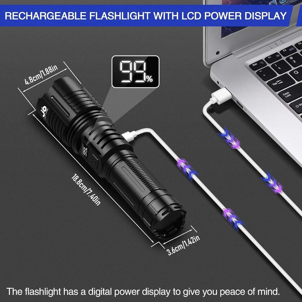 1000000 Lumen Zoomable Rechargeable Flashlight with Digital Power Display ‹ › ‹ › ‹ › ‹ › ‹ › ‹ › ‹ › ‹ › ‹ › ‹ › ‹ › 1000000 Lumen Zoomable Rechargeable Flashlight Illuminate your surroundings with unmatched brilliance and versatility. This extraordinary flashlight offers a staggering 1,000,000 lumens, providing both a penetrating spotlight that can beam over 1,800 meters on the darkest of nights, and a wide floodlight designed to effortlessly light up a campsite of up to 280 square meters. Key Features: High Brightness: Super bright LED technology for ultimate visibility. Rechargeable & Smart Display: An integrated LCD power display keeps you informed about the battery life in real time, ensuring you’re never caught off guard. Robust Waterproof Design: Engineered from thickened aviation-grade aluminum alloy with an IP67 waterproof rating, this flashlight is built to withstand drops from 10 feet and harsh weather conditions. Extended Battery Life: The upgraded high-capacity battery provides up to 4 hours of powerful illumination on high mode and all night on low mode. 5 Versatile Lighting Modes: Choose from strong, medium, low, strobe, and SOS modes to suit any situation. Quick Shut-Off Feature: Effortlessly turn off the flashlight with a single click after 10 seconds of use, skipping through modes for convenience. USB-C Charging with Power Bank Function: Charge your flashlight easily and use it as a power bank to recharge your mobile device on-the-go. Your Ideal Adventure Companion: Perfect for camping, hiking, and night-time emergencies, this flashlight is both an indispensable tool and a reliable companion for all your outdoor adventures. Customer Assurance: With every purchase, enjoy a 24-month warranty that guarantees quality and satisfaction. Should any questions arise, our dedicated support team is always at your service. Choose the ultimate power and versatility with the 1000000 Lumen Zoomable Rechargeable Flashlight. Illuminate your path, enhance your outdoor experience, and embrace the dark with confidence. Shipping Free & Fast Shipping - We offer free shipping to most of the USA with a normal delivery time of 3-7 days. However, due to the current situation, additional delivery time (up to 3 weeks) may be required for some items. Alternative Carriers - We may use alternative carriers (e.g. USPS, FedEx, UPS, etc.) to ensure your package arrives safely and on time. Due to the use of multiple carriers, we are unable to provide a tracking number automatically. Handling Time - Orders are processed and shipped within 1-2 business days of receiving cleared payment. Shipping Restrictions - Shipping to Alaska, Hawaii, Puerto Rico, Guam, and other US territories may incur shipping charges or delivery restrictions. Please contact us before ordering, or your order can be refunded/cancelled. State Restrictions - There may be restrictions based on your state of purchase. For example, certain items may not be shipped to California due to state regulations. Contact for Tracking Updates - If you require tracking updates or have any concerns about the delivery of your order, please feel free to contact us, and we will be happy to assist you. Return 30-Day Hassle-Free Returns - We want you to be completely satisfied with your purchase. If you are not, you can return the item within 30 days of receiving it for a full refund or exchange. Easy Return Process - To start a return, simply contact us and we will provide you with a prepaid return shipping label and detailed instructions. Restocking Fee - There are no restocking fees for returns. However, the buyer is responsible for return shipping costs if the return is not due to a seller's error. Refund Processing Time - Refunds will be processed within 5 business days of receiving the returned item in its original condition. Payment We accept all major credit cards, PayPal, and Apple Pay for your convenience. Your payment information is secure and encrypted to ensure a safe and seamless transaction. Please complete your payment within 3 days of purchase to avoid any delays in shipping. Feedback Your feedback is extremely important to us. We strive to provide the best products and customer service possible. If you are satisfied with your purchase, please take a moment to leave us a positive review. If you have any concerns or issues with your order, please contact us before leaving negative feedback. We are committed to resolving any problems and ensuring your satisfaction. Contact Us If you have any questions or concerns, please feel free to reach out to our customer support team. You can contact us through the eBay messaging system. We are available Monday to Friday, 9:00 am to 5:00 pm EST, and we will do our best to respond to your inquiry within 24 hours. Thank you for supporting our small family business! UPC: Not Set Voltage: 4.2 volts Item Height: Rechargeable LED Flashlights Item Length: Rechargeable LED Flashlights Item Weight: 0.9 pounds Item Width: Not Set Model: Not Set Lumens: 1000000 lumen Number of LEDs: Not Set Unit Quantity: 1 Features: Rechargeable,Waterproof,Digital Power Display,Zoomable,Multiple Lighting Modes,High Lumen Output Material: Aluminum Brand: Unbranded Type: Flashlight Lighting Technology: LED Power Source: Battery Operating Range: 1800 m MPN: Not Set Battery Technology: Lithium-Ion Number of Batteries: 1 Color: Black Country/Region of Manufacture: Not Set IP Rating: IP67 Operating Time: 4 Hours Number of Lights: 1 Unit Type: lb Personalize: Not Set