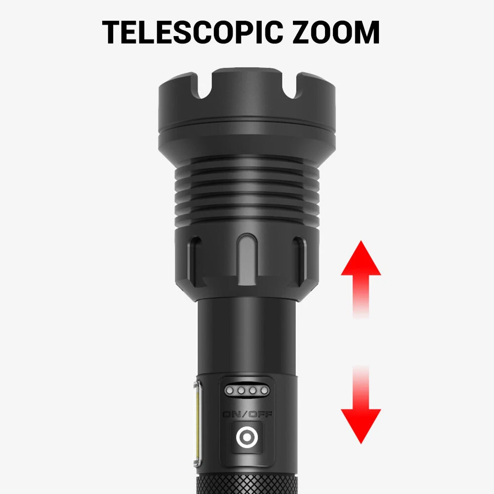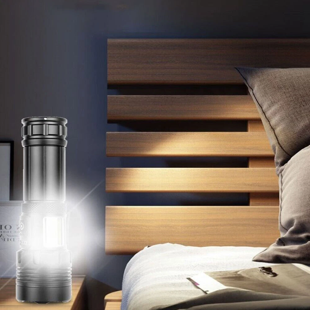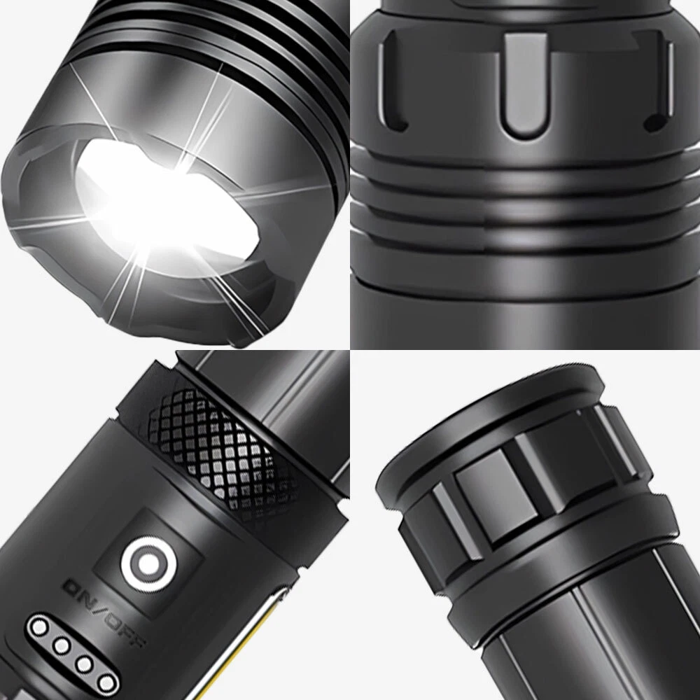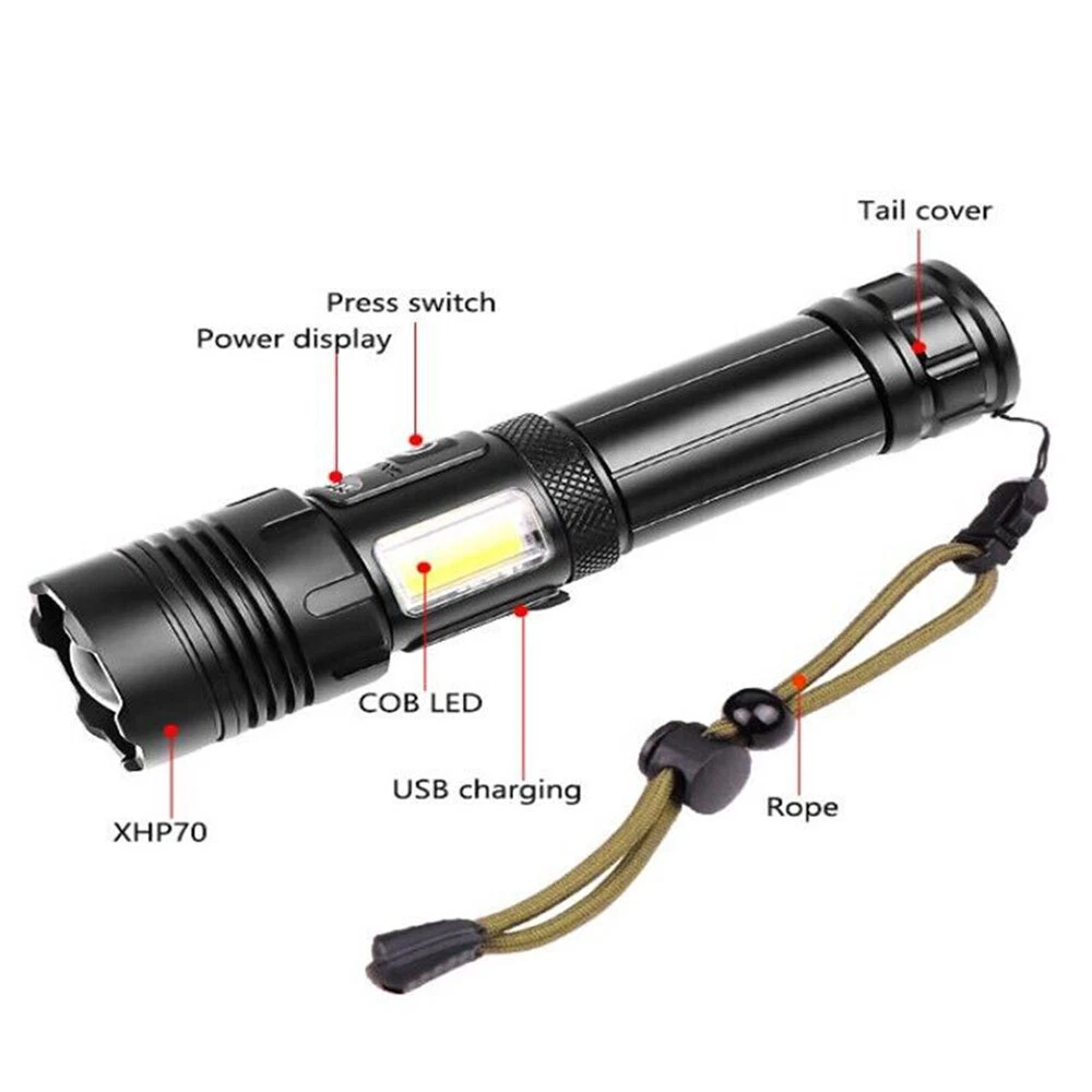 Feature: High Brightness & Long Distance Lighting: This white LED spotlight for long distance lighting is far different from ordinary torches, because it's much brighter than them with luminance of up to 1000000 Lumens, and its lighting range can reach about 3000 Meters, while others only have about 500 meters. 7 Gears: There are 7 work modes for you to switch freely, meeting your different requirements of lighting. COB Side Light: Double light source from different directions make the outdoor environment brighter and safer. More importantly, the COB side light can work as a red warning light. IPX5 Waterproof: Waterproof level up to IPX5 plus the flashlight body made of quality splash-proof aluminum alloy ensure that it can be used in rains, suitable for outdoors. Specification: Type: LED Flashlight Material: aluminum alloy Battery Life (Bright light): 4-8 hours Charging Method: Type-C Waterproof Grade: IPX5 Size: 17*4.3*3.5cm Gears: 7 gears (strong light, medium light, flash light, cob strong light, cob weak light, cob red light, cob red flash light, double click the button to turn on cob light) Fixed Focus: telescopic ZOOM Conversion Method: button Package Include: 1 x LED Flashlight 1 x Type-C Cable 1 x Built-in Battery