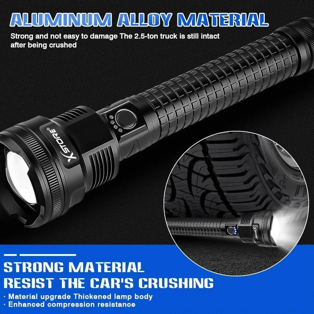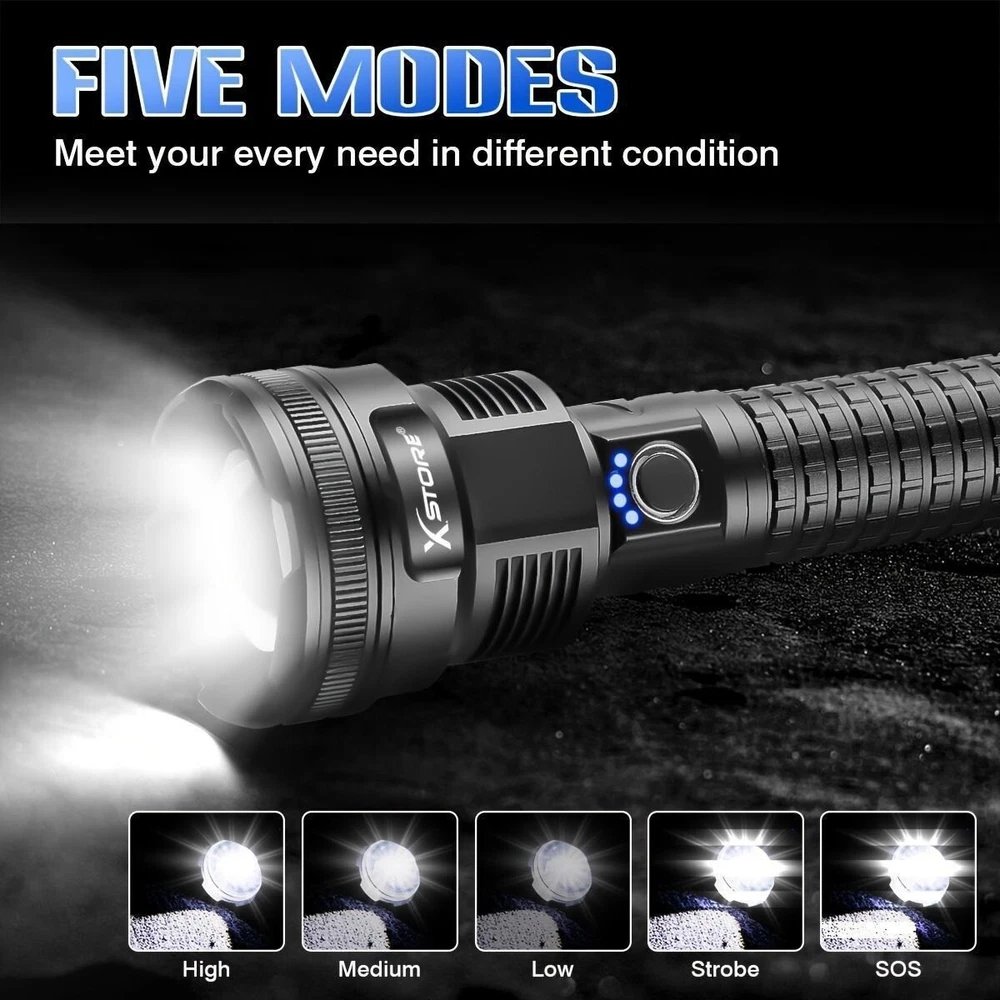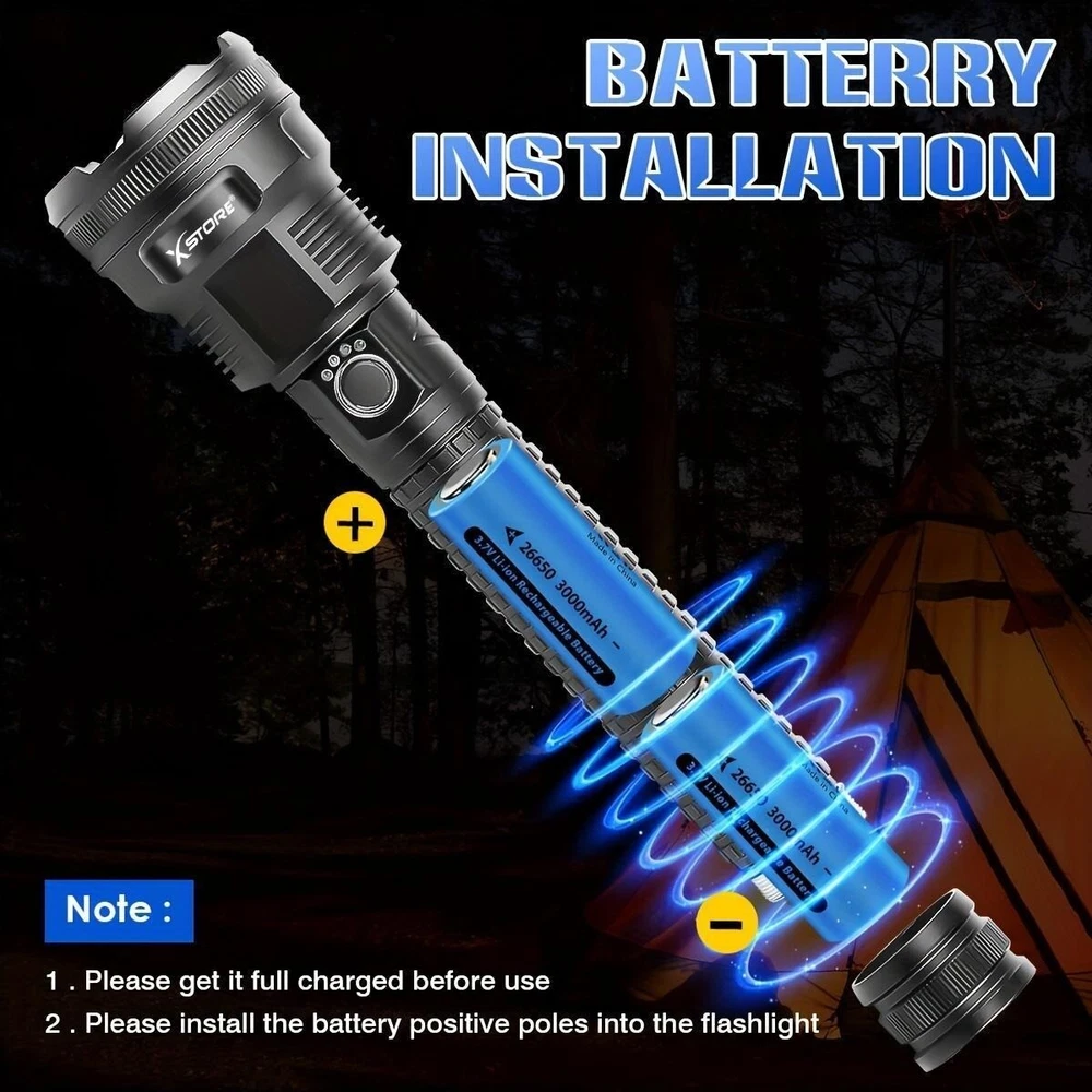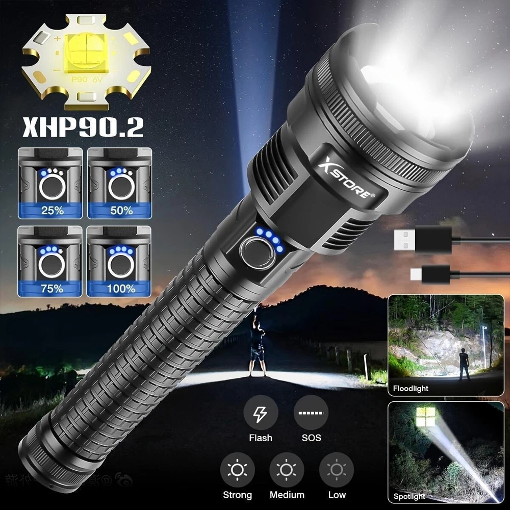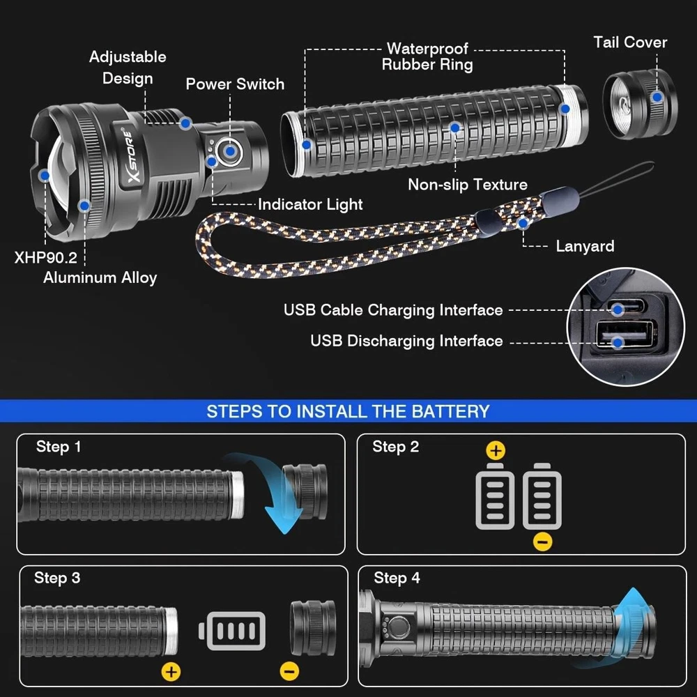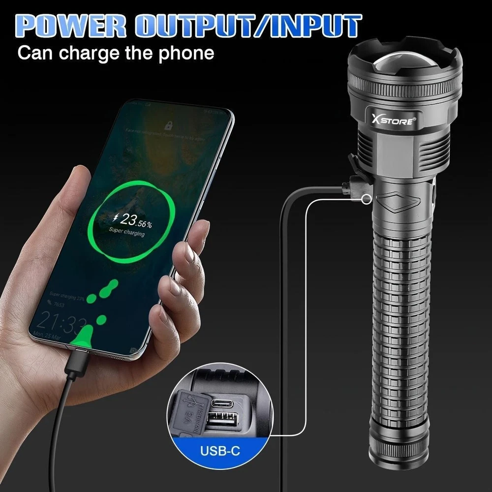 Product Description: Lamp beads: XHP90 5 modes: high/medium/low/strobe/SOS (any gear can be long-pressed for 3 seconds to switch off) Lumen: 2000LM Power: 50W Colour: Black Light colour: white Middle button switch Material: aluminium alloy Adjustable focus: Yes Size: as shown in the picture Lighting distance: about 200-1000 metres Power supply: 2 sections of 26650 or 2 sections of 18650 can be connected in parallel or series, battery capacity 5000mah Function: Micro USB Charge / Output: 5V/1-2A Can live waterproof (can be used in rainy days), but can not be used for diving, and can not be immersed in water. Battery model 26650 Current: 0.5A Voltage: 3.7V Power: 8 Capacity: 2200mah About Maintenance 1. Keep it away from high temperature and high humidity, avoid external collision and extrusion. 2. If it is stored for a long time and not used, it should be kept at 50% -60% of the power status. It should be charged once a month and fully charged and discharged every three months. Features: *5 lighting modes and tactical zoom function: the torch as a powerful multi-functional torch, with strong / medium light / low light / strobe / SOS 5 lighting modes, also has excellent tactical telescopic zoom function (zoom in and zoom out), you can according to their needs to choose the appropriate lighting mode and function, in case of emergency, you can use as a back-up power supply or use the SOS mode flash for help! *Rechargeable torch and power indicator: the rechargeable torch is powered by 2*26650 batteries. Built-in Type-C input port is convenient for you to charge the torch. In addition, the rechargeable torch has a 25%/50%/75%/100% power display, so you can see the power level at a glance, and it has circuit protections, such as overcharge protection, short circuit protection, etc., so that the handheld flashlight has a longer service life. *This super bright torch can also be used as a mobile power source to charge your mobile phone in case of emergency. Package Includes: 1x Strong light torch 2x Rechargeable 26650 Batteries 1x USB-C cable 1x Product Manual