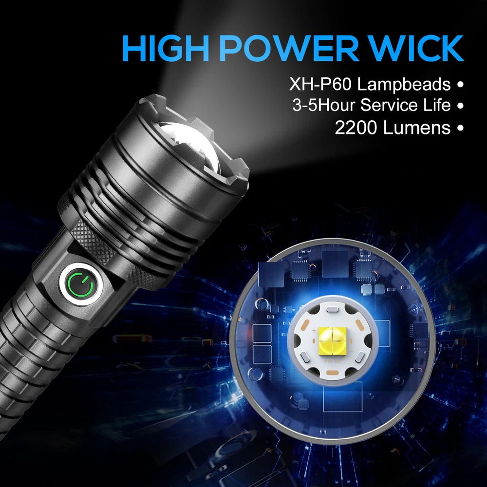 1000000LM Super Bright LED Flashlight Rechargeable USB XHP60 Torch Zoom 3 Modes Not Include battery!!! Not Include charger!!! LED Flashlight Features: XHP60 Led Flashlight 3 Light Working Modes Smart Indicating System Using advanced LED chip. XHP60 LED flashlight is brighter than other flashlight and easily lights up your entire back yard, never lets you caught in the dark.Light your way forward. Simple and Classic.Simply zooming this flashlight in or out for a spot light or as flood light; It features only 3 light modes (High / Low / Strobe) which effectively reduces the trouble of switching 5 modes. All for the best using experience! Smart charging status indicator , when the battery is charging, the LED indicator is RED, after fully charged, the indicator turns GREEN,Micro usb for laptop, power bank, plus socket, computer Zoomable & Ajustable Focus IPX65 Waterproof Widely Application Adjustable Focus by zoom in and zoom out the flashlight. Zoom in the flashlight can get more wider beam and bright wider area.Zoom out the flashlight can get narrow beam and bright further. Pocket-friendly, 5.94in x 1.65in (L x D), 6.0 ounces; Anti-slip knurling and wrist strap enable a firm grip in your hand IPX65 waterproof rating can protect your torch against splashing water from all angles This is the best flashlight tool for working, fishing, camping and outdoor activity etc. Come with Strobe Light and SOS function light, suitable for emergencies, power failure, circuit maintenance car breakdowns. Specification: Type LED Flashlight Rechargeable USB Product color Black Material Aluminum alloy Gear 3 modes (strong-weak-flash) Power Source 1*3.7v rechargeable battery(not include) Charging mode Take out the battery for external charging, or charge with USB Type-C data cable Zoom Telescopic zoom Note: Battery is not included!!! Package Includes: 1 x LED Flashlight USB Rechargeable (Without Batteries) On Jan 18, 2025 at 02:02:21 PST, seller added the following information: