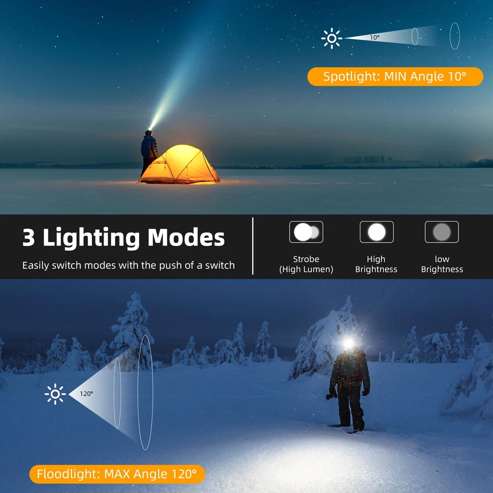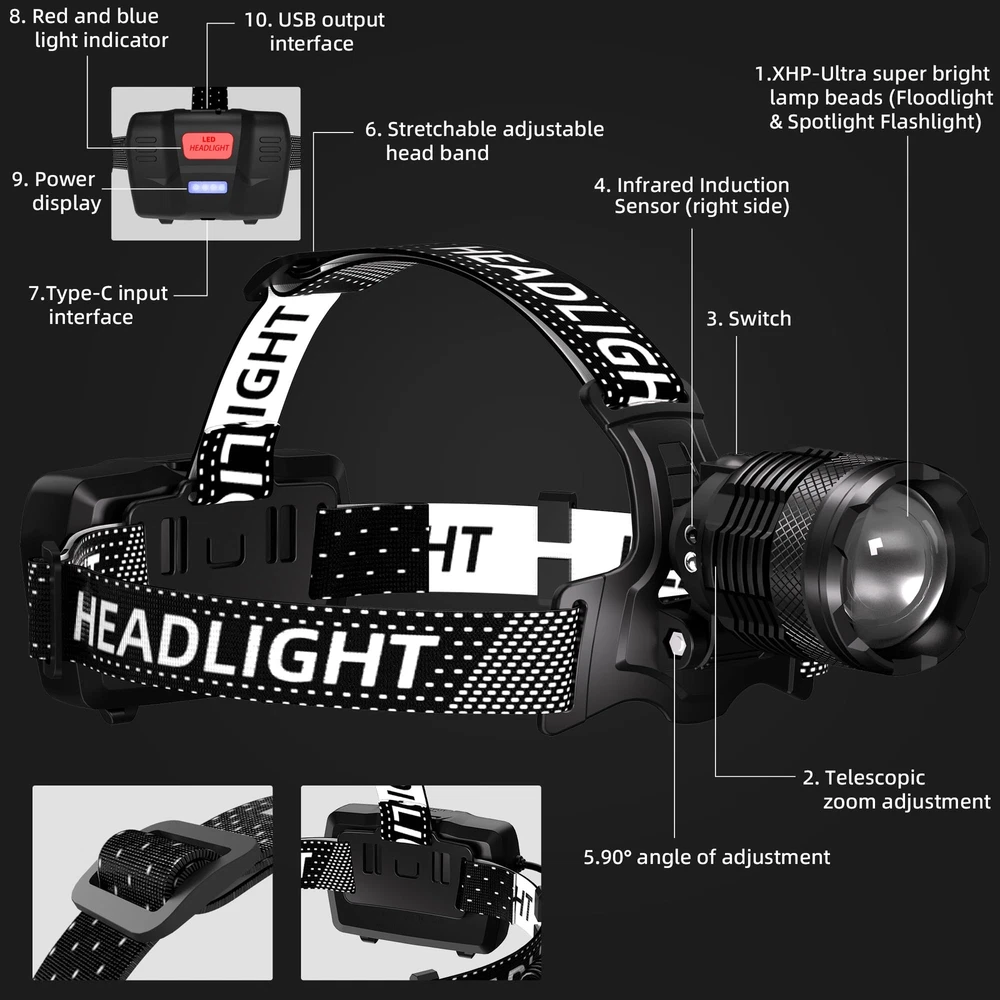 100000LM High Brightness: Adopting the latest XHP-Ultra LED lamp beads in 2023, the 50W high-power lamp beads emit amazingly high brightness, which can even illuminate the darkest corners. Whether you're embarking on a challenging outdoor expedition or navigating through dimly lit environments, this headlamp's intense luminosity ensures optimal visibility and safety. Upgrade Aviation Aluminum Material: Crafted with precision and durability in mind, the headlamp boasts an upgraded construction featuring aviation aluminum material. This enhancement not only reinforces its structural integrity but also enhances heat dispersion, ensuring optimal performance even in extended usage scenarios. The utilization of aviation aluminum material underscores a commitment to quality, making this headlamp a robust companion in various situations. 40H Long Battery Life: 3*3000mAh batteries to power your adventures, providing an amazing 40 hours of uninterrupted lighting in energy saving mode (8-10 hours in high brightness mode). Say goodbye to constant battery changes and extend your usage time so you can focus on your adventures without interruption. Excellent battery life ensures a reliable source of light during long outdoor trips or difficult tasks, reaffirming the reliability of headlight for head. 3 Lighting Modes & Spotlight/Floodlight Switch: Energy saving mode, high brightness mode and strobe mode, you can choose different lighting modes according to different scenes. And the lighting range can be adjusted through the lens, whether you need a spotlight or a floodlight, this headlamp can meet your needs, improve your efficiency and provide convenience. User-Friendly Design: Long press the switch for 3S to turn on the induction mode, and you can easily control the headlamp on/off with just a wave of your hand. The headlamp prioritizes comfort during prolonged use, and we have used a highly elastic, detachable, and washable headband. Elasticity ensures a snug fit and prevents discomfort during prolonged wear, while the detachable and washable design ensures long-lasting cleaning. Multi-Scene Adaptable Rechargeable Headlamp: Whether you are camping under the stars, embarking on a thrilling night hunting expedition, or hiking through a dense forest, this headlamp is your reliable guide. With its versatility and wide applicability, the headlight is more than just a lighting device, it is a reliable companion for any adventure or mission, lighting your way to success! Package List & After-Sales: Rechargeable led headlamp*2, type-c cable*2, instruction manual*2, hard hat clips*12, 3000mAh battery*6. If any accessories are missing, you can ask us for a replacement. And we provide up to 3 years of after-sales service (such as head lamp failure, battery aging or headband breakage, etc), and we will solve any after-sales problems that occur due to non-human reasons.