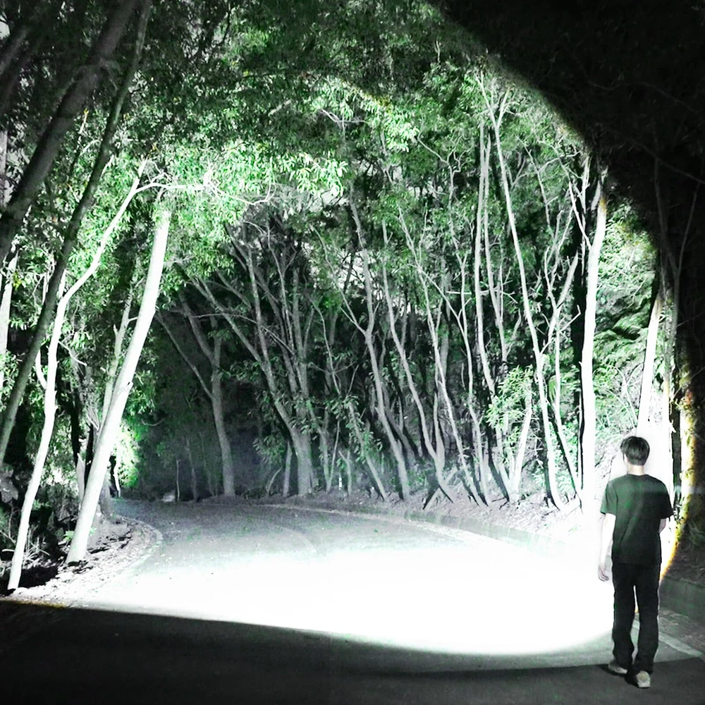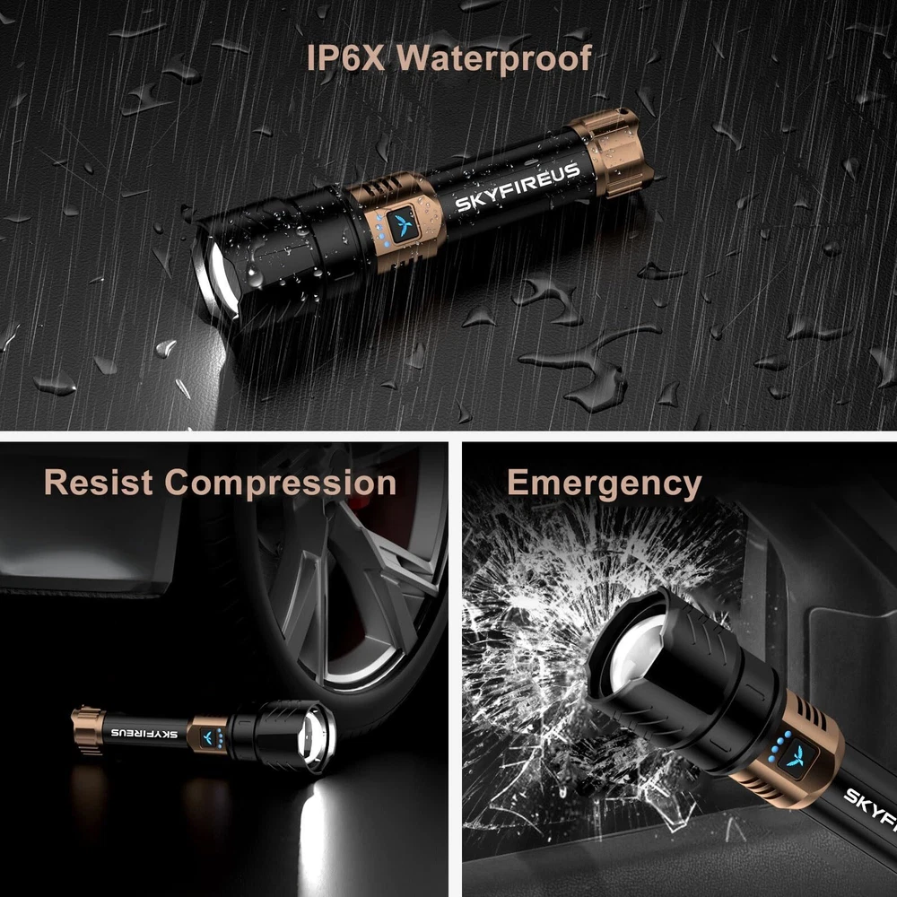High-Lumen LED Flashlight and Zoomable: Experience exceptional brightness with super bright flashlight, delivering an impressive 10,000lumens. Its adjustable zoom function by Stretch Flashlight Handle allows you to switch between spotlight and floodlight, can illuminate objects up to 5,000 feet away or cover an area as large as two football fields. Perfect for home use, outdoor adventures,camping essentials Type-C Charging,Output Function and Long Lasting: The rechargeable flashlight features fast Type-C charging and reverse charging to power your devices in special circumstances, and can be charged by connecting to any adapter by our USB connector. It comes with 5000mAh lithium batteries that provide up to 16 hours of use and includes a convenient Battery Level Indicator to keep you informed of remaining power Four Adjustable Modes and Smart Switch: The flashlight with smart chip has an intuitive on/off switch that turns off with a single click after being on for more than 10 seconds,long press to activate the strobe mode. Featuring four versatile modes—Low, Medium, High, Strobe 🔥How to Focus Ignition: Equipped with a unique focus lens by patent design in package, our camping flashlight can be used for emergency tool outdoor. Usage:1.Place the lens on the head of the flashlight and rotate it to combine with the flashlight; 2.Stretch handle and press switch 3.Ignite the item at a distance of 2cm/0.78in-3cm/1.15in from the top of the flashlight; 4.Wait less than 1 minute to ignite. Note: Remove the focus lens and retraction handle for store after ignition Durable, Waterproof and Portable: Made from high-quality aluminum alloy, the flashlight withstands drops from up to 1.2 meters and is water-resistant. It features a built-in emergency tool and comes with a convenient lanyard for easy carrying, making it reliable in heavy rain and harsh conditions for both home and outdoor use Quality Guaran-tee and Packaging: Enjoy peace of mind with an one-year warran_ty on this LED flashlight. The package includes a flashlight, a tactical lanyard, a lithium battery, a charging cable, a focus head in a gift box. For any issue or question, we supply 24 hours cu_stomer ser_vice, ensuring your complete satisfaction