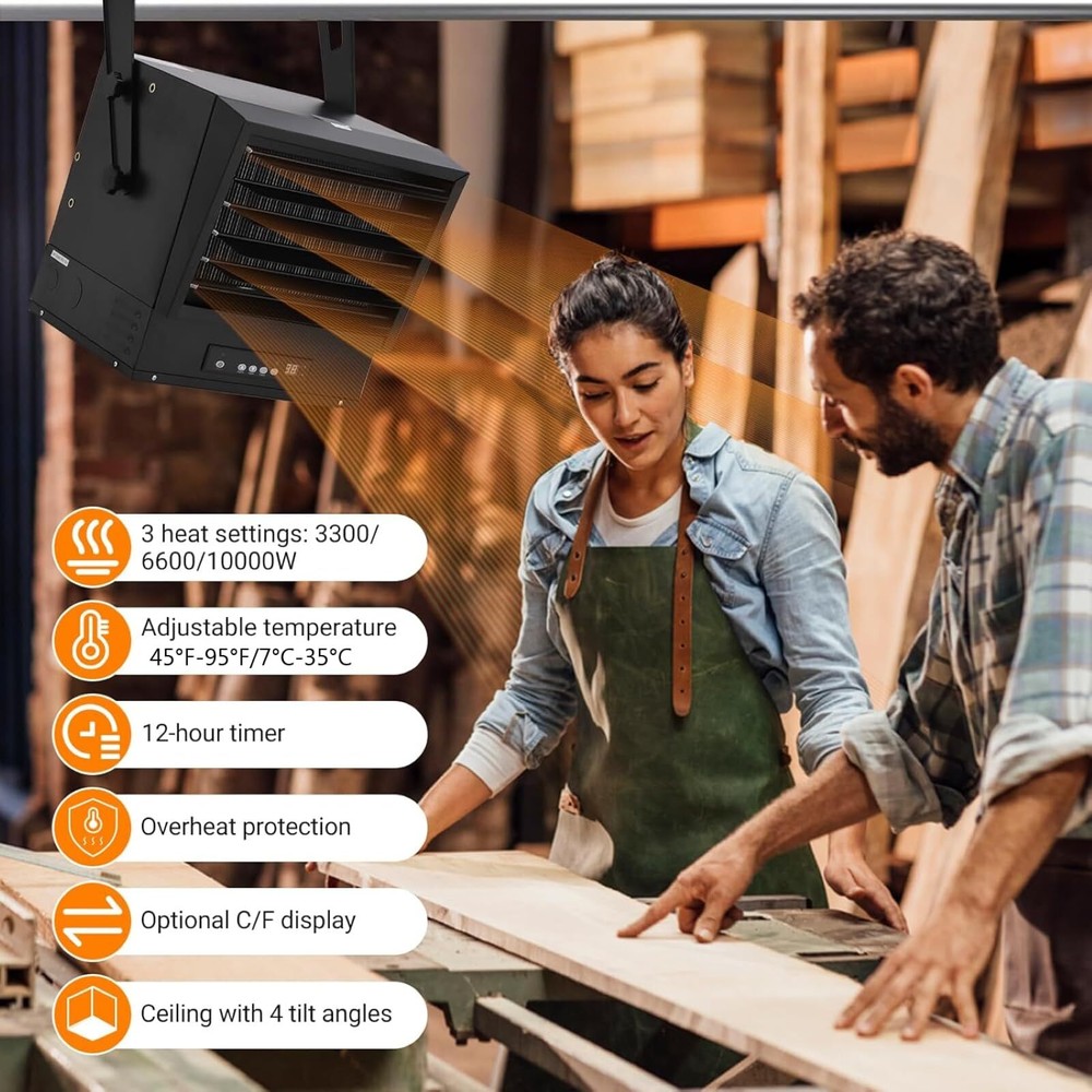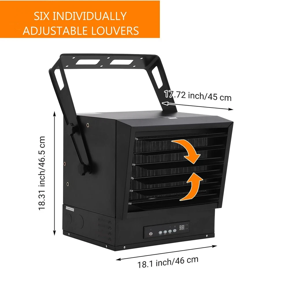 Efficient Heat Powerful Output: This 10000W garage heater has adjustable louvers and variable mounting angle to direct the air output. Its maximum BTUs of 34,120 is powerful enough to heat a large area up to 1,500 square feet.The included 12-hour timer allows you to program the heater to automatically turn on or off according to your schedule, providing convenience and energy efficiency. The remote control enables changes from a distance, giving you the freedom to fine-tune the temperature. Precise Temperature Control: Our 240V garage heater is equipped with a built-in thermostat. You can adjust the power to suit your needs and preferences 45°F-95°F/7°C-35°C, (10,000W 34,120BTU). Power ranges from low to high of 3300/6600/10000W to meet your different needs And a built-in sensor switches the device off automatically if it overheats. Durable Design Build: Built to withstand demanding environments, the industrial heater features a heavy-gauge steel body that ensures long-lasting durability and reliability. The heating elements are fully sheathed, providing enhanced safety and protection. Additionally, the motor is enclosed, safeguarding it against dust and debris, making it ideal for use in dusty environments. consistent and efficient heating performance. Safe Sturdy Build: Constructed with high-quality heavy gauge steel, the body of this commercial heater is built to withstand the challenging conditions of poorly insulated areas. Its durable steel construction ensures reliable performance even in environments with temperature fluctuations. By utilizing heavy gauge steel, this heater offers enhanced durability and longevity, making it a reliable heating solution for commercial spaces. Ceiling Mount Installation: Designed for easy ceiling mounting, this heater includes an adjustable mounting bracket that allows for precise positioning to suit your needs. The built-in sensor monitors the temperature and automatically shuts off the device if it detects overheating, With its convenient design and straightforward installation process, you can effortlessly integrate this heater into your space for efficient and effective heating. Note 1:This heater does not come with a power cord. Note 2: We RECOMMEND you hire a professional electrician to do this safely. The garage heater must be grounded and hardwired to a properly sized current protection circuit breaker in accordance with the (US) National Electric Code and local codes. The heater must be grounded. Heater circuit must be protected with proper fuses. Product Description 10,000W Hard-Wired Ceiling Mount Garage Space Heater Just enjoy the warmth and comfortable in winter 10,000 WATT HEATER WITH REMOTE Take full control of your comfort with the integrated digital thermostat control of the 10,000-watt space heater. Set the optimum temperature for efficient heat output with ease, ensuring a cozy and warm environment. The included 12-hour timer allows you to program the heater to automatically turn on or off according to your schedule, providing convenience and energy efficiency. The remote control enables changes from a distance. Special Feature: Digital Display, On Off Timer, Adjustable Temperature, Electronic Thermostat, Fast Heating Heating Coverage:1500 sq. ft. Thermostat: 45°F to 95°F (7°C to 35°C) Timer Function: 12H Timer Amperage: 41.67 Amps Fuel Type: Electric Power Source: Hard-Wired Heating Method: Forced Air Safe & Sturdy Structure The garage heater is made of heavy-duty steel material, this heater offers enhanced durability and longevity. Ceiling Mounting Instructions You can manually adjust the louvers and variable mounting angle as needed to direct the warm air to where it is needed. Wide Area Heating Its maximum BTUs of 34,120 is powerful enough to heat a large area up to Heating Coverage1500 sq. ft. Power ranges from low to high, 3300/6600/10000W to meet your different needs in cold days. Hardwired Installation Need to be hardwired into your electrical network with 240V AC single phase. The heater should remain at least 3 feet away from all combustible materials such as furniture, curtains, etc. as well as at least 8" away from walls. The heater is to be installed indoors only on a stable, non-combustible surface. Thermostat & Overheat Protection You can adjust the thermostat to suit your needs 45°F to 95°F / 7°C to 35°C (The thermostat is next to the air intake and it reads the temperature up near the ceiling. So you need to set it higher than the desired temperature). ECO Mode & 12 HoursTimer With a built-in precise temperature sensor, the smart ECO mode automatically adjusts the working mode or turns off based on the ambient temperature. You can also set an auto-off timer (1-12 hours) to save on energy bills. Payment Delivery details Terms of sales About us Contact us Payment We accept payment either via PayPal or any of the following credit cards; Visa, MasterCard, Discover, and American Express. Wishing you a happy life! Delivery details We will provide you with the tracking number on the same day or the next day, and transport your package through UPS, DHL, FedEx and other courier methods. If you have any questions, please feel free to contact me and I will do my best to help you solve the problem. Wishing you a happy life! Terms of sales We offer a one month free return and exchange service, and you don't have to bear any losses. We will provide multiple solutions for you to choose from. If you have any questions, please feel free to contact me and I will do my best to help you solve them. We offer a two-year warranty period. If you have any quality issues with the product you purchased within two years, please feel free to contact me. I will provide you with a free replacement service. If you have any questions, please feel free to contact me. I will do my best to help you solve the problem. Wishing you a happy life! About us We are committed to becoming the best eBay seller, with high-quality suppliers, provid