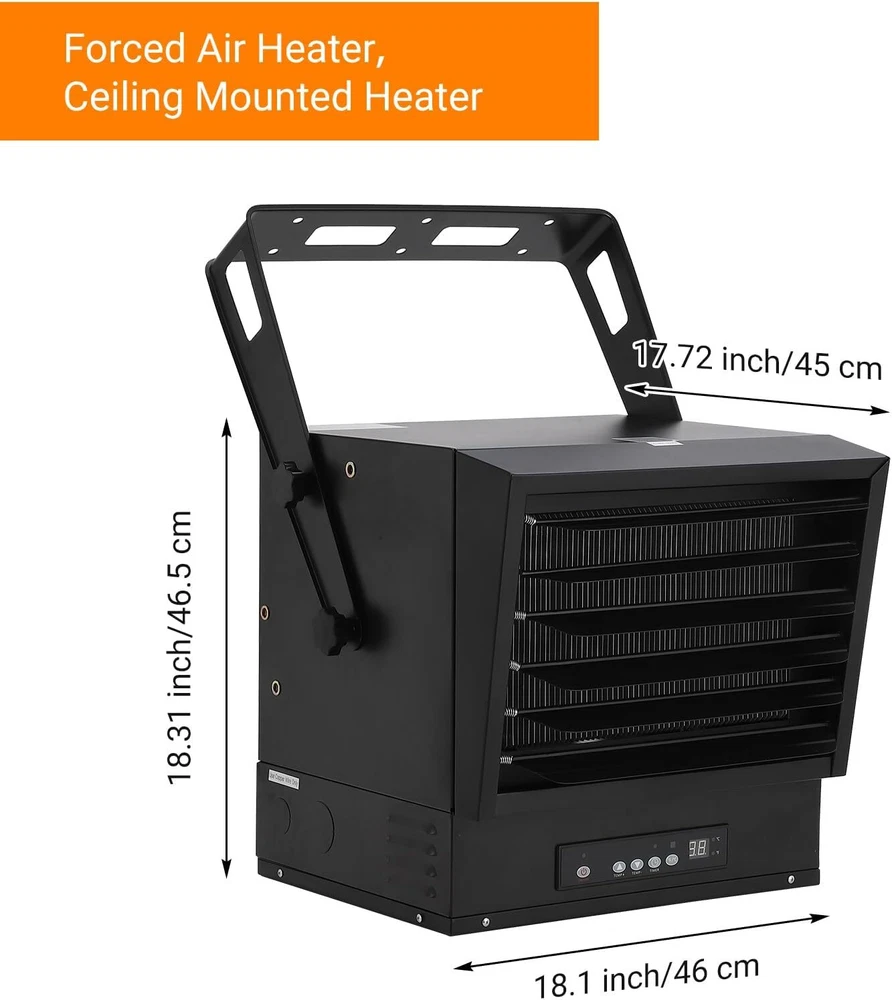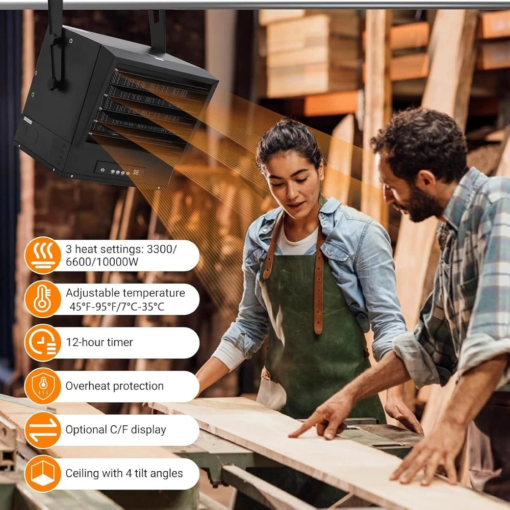 Specifications: Special Feature:Overheat Protection Form Factor:Cabinet Color:Black Power Source:AC Heating Method:Forced Air Heat Output:34120 BTU Power Range:3300/6600/10000W Voltage:240V Material:Steel Features: Efficient Heat Powerful Output: This 10000W garage heater has adjustable louvers and variable mounting angle to direct the air output. Its maximum BTUs of 34,120 is powerful enough to heat a large area up to 1,500 square feet. The included 12-hour timer allows you to program the heater to automatically turn on or off according to your schedule, The remote control enables changes from a distance, providing convenience and energy efficiency. Safe Sturdy Build: Constructed with high-quality heavy gauge steel, it is built to withstand the challenging conditions of poorly insulated areas. Its durable steel construction ensures reliable performance even in environments with temperature fluctuations. this heater offers enhanced durability and longevity, making it a reliable heating solution for commercial spaces. Precise Temperature Control: Our 240V garage heater is equipped with a built-in thermostat. You can adjust the power to suit your needs and preferences 7-35℃/45-95℉.Power ranges from low to high of 3300/6600/10000W to meet your different needs. Durable Design Build: Built to withstand demanding environments, features a heavy-gauge steel body and the heating elements are fully sheathed, providing enhanced safety and protection. Additionally, the motor is enclosed, safeguarding it against dust and debris, making it ideal for use in dusty environments. Ceiling Mount Installation: Designed for easy ceiling mounting, this heater includes an adjustable mounting bracket that allows for precise positioning to suit your needs. The built-in sensor monitors the temperature and automatically shuts off the device if it detects overheating, With its convenient design and straightforward installation process, you can integrate this heater into your space for efficient heating. Payment Delivery Returns Feedback We accept Payoneer only. All major credit cards are accepted through secure payment processor PayPal. Payment must be received within 7 business days of auction closing. If you have bought multiple items from me, you can send me one payment for all the items instead of paying for them individually. When you click the Pay Now button, eBay will automatically determine if there are other items you have won or purchased from me and will combine them for your review. NOTE: Import duties, taxes and chargers are not included in the item price or shipping charges. These charges are the buyer's responsibility. Please check with your country's customs office to determine what these additional costs will be prior to bidding buying. 1. We will delivery out at the handing time when we receive the payment. 2. The delivery time is 3-5 business days to US by usually time.The parcel maybe delay 1-2day of the weekend.Due to the bad weather,Holidays,Hot Season ect.the parcel maybe delay,If you have any problems,mssage us,we will try our best to solve it. 3. We ship to your eBay address. Please make sure your eBay address is correct before you pay. 4. If you want to change the shipping address,message us before our send out. 5. We cannot deliver your order if your state is PR. 1. If you donot receive the items at the delivery time,the parcel has broken/missing,Please message us before you open case/return,we will try our best to solve it. 2. We offer a 30 day return policy from checkout winning date. 3. An RMA number is required for all returns. Message us for return instructions. Items Returned without a RMA number will not be processed. 4. Items defective upon receipt must be packaged in their retail packaging as if new and returned with a detailed description of the problem. 5. Return shipping fees are not refundable.We reserve the right to decline any returns if the above guidelines are not followed. If you are not satisfied with the item for any reason, please do not quick to leave negative/neutral feedback even open request and case without any communication with us. We devote ourselves making EVERY CUSTOMER in 100% Satisfactory and resolve any problem. Thank you for your understanding and recognition,we are always leave positive feedback to all our customers. About Reply: All replies will be sent to your email box, if you do not get response within 24 hours (Sat. & Sun. excluded) please check your eBay My Messages in case that our emails will be filtered automatically by your settings.