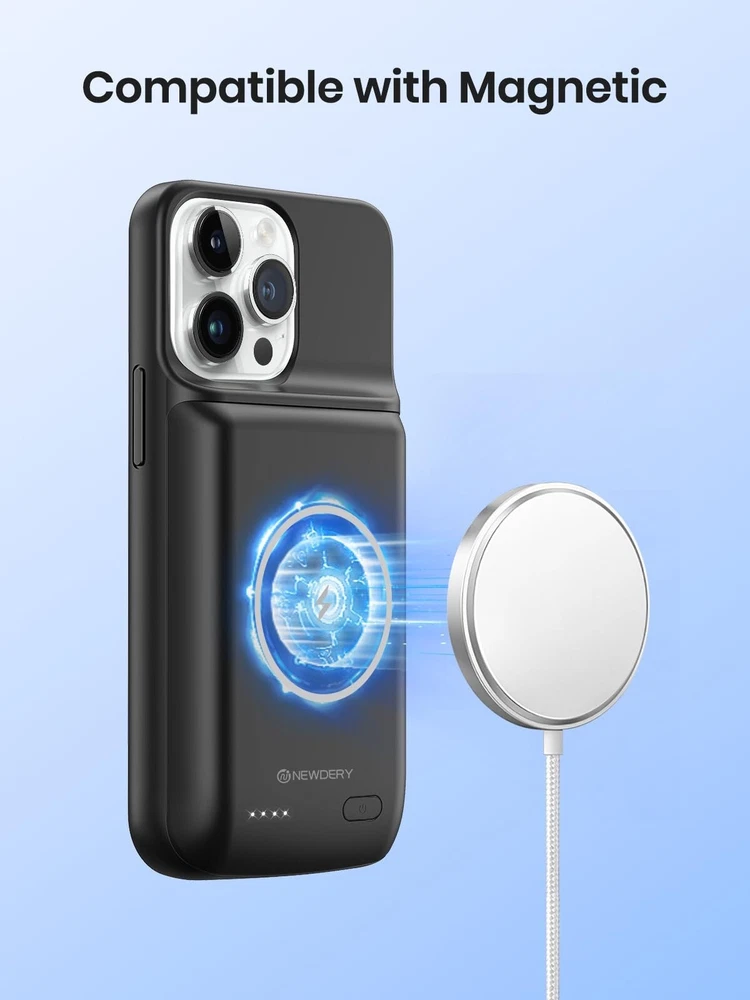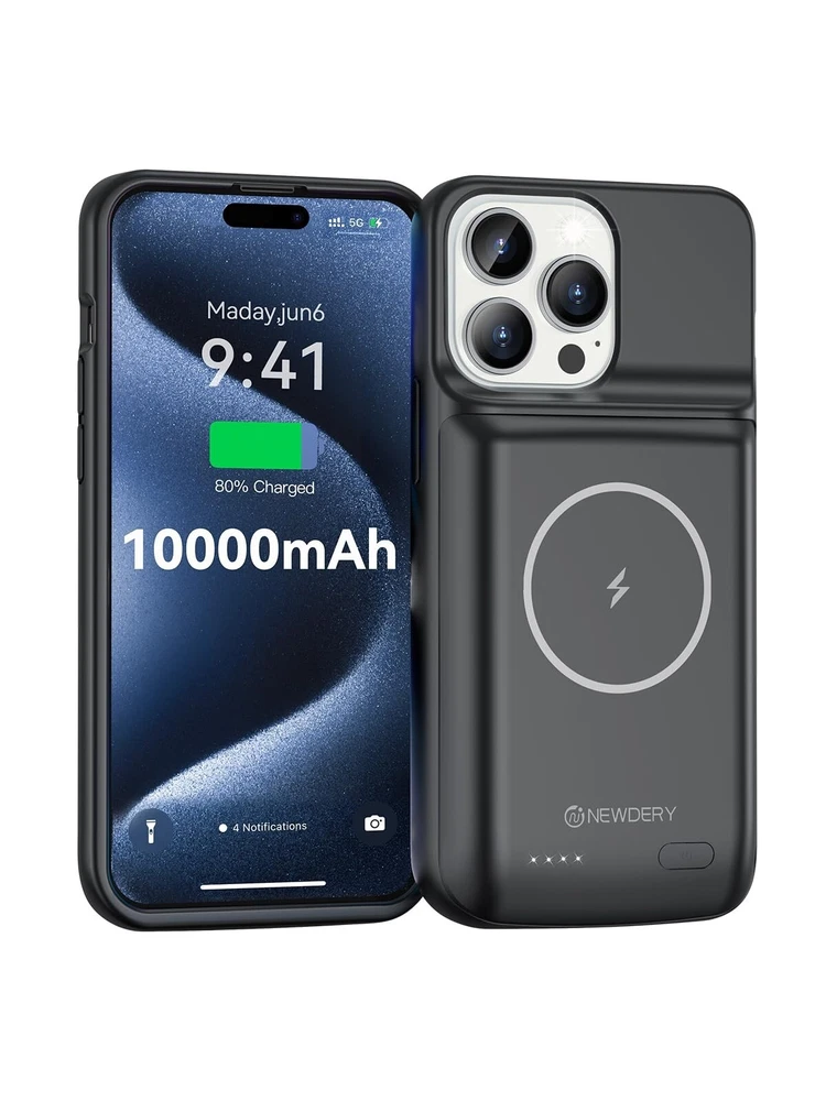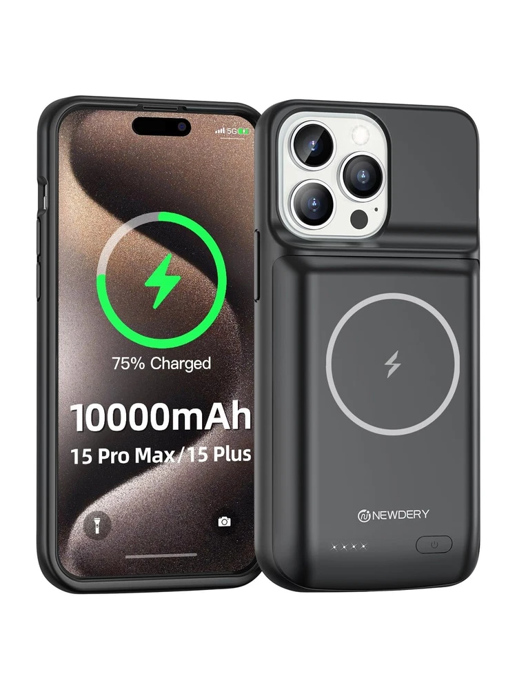 【Compatible Devices】The battery case only fits for iPhone 15 Pro Max, iPhone 15 Plus. Doesn't fit for iPhone 15, iPhone 15 Pro, iPhone 14 Plus, iPhone 14 Pro Max, iPhone 13 Pro Max and other iPhone brand phone. Please check your phone model before buying. The charger case built-in TYPE C port. 【10000mAh High Capacity】The iPhone 15 plus charging case built-in 10000mAh Lithium-ion battery, powerfully extended 200% battery life to your phone, make your phone alive a whole day. It has passed CE, FC and RoHS certification and can be taken on board the plane. Perfect for daily heavy user, business trip or travel 【Magnetic & Qi Wireless & Wired Charging】 The extended battery pack with built-in magnetic module, can be charged with a wireless charger or mag safe charger for a quick and convenient wireless charging experience. Simultaneously charge your iPhone 15 pro max and the charger case via USB C cable. Your phone will be fully charged first then the charging case. 【Easy to Use&Convenient】The iPhone 15 Pro Max charging case makes installation and carry much easier and safer. Equipped with power level indicator LED lights, just press the button for 3 seconds to start or stop charging. 4 LED battery level indicators that let you know how much power you have (0--25%--50%--75%--100%). Product Specifications 1. Input: 5V/1.5A 2. Output: 5V/1.0A 3. Dimensions: 6.5"*3.28"*0.93" 4. Weight: 7.05oz 5. Charging Port: USB C What You Get 1*iPhone 15 Pro Max Battery Case 1*User Manual Important Note: 1. Support Qi wireless charging, magnetic wireless charging, Apple pay. 2. Access to music or calling with Bluetooth earphone while charging your iPhone 15 Pro Max/iPhone 15 Plus.