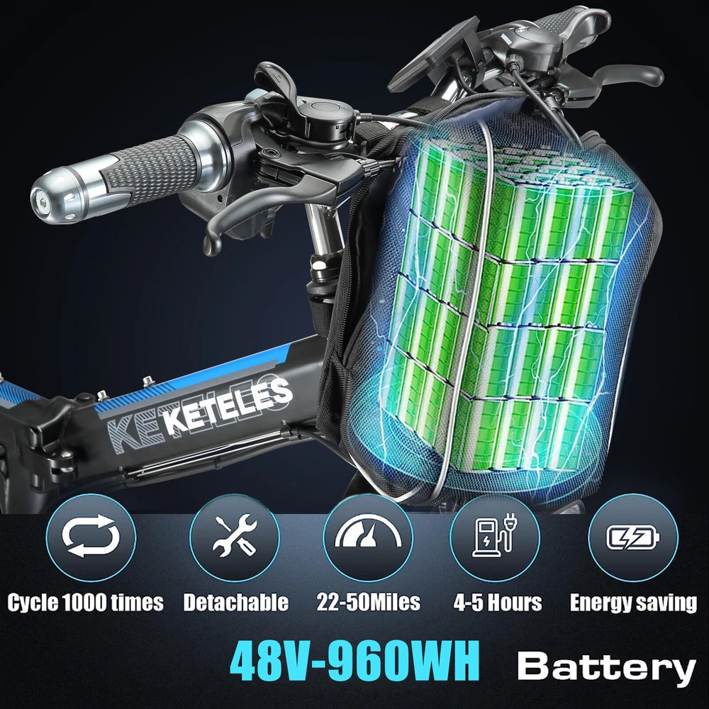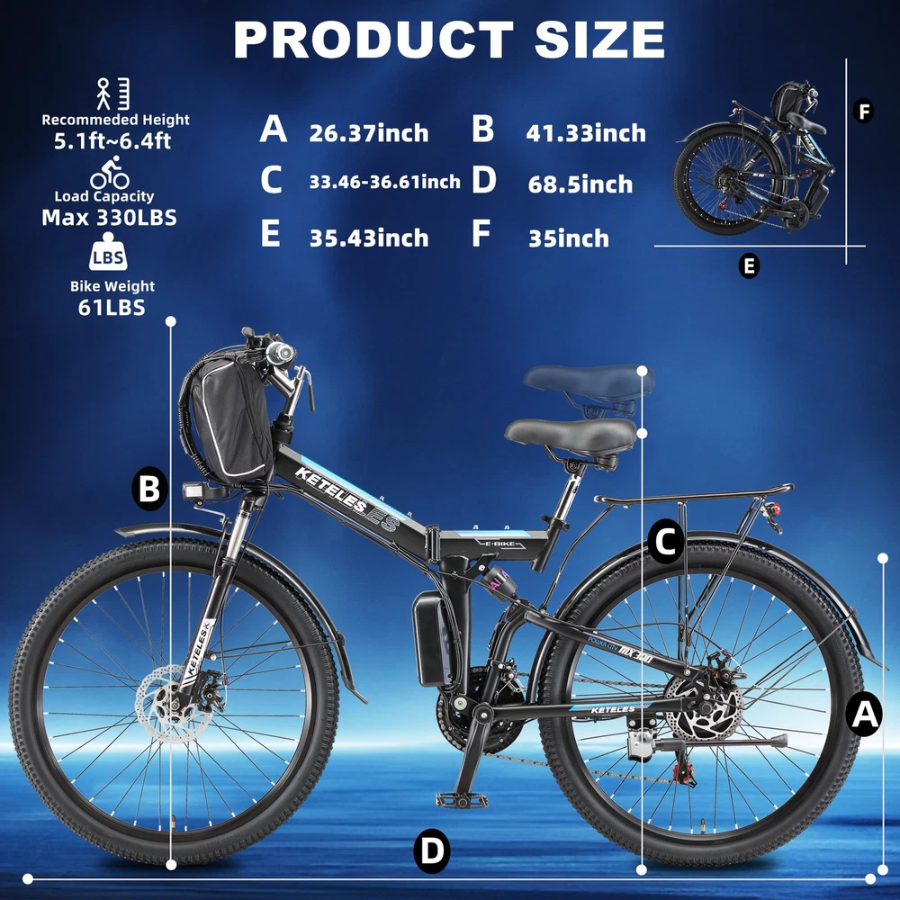 1000W Electric Bicycle KETELES 26" folding Mountain Bike 48V/20Ah for Adults US About this item: *【1000W POWERFUL MOTOR & REMOVABLE BATTERY】 ---Cityscape Electric Bike is equipped with a 1000W brushless motor, provide enough power for your daily outings.Up to 22mph Top Speed. 48V 960WH large removable battery is strong enough for these activities. The ebike can ride 50 miles by pedal assist after charging 4~5 hours, long battery life.And BMS protection in an IPX4 waterproof casing, mileage anxiety is a thing of the past. Embrace every journey with confidence. *【3 WORKING MODES】 --- KETELES Electric Bike is a powerful and cost-effective folding e-bike. 1. Pedal Assist Mode 2. Fully Electric Mode 3. Pedal Mode. Three riding modes switch easily for enjoying a long time travel, and also exercise. * 【 21-SPEEDS GEAR FLEXIBILITY】 --- This KETELES folding ebike has 21-speed gears. Seamlessly adapt to any terrain, from the bustling city streets to the rugged mountain trails. Embrace the freedom to explore and unleash your inner thrill-seeker. * 【COMFORT MEETS STYLE & RICH CONFIGURATION】 ---KETELES Electric Bike made of high-strength carbon steel frame and superior bike paint. Ergonomic and stylish step-thru design, enlarged comfortable seat.LED Headlights and tail light for safe riding.Please note every new bike has gone through road testing before packing, there may be some dust on the tires. * 【HASSLE-FREE SETUP & STELLAR SUPPORT 】 --- Jumpstart your biking adventure with KETELES's 90% pre-assembled e-bike. We stand by our commitment to quality and your satisfaction with a one-year warranty and dedicated 24-hour customer service. Any questions or needs? Reach out, and we'll ensure your KETELES experience is nothing short of exceptional. Specification: Bike Type E-Folding Bike Age Range Adult Brand KETELES Number of Speeds 21 Color Black-Blue/Black-Green/Black-Red Wheel Size 26 Inches Brake Style Disc Brake Mechanical Brake with Power Cut-off Feature Throttle Twist Throttle on the Right side of Handlebar Display Smart LCD display that shows speed, battery status, pedal assist level, etc. Range Fully Electric Mode Range: around 30~40km Pedal Assist Mode Range: around 50~60km Voltage 48 Volts (DC) Model Name MX300 Wattage 1000 watts Item Weight 26kg Maximum Weight Recommendation 330LBS Warranty 1 year Suggested Users Unisex-adult Charge time 4-5 hours Warm Tip ! 1.Please install the bicycle according to the instructions after receiving it. If you encounter any problems during installation, please feel free to contact us. If necessary, we can also send you installation demonstration videos to help you reduce the problems encountered during installation. 2.New electric bike passes road test before packing, therefore dust on the tires is inevitable. 3.Upon arrival, mark down the serial number, which locates on the middle axle tube, and register to vehicle management center. It is necessary to track your ebike while preventing loss. 4.Please be aware of the height of electric bike. Package Included: *1 x Electric bicycle * 1 x Headlight *2 x Fenders *1 x Charger *1 x Battery *1 x Tool kit *8 x Tools *2 x Pedals *1 x Taillight *1 x Rear rack *1 x Air cylinder *1 x Lock Note: Our products have been certified under UL2849 safety standards. Payment Delivery details Terms of sales About us Contact us Payment We accept Credit Card, Debit Card and eCheck payments through Payoneer. Delivery details 1. Thank you very much for purchasing our products. 2. All the items double checked well packed bafore shipping. 3. Itme will be dispatchec within 2 business day(not includes the holiday and weekend) after your payment. 4. We usually use Fedex or UPs logistics to transport your package, and the delivery time would be about 5-7 business days. 5. When you have completed your payment, please leave your correct phone number and address, you could contact us by courier for any quesiton. And keep your phone open, prevent the delivery staff contacting you and causing the package to be returned. Terms of sales We guarantee 100% customer satisfaction. We check all items before sending out, if you received an broken/ defective item, please take photos and send to us immediately. We only accept those case reported within 30 days. Please keep all package material, return items must be in good condition. About us Keteles was specialized in producing bicycle, mountain bike, electric bikes, folding bikes, and other bicycle products. Our products are characterized by elegant appearance, superior quality, assorted specification, novel design, safety and reliability. With a complete set of facility, a perfect quality insurance system and an advanced testing method, we have experienced designers, engineers, management personnel and workers. We always stress on product quality and new product development. We strictly stick to tenet of "emphasizing on quality, stressing on credit, seeking for little profit and pursuing for development". We have gained a good reputation among customers at home and abroad. With our strict quality management, reliable credit, powerful strength and comprehensive marketing network, we sincerely welcome customers to cooperate with us. We would like to accompany you to create a brilliant future. Contact us Our goal is to make sure you are a happy buyer and have a pleasant shopping with us. Please leave us positive feedback and 5 stars rate if you are happy with our item and service. Please contact us before leaving any 1 or 2 ratings, neutral or negative feedback or open any dispute. We understand the concerns and frustrations you might have, and will do our endeavor to resolve the issues. Please give us the opportunity to resolve any problem. We thank you for your effort to make this sale and purchase experience a happy one! If you have any question about us, feel free to contact us, Please allow 24 hours for a message reply! We are highly appreciated your Positive feedback, we will try 