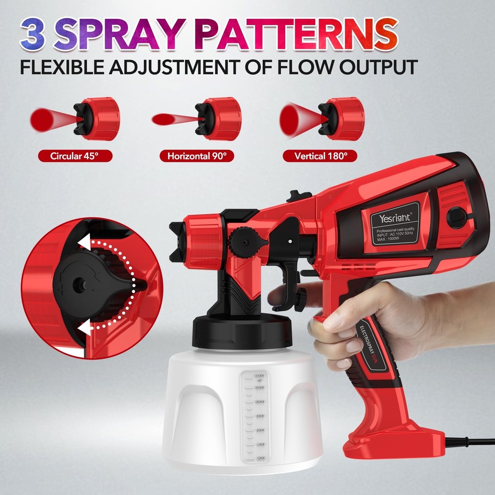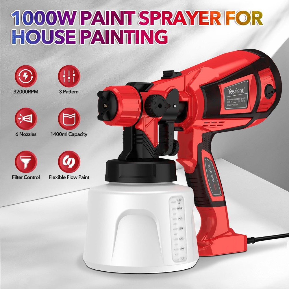 Paint Sprayer High Power Electric Spray Paint Gun High Capacity Container Easy to Clean for Furniture Cabinets Fence Walls Door Works Garden Chairs 6 NOZZLES & 3 SPRAY PATTERNS: 1000W Paint Sprayer is equipped with 6 size nozzles(1.0mm, 1.5mm, 1.8mm, 2.0mm, 2.3mm, 2.5mm), suitable for most painting projects, such as furniture, fences, walls, doors, garden tables and chairs, etc. The Spray Gun offers the flexibility to adjust between three different spray patterns: horizontal, vertical, and circular, making it suitable for a wide range of application scenarios 32000RPM ELECTRIC PAINT SPRAYER: The High Speed Cordless Paint Sprayer operates at 32000 RPM, maximum flow rate is 1,200ml/min, and comes with a large 1400ml capacity container for more efficient paint spraying, including those hard-to-reach spots where a roller simply can't go. The Electric Paint Sprayer offer a faster, more convenient alternative to rollers and brushes ADJUSTABLE FLOW CONTROL: The Portable Paint Sprayer features an adjustable spray width knob that allows you to precisely manage the spraying area and optimize paint usage for various projects. In addition, the flow control knob allows you to easily adjust the paint flow to meet a variety of spraying needs, achieve better spraying results, and have greater flexibility EASY TO USE & CLEAN: The Electric Paint Sprayer can be easily assembled with no tools, even if you are a beginner, you can easily get started after reading the manual. It is very important to clean the paint sprayer thoroughly after use, it comes with a cleaning brush and a needle to remove any hardened paint left in the nozzle, making it convenient and efficient for you to clean COMPLETE PAINT SPRAYER KIT: Paint Sprayer Kit includes 1*paint sprayer, 6*nozzles (1.0mm, 1.5mm, 1.8mm, 2.0mm, 2.3mm, 2.5mm), 1*cleaning needle, 1*cleaning brush, 1*viscosity cup, 1*paint filter, 10*paper funnels, 1*goggles, 1*gloves, 1*user manual. It has all the materials you need to get started, so that you do not need to purchase additional