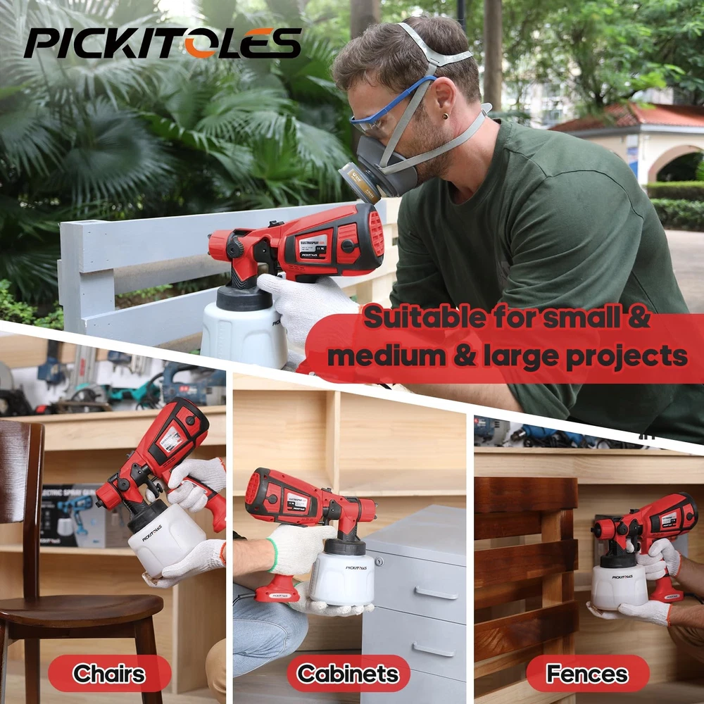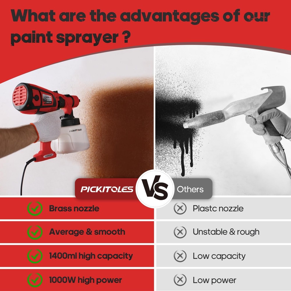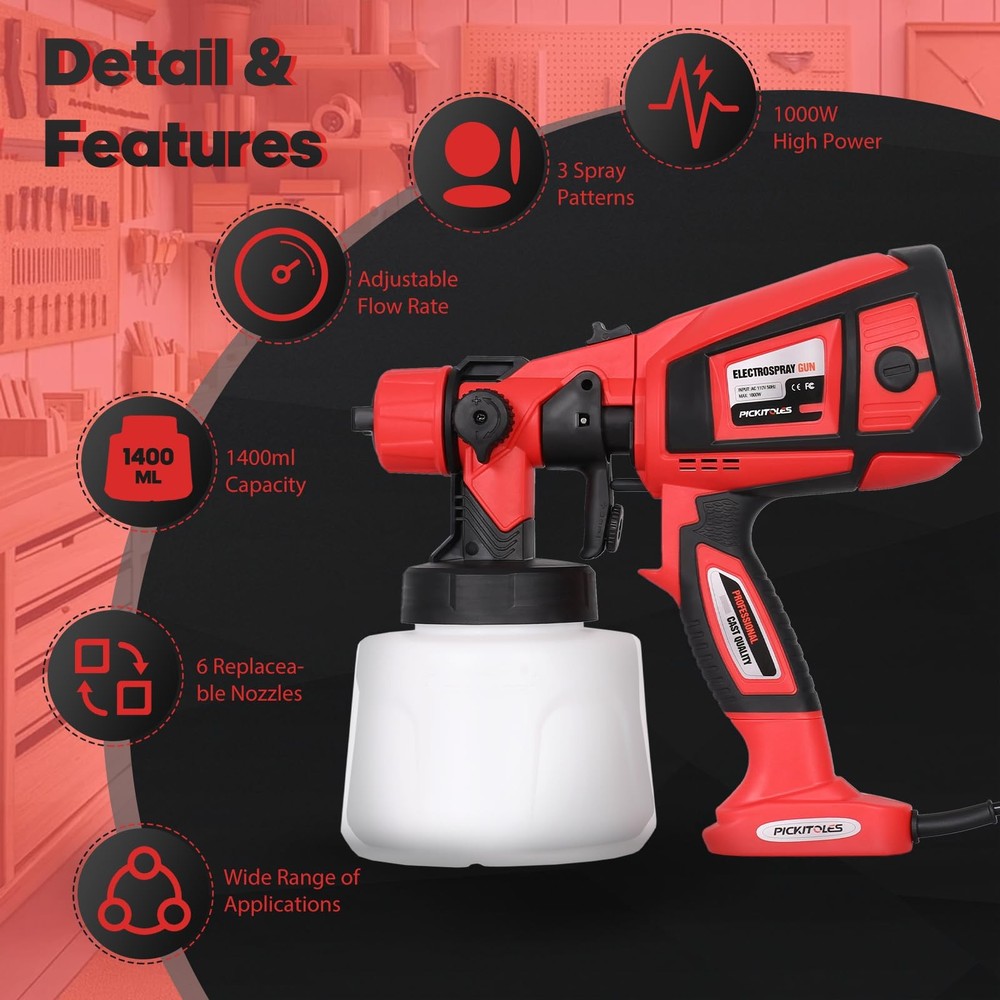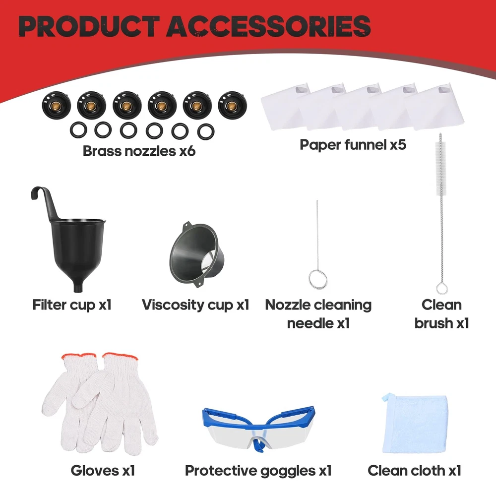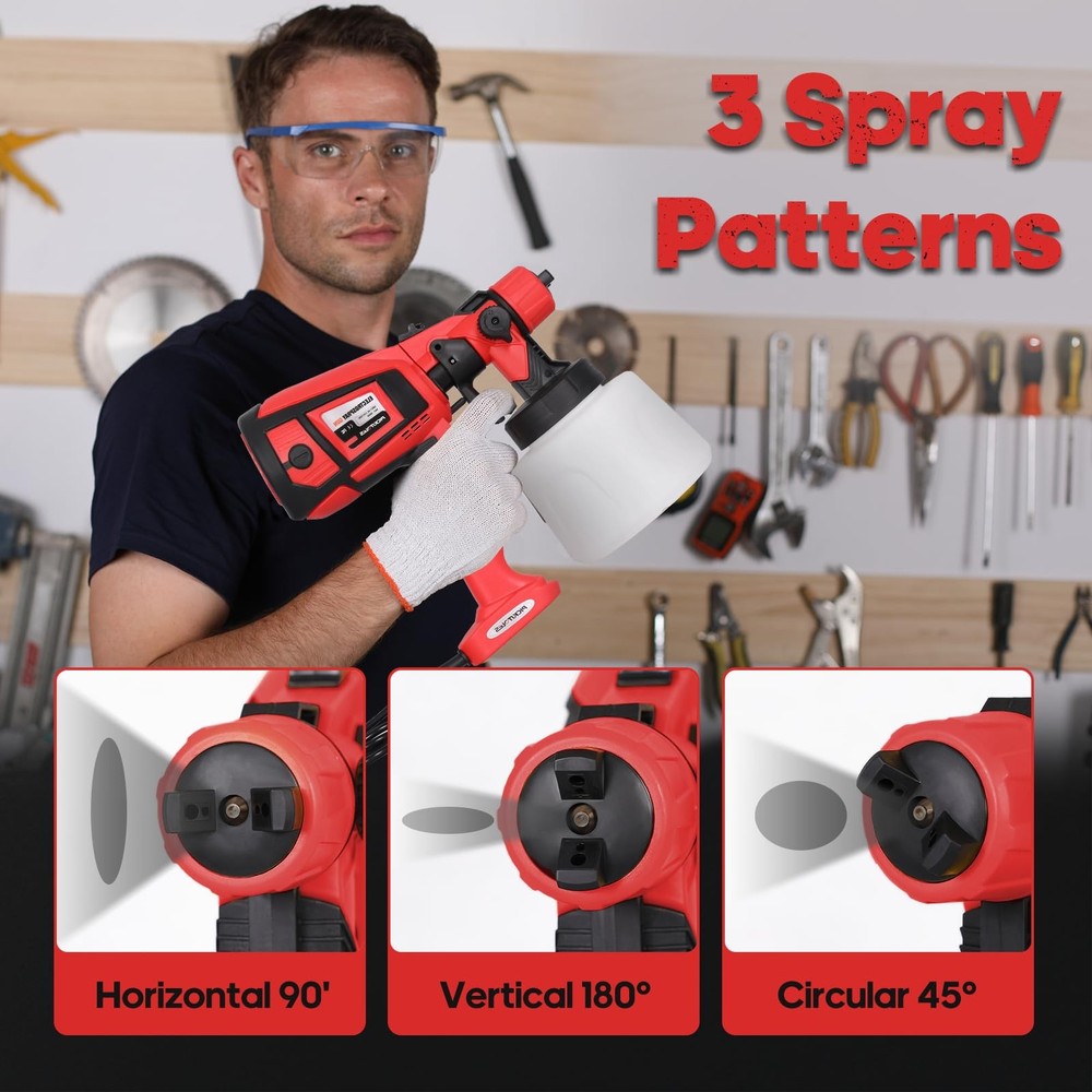 1000W Paint Sprayer HVLP Electric Spray Paint Gun for Painting with 6 Brass Nozzles & 3 Spray Patterns for House Painting Home Interior Wood Furniture Walls (Red) High-Efficiency 1000W Spray Paint Gun - Our powerful spray paint gun offers a maximum power of 1000W and a flow rate of up to 800ml/min, delivering exceptional spray results with a consistent and fine atomization compared to other paint sprayers. Versatile Nozzles and Spray Modes - Featuring 6 interchangeable nozzles and 3 adjustable spray patterns, this HVLP spray gun adapts to various painting requirements, making it the ideal tool for both detailed projects and larger surfaces. User-Friendly Design - The electric paint sprayer is equipped with an adjustable spray speed control knob, facilitating adaptation to various work requirements, ensuring comfort during use with its ergonomic grip. Additionally,included cleaning tools make maintenance a breeze. Wide Application Range - Perfect for a variety of projects, from simple furniture like tables and chairs to larger-scale tasks such as house painting or automotive refinishing, this paint sprayer for painting is designed to meet diverse painting needs efficiently. Complete Accessories and Excellent Customer Service - Your purchase includes the paint spray gun, 6x nozzles, 6x sealing rings, 5x paper funnel, 1x filter cup, 1x viscosity cup, 1x nozzle cleaning needle, 1x clean brush, 1 pair gloves 1x protective goggles and 1x clean cloth . If you encounter any issues during use, our dedicated support team is ready to assist you, ensuring a hassle-free experience with your paint sprayer.