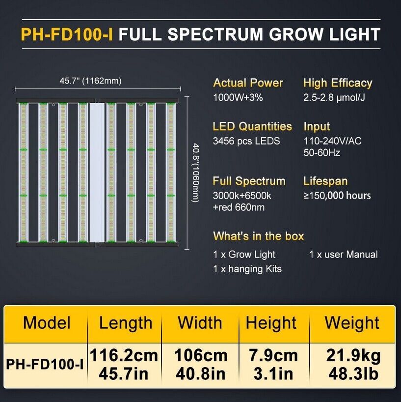Spider 1000W Full Spectrum Grow Light SamsungLM561C Dimmable Commercial Bar Lamp Uniform PAR Distribution and High PPFD Output: Within the effective coverage area, the PPFD of every point is in the perfect range of 1500-1978umol/s/m2, achieving a uniform crash! 50% higher PPFD and 50% lower power consumption compared to HID lights, which helps maximize production by 30-70% Daisy chain Dimming Function: The Dimming function is available for brightness from 10% to 100% by one dimmer knob Up to 30 lights can be daisy chained together and controlled by just one material light Top quality LEDs and Low Current Drive: The entire light is built with Samsung LM281B and Red 660nm LEDs, quality guaranteed Use more than two as many LEDs as minor lights to drive the grow lights with low current and avoid overdrive Aluminum Heat Sink&IP65 Waterproof: Wave shaped heat sink increases the heat distribution area, to gain an optimal heat distribution performance IP65 waterproof level allows the light to work in humid environments without vocabulary Marvelous Customer Care: Light pass Strict quality standard DLC, ETL, UL, CE, RoHS, UKCA certificate Stronger hanging kits are available for easy installation 100% Safe to use, zero risks! No word of fire or security threat, long life Wonderful Service: Discreet package guaranteed 3-7 Working days delivery time Warehouse in US/AU/UK/DE/CA/RU, free and fast shipping with standard plug from the local warehouse Specification of Phlizon FD 8000 1000W Led Grow Light Full Spectrum Indoor Plants Model: PHLIZON FD8000 1000W led grow light (Dimmable) Feature: Sunlike Spectrum+Foldable+Samsung LM281B and RED 660 Chips+0dB+dimmable Personal Coverage:6ft × 6ft=1.8x1.8m;Commercial Coverage: 5ft × 5ft= 1.5m × 1.5m Max Yield: 2.9g/watt PPE: 2.9 umol/j PAR Value: 1978umol/S@AC120V-240V, Uniform PPFD than other brand LED Replace HID/MH: 2000w, more energy-saving Power draw(±10%):1000W±5%@AC120-277V Dimensions(L/W/H): 41.7x45.7x3inches=106X116X7.8 CM Amp Draw: 8.33A@AC120V, 4.16A@AC240V, 3.61A@AC277V Lumen(±5%): 120000Lm@AC120V, Item Net Weight/Gross Weight: 18.7KG/19.5KG Spectrum: 660-665nm,2800-3000K,4800-5000K, (Use for all stages of plants growth and flowering.) LED Type:Samsung LM281B and Osram 660nm Noise Level: 0 DB Input Voltage: 100V-227V(AC) Life Rating: 50000-100000 hours Recommend light and tent combo: FD 8000 led+6'x6' tent Certification: DLC, ETL, UL, CE, RoHS, SAA, PSE, 100% Authentic Safe guaranteed! 5 Years warranty for US/UK/CA/DE/EU/AU buyers+30 days return guarantee 3 Package includes 1 x LED Grow Light 1 Set x Free Steel Hanging kits (Easy installation) 1 x Free Warranty cards 1 x Free Power cord with Plug(US plug) Application 1) Seeding/Breeding/Veg/Flower/For all planning stages/Green Vegs/Flower Plant/Fruit Plant/Herbs/Medical/Meat Plant, etc 2) Hydronics/Horticulture/Industrial plants/Greenhouse Lighting/Pot Culture/Farm/Water Double Brewing/Pipeline Culture, etc 3) Exhibition/House Garden/Bonsai/Home/Commercial Crops/Project/Personal Growth/Urban and University Research ect WHY CHOOSE US We can do whatever we can to ensure that interests of consumers SupplyDirectly from factory ExpressFast discreet delivery PriceNo physical stores no middleman Service100% satisfied customer service Warehouse US/UK/EU warehouses RECOMMENDED FOR: Commercial windows Greenhouses Home windows (rooms and tents) Soil, hydroponic, aeronic, or aquatic systems Indoor farming or gardening 30 days in return and 3 years warranty so that you can buy with confidence WHY CHOOSE PHLIZON BRAND GROW LI Delivery details Terms of sales About us Contact us WHY CHOOSE PHLIZON BRAND GROW LI PHLIZON is your one-stop-shop quality LED GROW LIGHTS and HYDROPONIC Designer & Manufacturer Phlizon has been developed by growers over Ten years of careful experimentation and testing . We mainly produce the led grow light and Hydroponics accessories in Agricultural Greenhouses help indoor and outdoor plants growing. Scientifically engineered to deliver the highest level of PAR output and balanced Coverage in the Commercial LED grow market. Phlizon LED Grow Lights are built with high quality Samsung diodes and Cree cobs. The lights encompass a continuous range of wavelength from blue and green to red, creating a Full spectrum light blend matching the natural sunlight. PHLIZON customized our light spectrum to optimize plant growth and increase yields while consuming less energy and reducing operating costs compared with traditional horticulture technologies. Higher Light Intensity, Better Coverage, More advanced features ( dimmer and wifi control US,EU,RU,DE,UK Local warehouses for fast shipment.95% of the goods are in 4-7 days Fast Delivery Delivery details CA & DE & US & UK Warehouse 3-7 days fast Shipping EU Buyers-Shipping from DE warehouse with EU Plug ,no customs, US Buyers-shipping from US warehouse with US Plug,no customs,no taxes UK Buyers-Shipping from UK warehouse with UK Plug,no customs CA Buyers-shipping from CA warehouse with CA Plug,no customs,no taxes Other country buyer will be shipped from china warehouse via Fedex , DHL ,UPS express , buyer need to take the customs and taxes by yourself ,thanks :) No customs problem, for DE/CA/US/UK buyer ,we will ship you the plug required for your country.Fast Shipment. Pls note , if the light are more than 12kg , pls ask me for taxes and customs . if you need bulk order , we can ship it out via sea shipping or railway shipping free of customs & taxes International Shipping International customers are welcome! We currently offer shipping to over 100 countries. International orders may require longer handling time International orders may be subject to local import fees, duty, customs, VAT charges or additional taxes , depending on the country of destination tax laws. We are not responsible for any of these tax charges , nor can we offer any specific advice on import fees, duty, customs, VAT or taxes that you may be required to pay upon the arrival 
