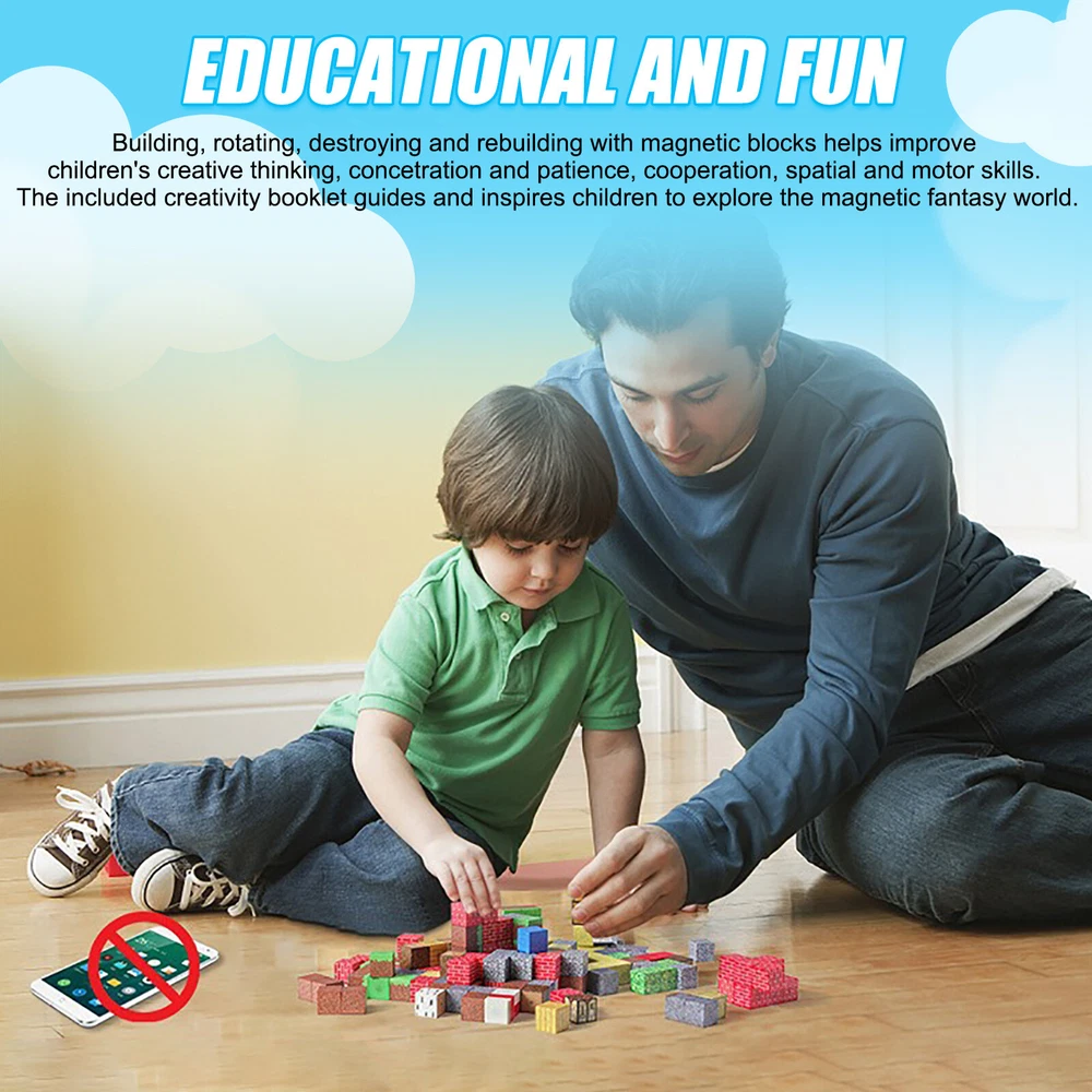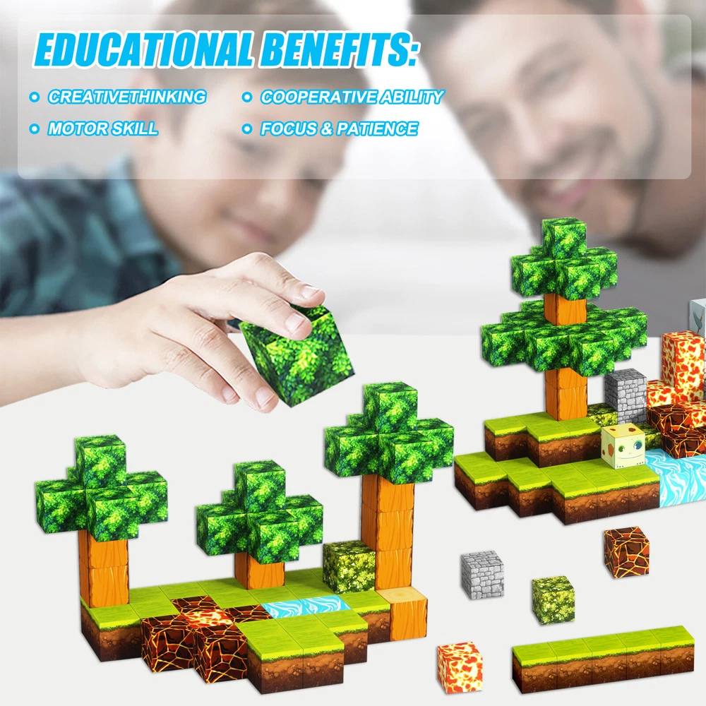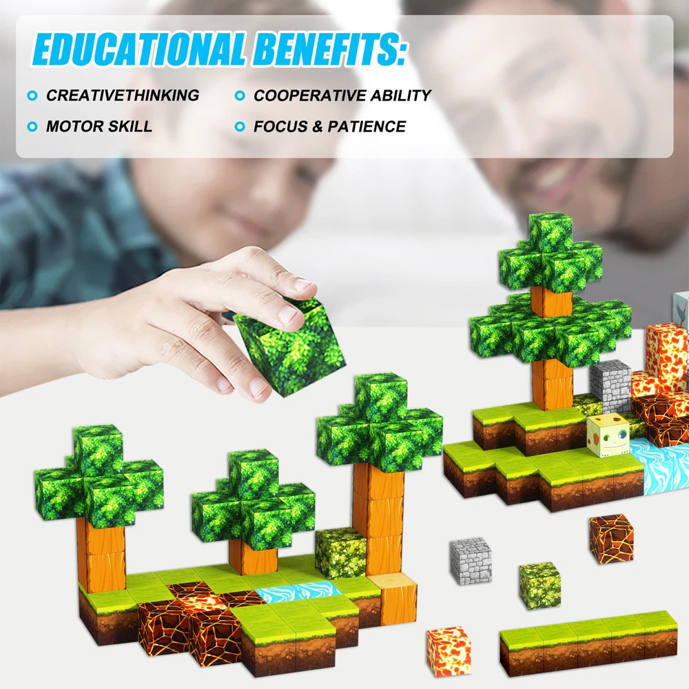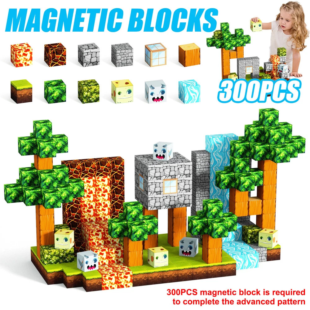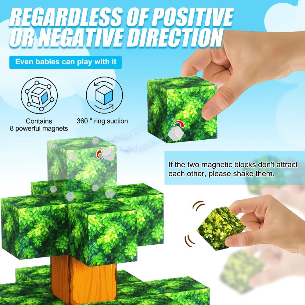 Product Description Features: -BUILD A FOREST SET: Get ready to experience the fun of magnetic toys with this new magnetic cube set! Build a forest collection, add the character cubes from our set, or your other toys, and start your forest adventure with role-playing fun and dress-up toy fun. Magnetic blocks open up a fantastic world of possibilities, from simple to challenging constructions (multiple matching sets required). Let your children's imagination run wild with our magnetic open-ended playsets! -Educational and fun: building and block toys inspire a wide range of skills in children. Building, rotating, destroying and rebuilding with magnetic blocks helps improve children's creative thinking, concetration and patience, cooperation, spatial and motor skills. The included creativity booklet guides and inspires children to explore the magnetic fantasy world. It's a fun solo activity that can also be done with friends and is a great alternative to screen time. -Supersensory Magnetic Toys for Kids: The 100 Piece Magnetic World Set combines UV technology and magnetic science to make your construction art more vivid and realistic than simple solid-colored cubes, offering rich patterns. More cubes, more possibilities to unleash your child's creativity. Kids will get everything to decorate their little castle or build a forest parking lot for their dolls to park their toy cars! -TODDLER AND BEGINNER TOYS MAGNETIC SET: Unlike other magnetic toys on the market, our magnetic cube set makes it easier for toddlers 1+ years old and up to stick the cubes together and make them sturdy. Rounded edges and proper size won't hurt little hands. Perfect STEM toys can help kids get deeper into the world of structures and learn about magnetism. Recommended toy gifts for toddlers and children ages 1-12 years old -EXCELLENT SCIENCE GIFT GIVING IDEAS: The magnetic cube is fun because it will keep kids of all ages busy for years to come. It is a great irritating kids toy for classrooms, toddlers, preschoolers, teens 1 2 3 4 5 6+ boys and girls. Perfect educational gift for birthdays, Christmas, Children's Day, STEM and school events. Attention: - Our initial set is 100pcs, and our main picture is divided into basic sets and advanced quantities, which vary from dozens to hundreds of building blocks, please pay attention to the scale and quantity of building, and purchase according to demand. - We put magnetic control to some challenge, develop careful observation, find building skills, and build high order patterns (watch our tutorial video). The difficulty of more than 300pcs big picture ☆☆☆☆ -☆☆☆☆☆ finally challenge it! Specification: -Material: high quality magnet/high quality plastic -Color: As shown in the picture -Quantity: total 100pcs -Size: single cube size 2.5cm/1inch Package Includes: -1x 100pcs magnetic blocks (12 patterns) -1x Instructions