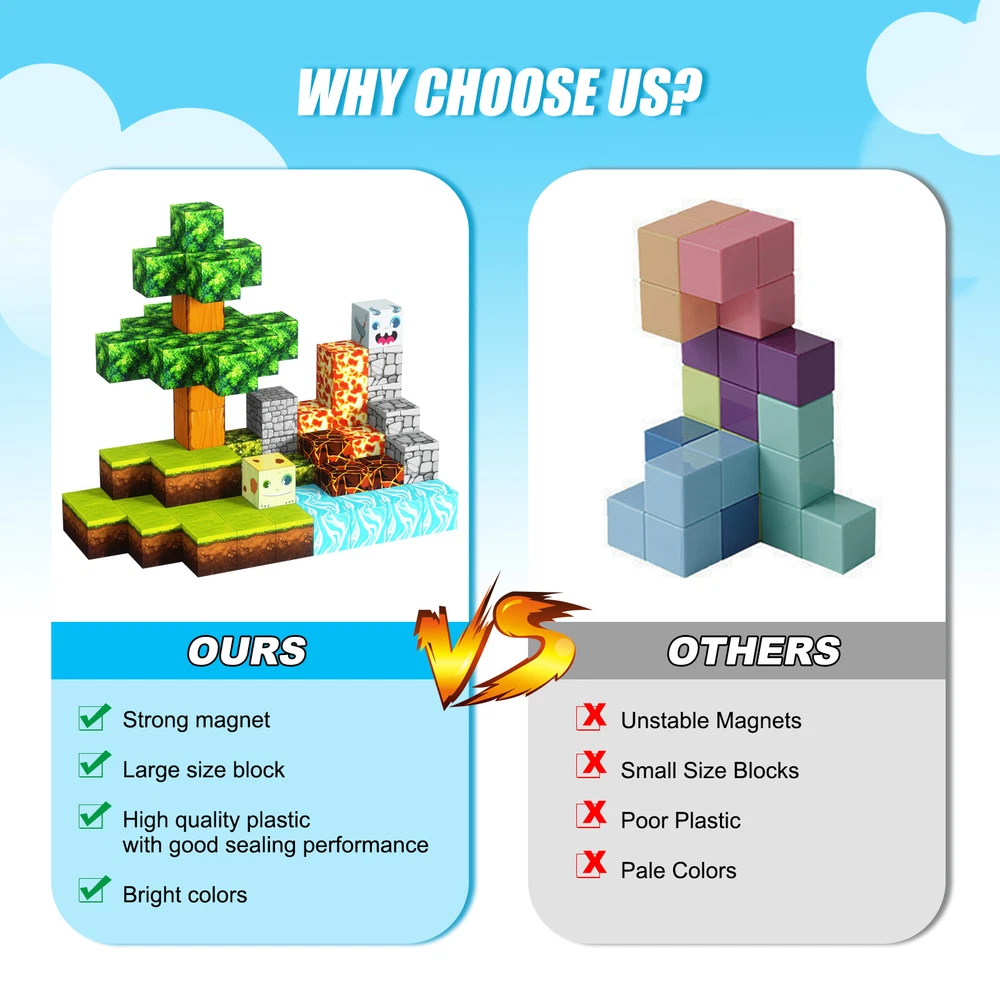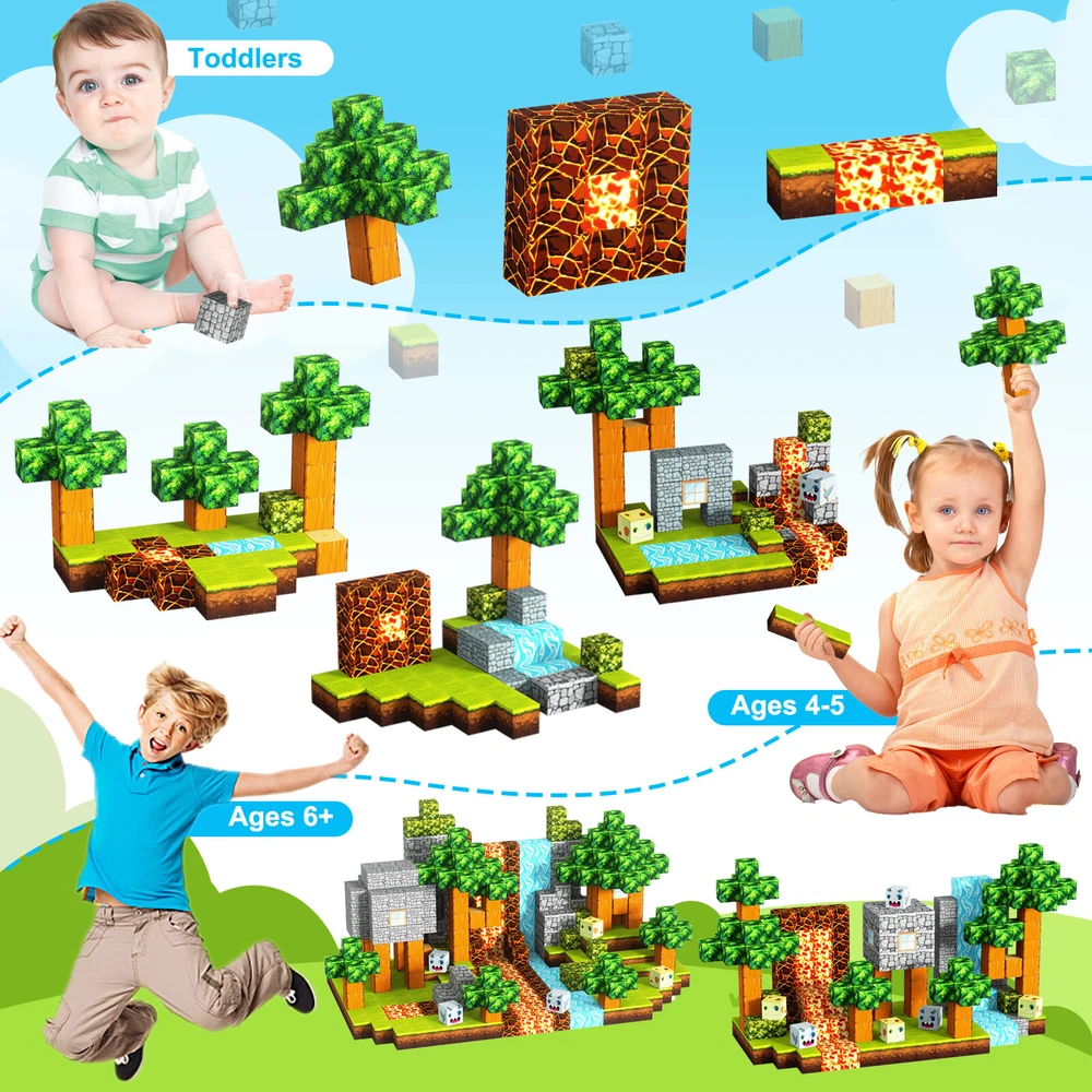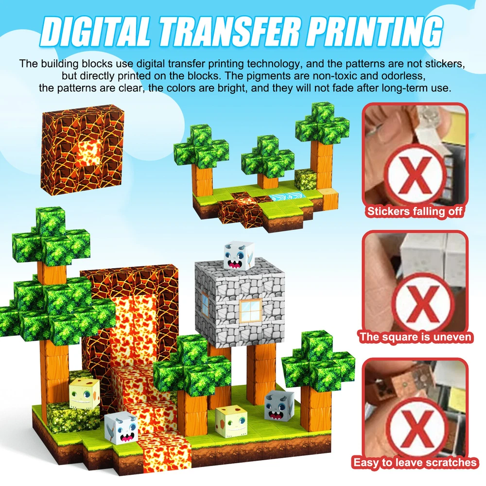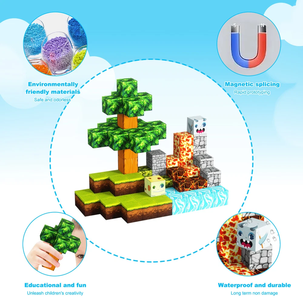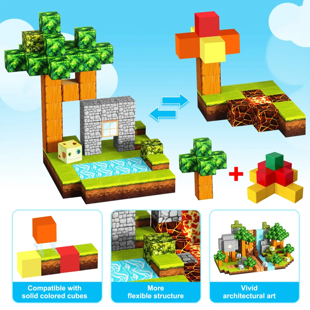 Product Description Features: -BUILD A FOREST SET: Get ready to experience the fun of magnetic toys with this new magnetic cube set! Build a forest collection, add the character cubes from our set, or your other toys, and start your forest adventure with role-playing fun and dress-up toy fun. Magnetic blocks open up a fantastic world of possibilities, from simple to challenging constructions (multiple matching sets required). Let your children's imagination run wild with our magnetic open-ended playsets! -Educational and fun: building and block toys inspire a wide range of skills in children. Building, rotating, destroying and rebuilding with magnetic blocks helps improve children's creative thinking, concetration and patience, cooperation, spatial and motor skills. The included creativity booklet guides and inspires children to explore the magnetic fantasy world. It's a fun solo activity that can also be done with friends and is a great alternative to screen time. -Supersensory Magnetic Toys for Kids: The 100 Piece Magnetic World Set combines UV technology and magnetic science to make your construction art more vivid and realistic than simple solid-colored cubes, offering rich patterns. More cubes, more possibilities to unleash your child's creativity. Kids will get everything to decorate their little castle or build a forest parking lot for their dolls to park their toy cars! -TODDLER AND BEGINNER TOYS MAGNETIC SET: Unlike other magnetic toys on the market, our magnetic cube set makes it easier for toddlers 1+ years old and up to stick the cubes together and make them sturdy. Rounded edges and proper size won't hurt little hands. Perfect STEM toys can help kids get deeper into the world of structures and learn about magnetism. Recommended toy gifts for toddlers and children ages 1-12 years old -EXCELLENT SCIENCE GIFT GIVING IDEAS: The magnetic cube is fun because it will keep kids of all ages busy for years to come. It is a great irritating kids toy for classrooms, toddlers, preschoolers, teens 1 2 3 4 5 6+ boys and girls. Perfect educational gift for birthdays, Christmas, Children's Day, STEM and school events. Attention: - Our initial set is 100pcs, and our main picture is divided into basic sets and advanced quantities, which vary from dozens to hundreds of building blocks, please pay attention to the scale and quantity of building, and purchase according to demand. - We put magnetic control to some challenge, develop careful observation, find building skills, and build high order patterns (watch our tutorial video). The difficulty of more than 300pcs big picture ☆☆☆☆ -☆☆☆☆☆ finally challenge it! Specification: -Material: high quality magnet/high quality plastic -Color: As shown in the picture -Quantity: total 100pcs -Size: single cube size 2.5cm/1inch Package Includes: -1x 100pcs magnetic blocks (12 patterns) -1x Instructions