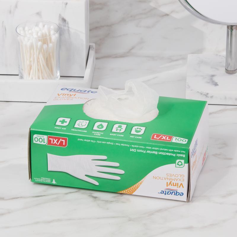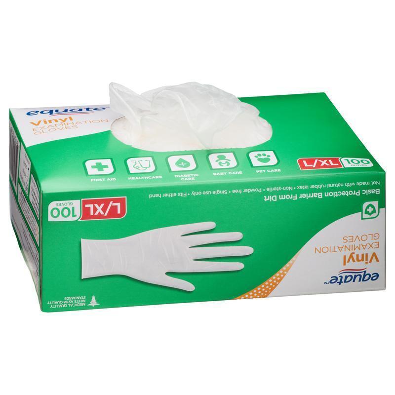 100 vinyl examination glovesNot made from natural rubber latexNon-sterile Equate Vinyl Examination Gloves, L/XL, 100 Count: 100 vinyl examination gloves Not made from natural rubber latex Non-sterile Powder-free Single use only Fits either hand Size Large/X-Large