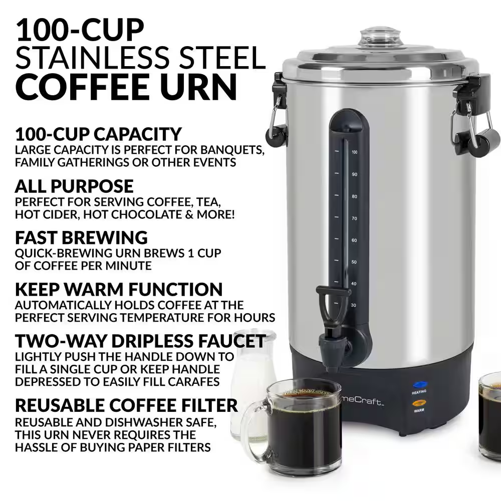 Fast Shipping On All Items 30 Days Money Guarantee Customer Support Excellent Service 100% Satisfaction Satisfaction Guaranteed 100-Cup Stainless Steel Coffee Urn with 2-Spigots Specification Appliance Series Not Applicable Appliance Type Electric Server Capacity (L) 24 Capacity (fl oz) 811.58 Color/Finish Stainless Steel Color/Finish Family Stainless Steel Commercial Use Residential Commercial/Residential Residential Cordless/Corded Corded Features Cool-Touch Handles,Removable Filter,Water Level Indicator Material Stainless Steel Returnable 90-Day Small Appliances Color Family Silver Small Electric Product Type Coffee Urn Wattage (W) 1500 W Certifications and Listings ETL Listed Manufacturer Warranty 1 year limited Safety Listing ETL Product Height (in) 23 in Product Width (in) 10.6 in 10.6 inches x 23.0 inches. Item Description 2-way dripless faucet lets you fill more than one cup at a time Reusable coffee filter saves the hassle of buying paper filters Quick-brewing urn brews a cup of coffee per minute Perfect when hosting large gatherings or for use in meeting rooms, lounges and cafes, this polished stainless steel coffee urn efficiently brews up to 100 cups at a time of coffee, tea, cider, hot chocolate and more. No more waiting - the double spigot, two-way dripless faucet allows for more than one cup to be filled at a time. When done brewing, the keep warm function will keep the brew hot for hours and ready for guests. About us We offer the best prices around on high quality products. Our E-store includes media such as books, movies, music and games while offering electronics, toys, sporting apparel, clothing, tools, general home, garden items and more. Shipping We are always working hard to ensure your package arrives as soon as possible. Please understand that some factors like weather, high postal traffic, and the performance of shipping companies are outside of our control. We offer free shipping to the lower 48 states and ship within 2-3 business days of payment, usually sooner. We do not accept P.O. Boxes. Please provide a physical address. For shipping outside of the continental USA, we only use eBay's Global Shipping Program.The item is shipped to KY and then sent to the rest of the world. International customers are responsible for all duties and taxes. Continue to check out to calculate costs for shipping the item to your country. Messages regarding eBay's Global Shipping Program MUST be directed at eBay EXCLUSIVELY. Returns We offer a 30-Day Return Policy on items in which you are not completely satisfied with. You have the option of a full-refund or an exchange of the item. No returns are available on items shipped outside of the USA Satisfaction We try over very best to make sure every customer is completely satisfied. If there's a problem, message us! We're happy to help. Payment Options Shop With Confidence