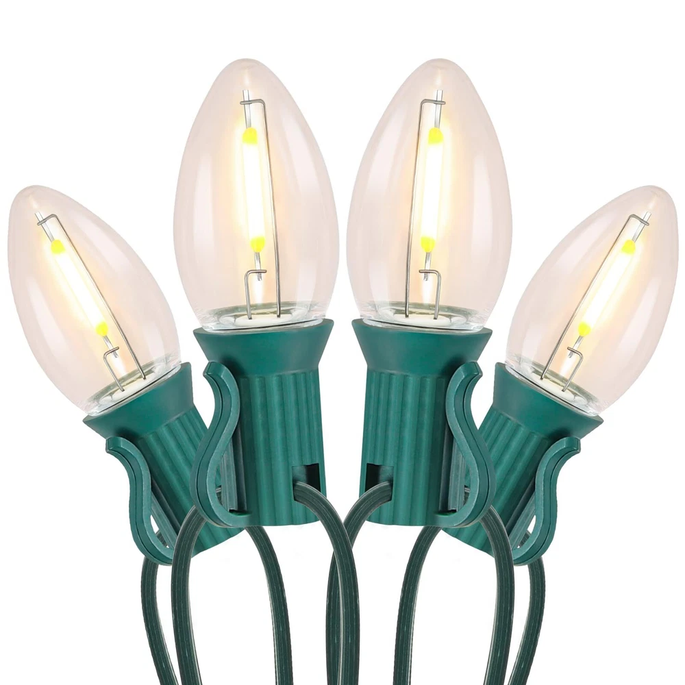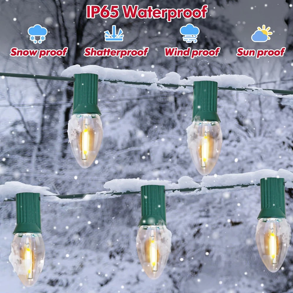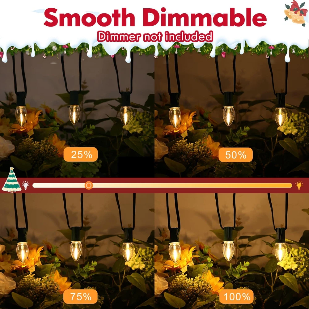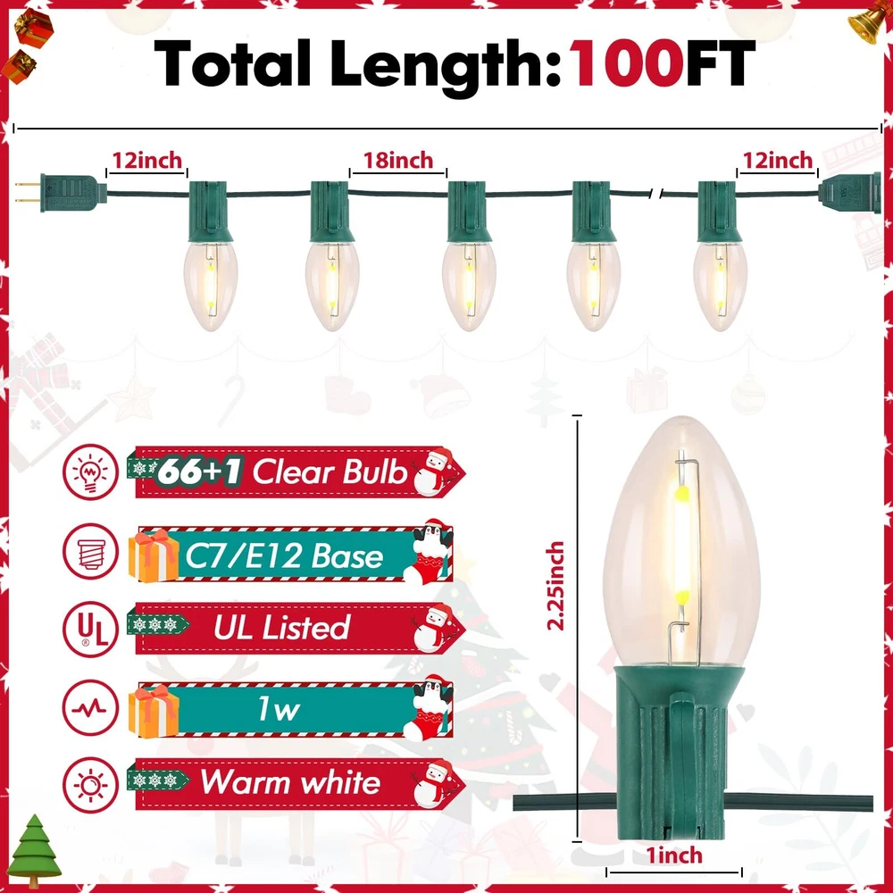 🎄Why do you choose C7 LED Christmas String Lights?🎄 👍Reliable Material Our C7 LED string lights for outside are produced with high quality plastic bulbs and a heavy-duty cord, making them able to withstand extreme weather conditions. IP65 waterproof ensures that they are safe to touch and perfect for both outdoor and indoor decoration. 🎉Easy to Install With a durable and flexible copper wire, these vintage hanging string lights waterproof are easy to install and can be shaped and molded to fit any space. The copper wire is also rust-proof and weather-resistant, so you don't have to worry about wear and tear. 🎊Indoor Outdoor Decoration Lights Our Christmas patio string lights are UL listed for indoor and outdoor use. Each light socket has a link that you can easily attach the lights to your Christmas trees, Christmas decor or other desired surfaces, quick & easy to set up your warm white c7 Christmas lights in minutes, adding an warm white glow to your outdoor garden path and welcome the coming Christmas. 🍾 Specifications - Bulb Type: C7 LED - Base Type: E12 (Candelabra) - Voltage: 120V - Wattage: 0.6W per bulb - Lifespan: Up to 25,000 hours - Power input: 120V~, 60Hz - Lighting mode: steady on 💛Warm Tips 1. Do not mount or place near gas or heaters, fireplace, candles or other similar source installation. 2. If the string light connected with more strings and do not work, please check the max connectable strands (4 strands 100FT) or make sure they are properly connected. 3. The string lights will keep lighting if bulb is broken, you can replace it with our additional spare bulbs. Safe and Durable String Light: Our c7 outdoor string lights come with advance materials and UL listed, which are safer than normal incandescent lights. The heavy-duty green cord made up with PVC cable jacket and high copper that can withstand the wear of indoor and outdoor use. The IP65 waterproof LED Christmas lights either with a built-in spare fuse (120v) for easy , ensuring safe and long-lasting use. Smoothly Dimmable Performance: Adopted advanced dimming technology, our dimmable hanging roof-line string lights with 90%+ dimmer switch in the market, allowing you to dim the brightness from 0%- 100% stable at will, creating the perfect atmosphere for Christmas Halloween holiday birthday party, family reunion or wedding celebration. (Please note: Dimmers are not included) 90% Less Bill Cost: Every C7 Christmas light string outdoor 100FT contains 66+1pcs E12 socket LED bulbs(1 spare bulbs). Each bulb built in high-efficiency led chip, consume 0.6W only while lasting 25000+hrs long lifespan, the low wattage light bulb is more than 90% energy efficient than incandescent bulbs. So you can enjoy the romantic atmosphere without wasting your money. End to End Connectable Lights: 12" lead with male plug, 12" spacing between bulbs, 18" tail with female connector. Our E12 commercial string lights 100FT are end to end connectable up to 432W (4 strands 100FT) to decorate your Christmas. And the C7 vintage clear bulbs are removable that provide flexibility for easy and custom designs. connectable LED Christmas lights perfect for fence, garden, patio, roof, backyard, Christmas decoration. Vintage Christmas Lights: Our C7 vintage Christmas Lights shatterproof glow a warm white lighting, combined with clear lights bulbs & green wire. It’s a perfect Christmas decoration light string for your home, holidays, winter, , backyard, garden, patio, wall, gate, yard, Christmas tree, window, party. You can enjoy the bright and romantic holiday atmosphere.