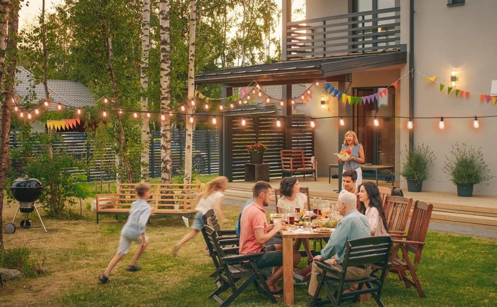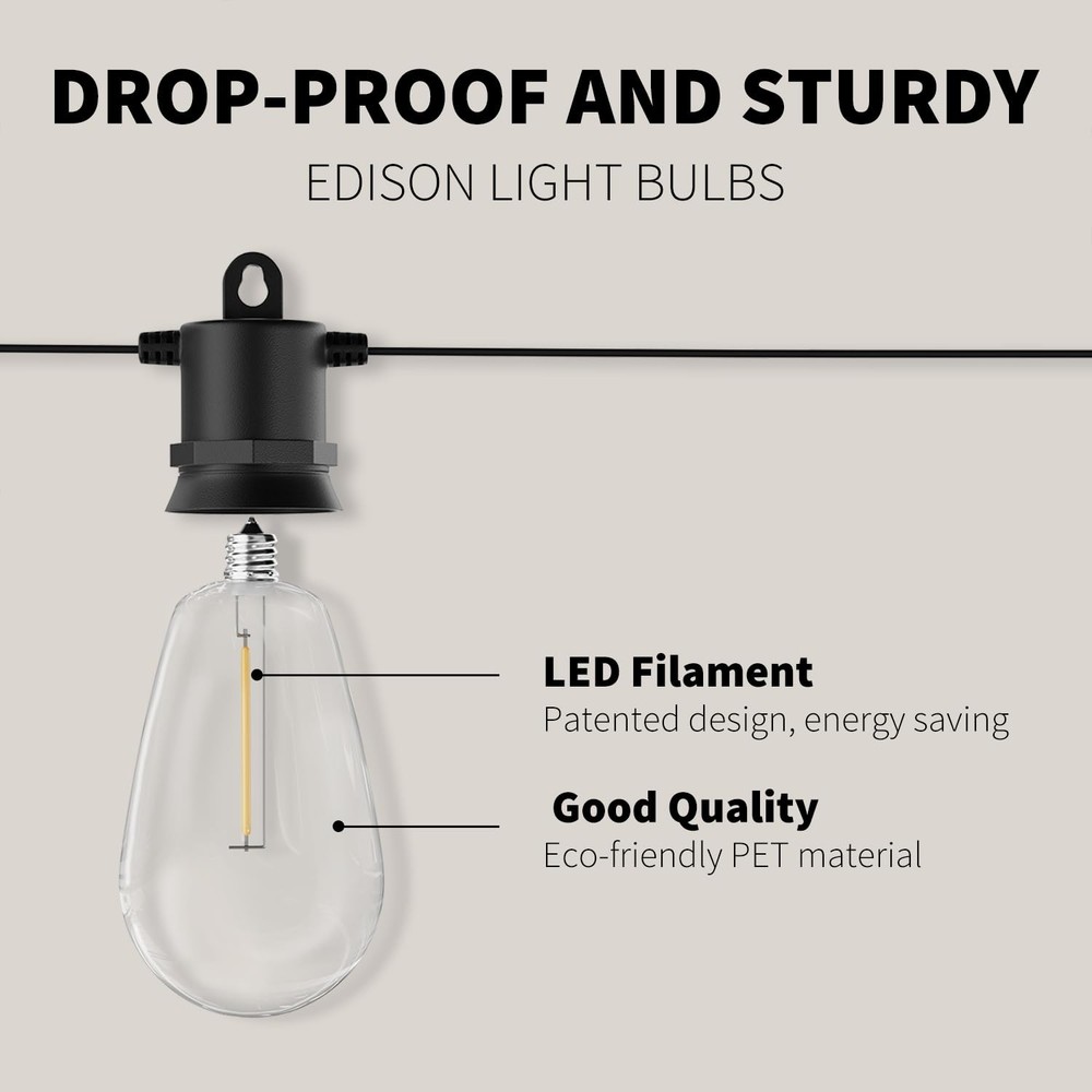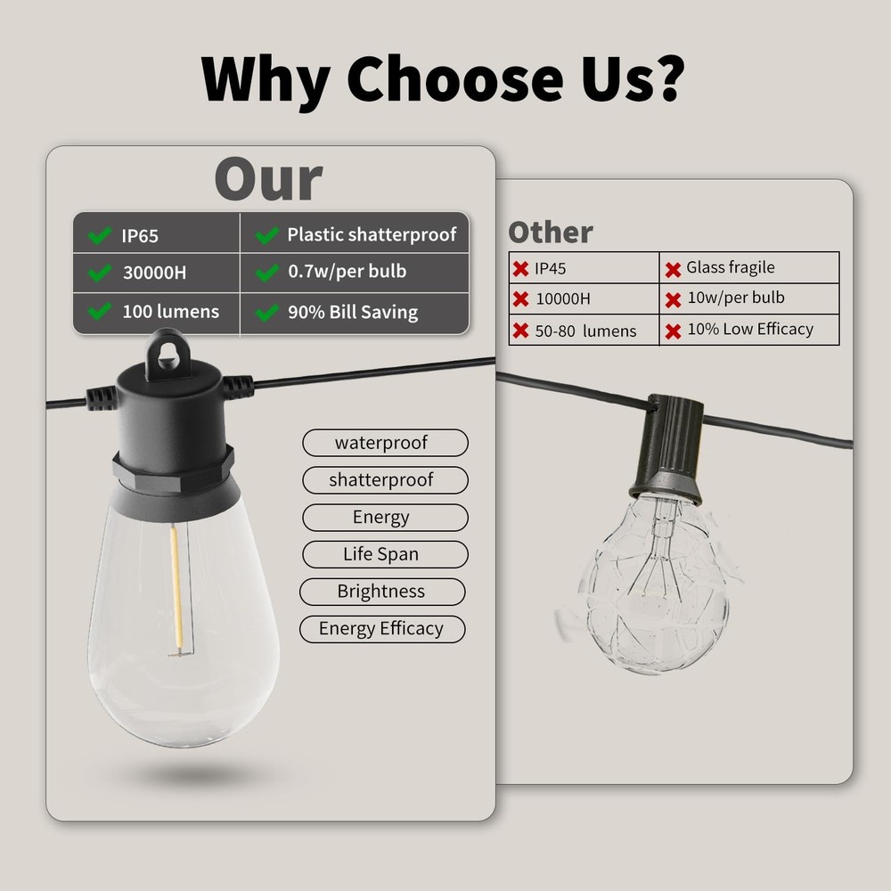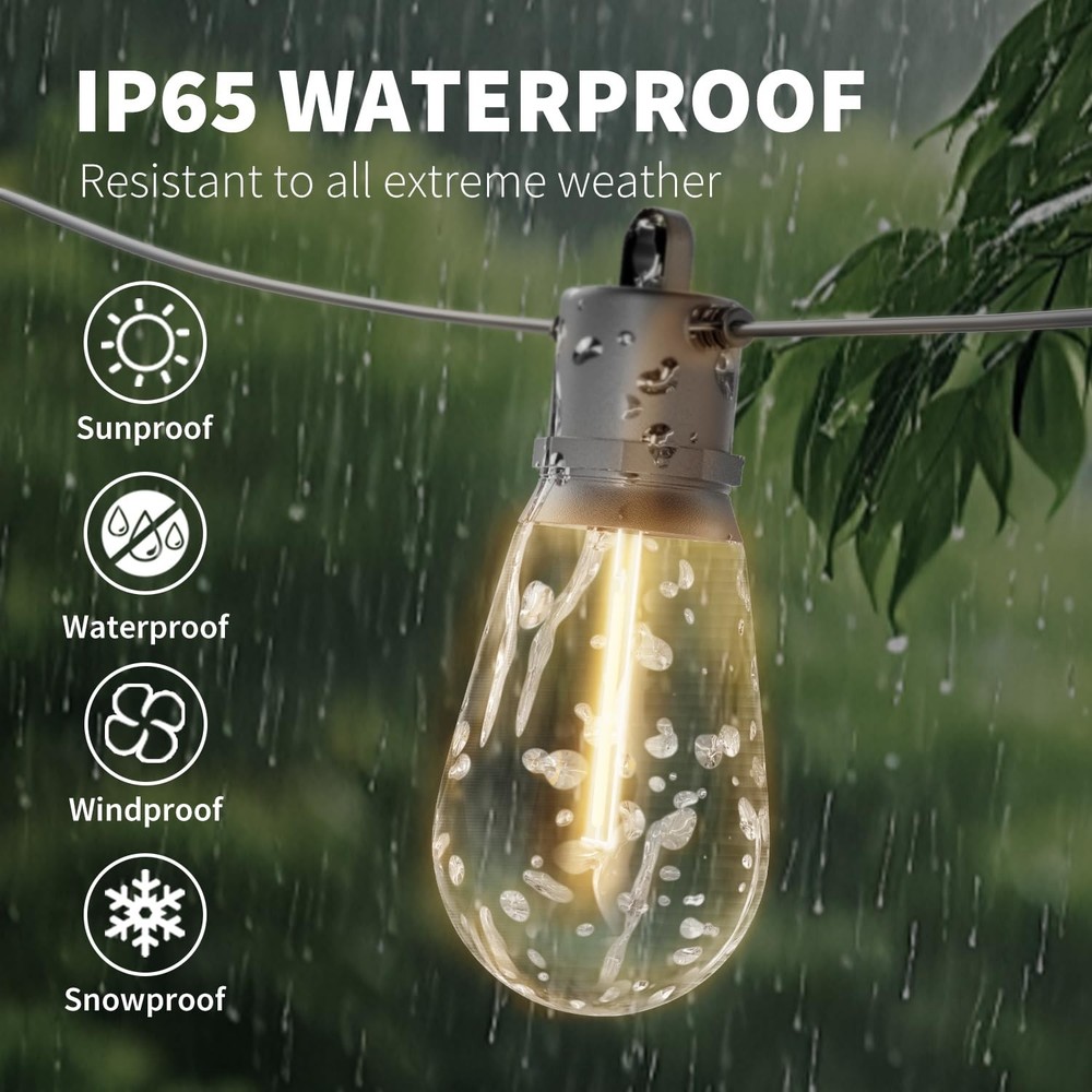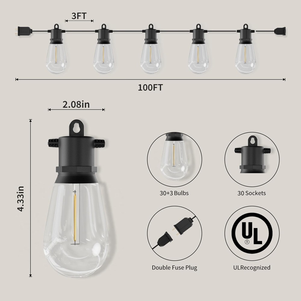 100 FT String with 33 Bulbs: Thi s100 feet outdoor string light comes with 30 durable, shatterproof S14 bulbs and 3 spare, providing reliable and long-lasting illumination. Perfect for patios, gardens, or events, the length is ideal for various setups, enhancing any space with warm and inviting lighting Weatherproof for Outdoor Use: With an IP65 waterproof rating, these string lights are built to endure rain, snow, and extreme temperatures. They're perfect for year-round use, ensuring consistent performance and durability in any outdoor environment Shatterproof Bulbs for Durability: The included S14 bulbs are impact-resistant, making them safer and more durable than traditional glass bulbs. These shatterproof lights are designed to withstand outdoor conditions, ensuring your space stays beautifully lit without worries Energy-Efficient LED Bulbs: The energy-saving bulbs offer warm illumination that’s both bright and economical. Ideal for creating a cozy and welcoming ambiance, they help lower electricity costs while providing excellent lighting for any occasion Simple Installation and Versatility: Featuring simple hanging loops, these LED string lights are quick to install on fences, pergolas, or trees. Their versatile design makes them suitable for various uses, from casual gatherings and weddings to everyday outdoor decoration
