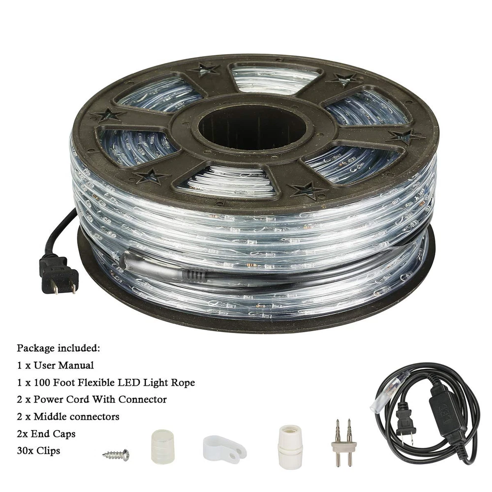 Description: Our LED rope lights(No Remote) are great for decorating stairways, railings, ceilings, desks, windows, boats, clubs, parties, galleries and special holidays. This LED rope lights are encased in highly flexible PVC tubing . Feature Suitable for decorating stairways, railings, ceilings, desks, windows, boats, clubs, parties, galleries and special holiday The structure is simple, clear, convenient installation, cost-effective Energy-saving and longer-life Crystal clear pvc tubing for durable use and brighter Easily to bend into any shape Light healthy, no radiation, no pollution Protection of , DC power drive, avoid frequent flash can cause eye damage High flexibility, temperature sustainability, and uv resistance 100FT Specifications: Color: Warn White/ Cold White/ Blue/ Multicolor /Red Total Length: 100 Ft LED Bulbs:1080 Tube Diameter: Φ10mm Beam Angle: 45° LED Quantity:36 LEDS/m Package included: 1 x User Manual 1 x 100 Foot Flexible LED Light Rope 2 x Power Cord With Connector 2 x Middle connectors 2x End Caps 30x Clips Please Kindly Note: only LED strips are waterproof and connectors are non-waterproof. Safe and reliable: This led rope lights has high-quality copper wire, which makes it have excellent electrical conductivity, provides stable lighting and guarantees the life of the LED.(No Remote ) Outdoor rope lights waterproof(No Remote ): The deck lights cord has excellent waterproofness, protection IP65, very suitable for long-term indoor or outdoor use (note that the plug is not waterproof). Easy to install and cut off: The rope lighting device can be directly plugged into a household power socket. And it can be cut off between each LED without damaging the remaining light bars. It can also be extended with a connector (with instructions for use). Suitable for various occasions: any shape that can meet your indoor and outdoor decoration needs. It is suitable for providing decorative lighting for buildings, windows, sidewalks, terraces, gardens, fences, porches, restaurants, clubs, bars, boats, stairs, railings, parties and holidays. [After-sales service]-If you have any questions about the rope lights, please us, we will provide you with the best solution.