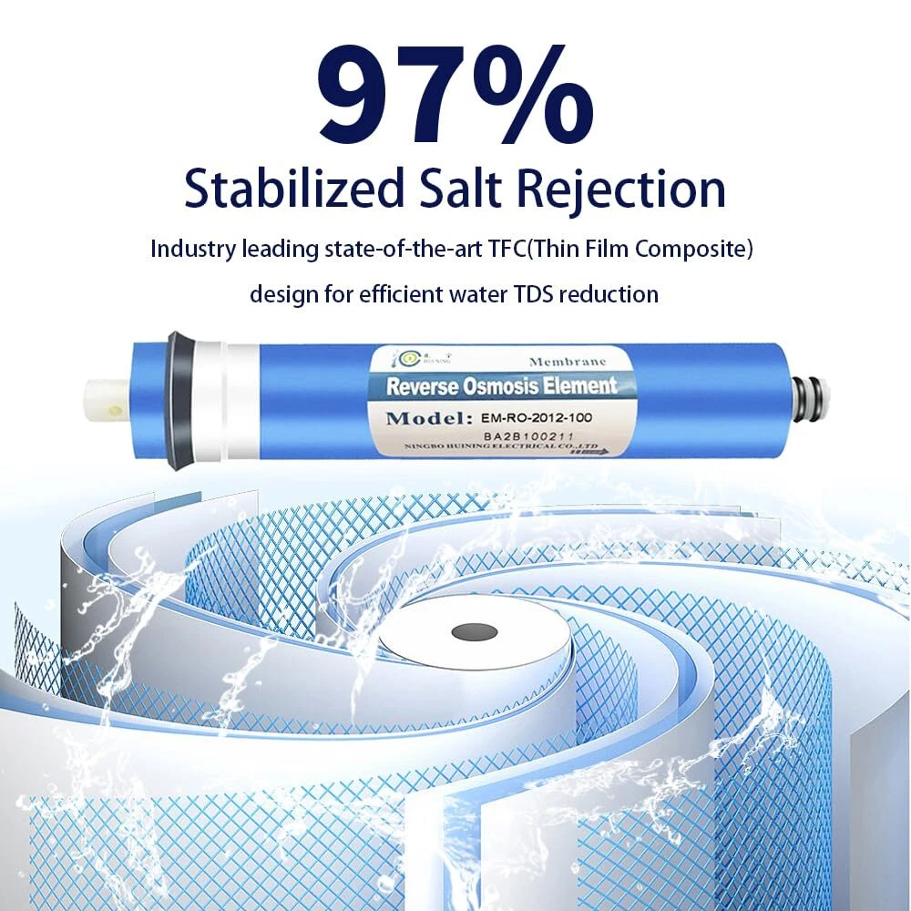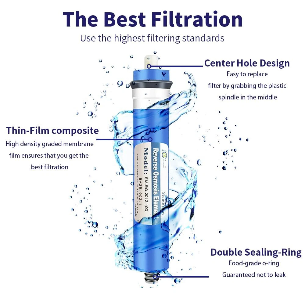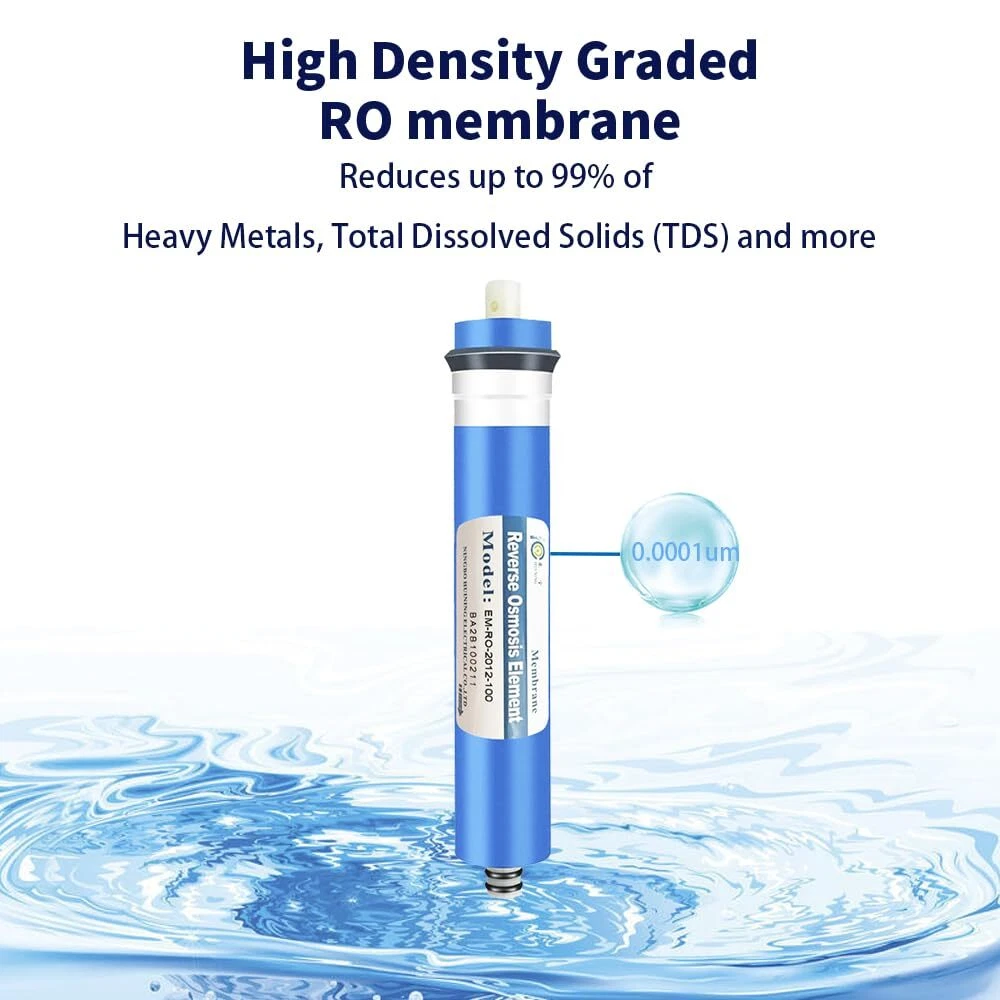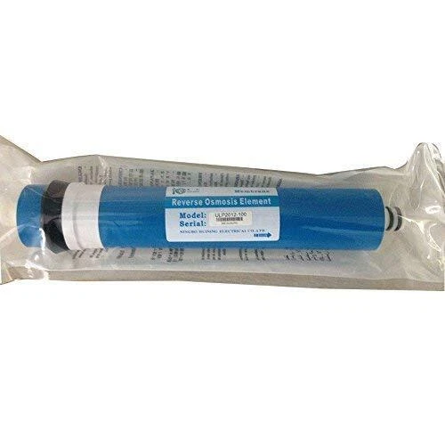 Warranty 6-Month Money Back Guarantee for manufacturing defects Life-time Free Technical Support Specifications: Model:RO-2012-100 Compliance: NSF/ANSI Standard Rejection Rate:97.5% Average Permeate: 100 GPD(0.28 m³/d) Water Recovery Rate: 15% Replacement Cycle: 15 - 24 months (recommended) Compatible Membrane Housing: 1812/2012 Housing Testing Parameters Feed Water Pressure (MPa): 30-100 psi Temperature: 40 - 110°F/5-45°C PH : 3.0 -11.0 Max TDS: 1000 MG/L Solution Concentr.NaCl(ppm): 250 Turbidity: <1.0 NTU Max SDI <4.0 Hardness: <5 GPG Iron: <0.1 Note: If you have chlorinated water, we recommend you use a Carbon/Sediment Pre-Filter. The residual chlorine in municipal or city water will destroy the membrane. If hardness is too high, we recommend you install water softener before RO unit. Package 1 * 100 GPD Ro membrane Life time :15-24months as your feed water quality Universal Standard Size - 100 GPD Reverse Osmosis Membrane, fits all standard 2” inner Diameter (ID) membrane housing 11.75” X 1.75” The Best Filtration - Density graded membrane film ensures that you get the most filtration and surface area coverage ,use life Life time : 24months as your feed water quality Made to Last - Airtight vacuum sealed packaging .This dry membrane easy to stock but before use them you must to unpack and set up into housing wet it for 2hours after can working well High Standard Filtration - Verified by independent laboratory testing to meet NSF / ANSI 58 Standard