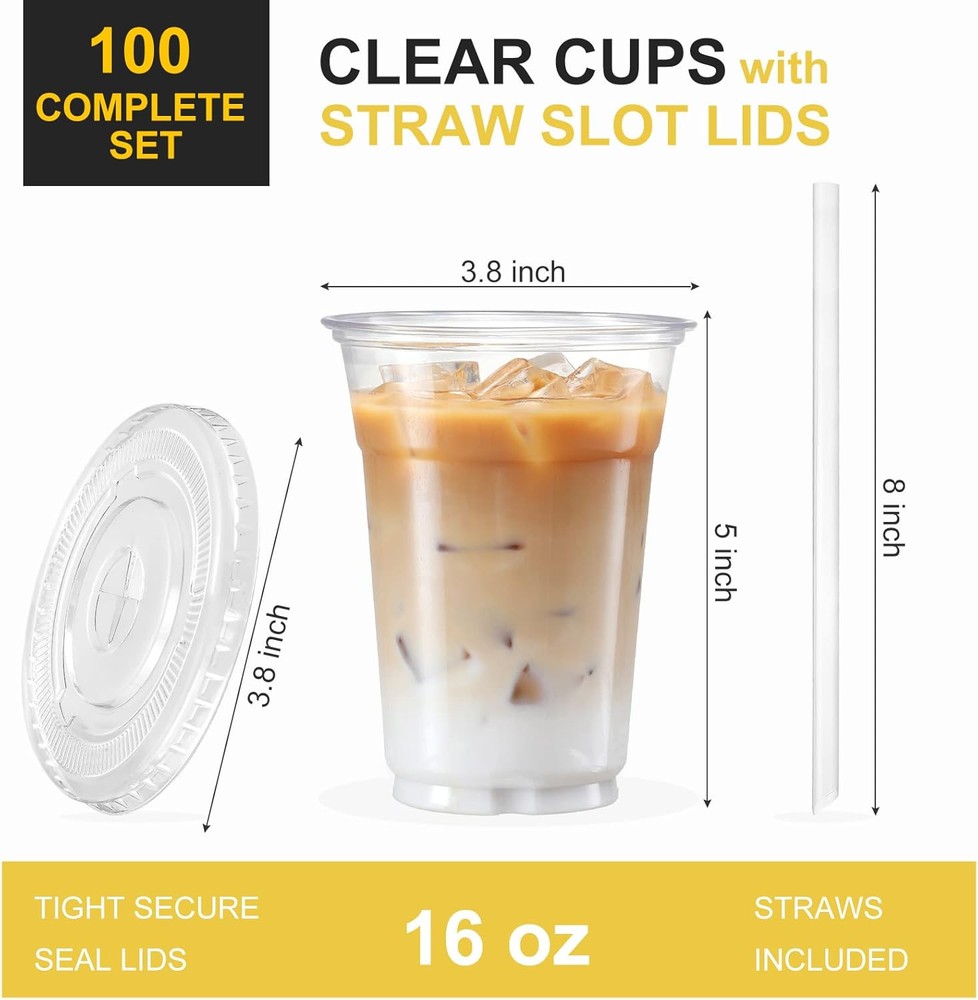VITEVER [100 Sets - 16oz] Plastic Cups with Lids and Straws, 16 OZ, Clear Product Details Brand: VITEVER Color: Clear Special Feature: Bpa-free Style: Modern Theme: Holiday Recommended Uses For Product: Home Occasion: daily Included Components: cups Specific Uses For Product: Cold Drinks Shape: Round Pattern: Solid Product Care Instructions: Machine Wash Age Range (Description): Adult Material Feature: Recyclable Reusability: Disposable Unit Count: 100.0 Count Product Dimensions: 3.8"W x 5"H Material Type Free: BPA Free Number of Items: 100 Manufacturer: VITEVER Size: 16 OZ Item Weight: 4.44 pounds Country of Origin: China Item model number: PPCWLI100 MaterialCapacity: Plastic16 ounces 100 SETS IN PACK: The set contains 100 sets of cups, enough for large uses or as a reserve for homemade coffee. Each one is 16oz of capacity, which is the proper size for daily, and tapered shape would fit perfectly in cupholders. It also comes with secure lids and individually wrapped straws, no extra purchase needed. SUPERB STURDY QUALITY: The cups are made of high-quality PET plastic that is food-grade tested, totally BPA-free, non-toxic and odorless. This ultra durable PET material is much thicker than original disposable cups and you can even reuse it after washing if you want. They are quite sturdy and crack resistant but still keep light weight for to-go use. COMES WITH COMPATIBLE LIDS & STRAWS: The snap-on lids are slotted and rim designed to fit straw and ensure a secure and perfect fitting to prevent frustrating leakage and spill when added for to-go occasions without popping off. And it also keeps dust or flies out and makes drinks inside fresh. CLEAR CUPS FOR VARIOUS USES: The clarity of these disposable plastic cups presents an upscale appearance while also providing great visibility of things inside. Perfect for all kinds of drinks like iced coffee, iced tea, juice, lemonade, cocktail, smoothie, milkshake, bubble tea, water, soda and sangria. EXCELLENT IN MULTIPLE OCCASIONS: These disposable cups are perfect for homemades, parties, holiday celebrations, picnics, BBQ, get-together, to-go, tailgate, special events and everyday use. And it is also a great choice for restaurants, drinking bars, coffee shops, cafes, and a good gift ideal as well.