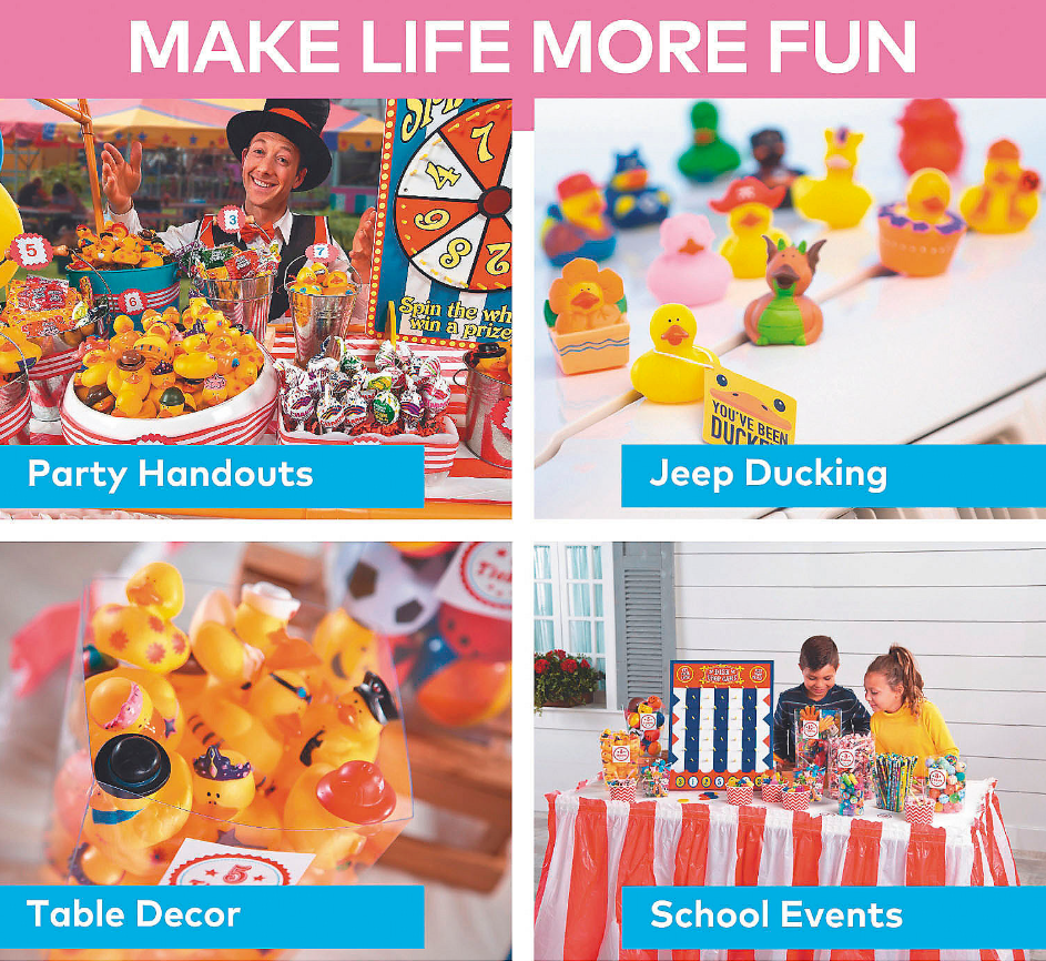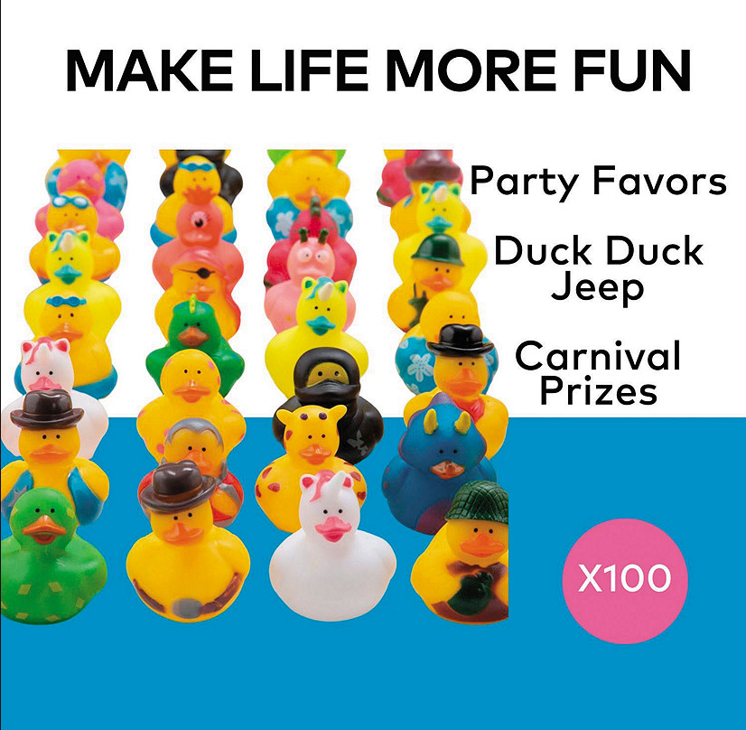 • WHAT'S INCLUDED: This set includes a mega assortment of 100 rubber ducky toys in a variety of adorable designs, including construction workers, snorkelers, pirates, hippies, sheriffs, princesses, firefighters and so much more. • FUN DESIGN: These brightly colored vinyl rubber ducks are dressed for whatever the day brings. Duckies do not float upright. • GREAT FOR KIDS: Kids of all ages will love these adorable rubber duckies! They're great giveaways for children’s events, rubber duck races and birthday parties. • HOME & PARTY USE: Tuck these rubber duckies into gift bags or use them as fun table decorations that party guests can take home with them. Or keep them in your car to place on Jeeps. It's called Jeep ducking! Product Description: A rubber duckie for anyone and everyone! Whether you’re looking for birthday party favors or fun table decorations, look no further, because this mega assortment of rubber ducks has you covered! Kids and adults alike will be entertained by the whimsical design of this assortment of toys. They make great favors or prizes at parties and school or church events too. Think these rubber duckies are fun? Check out our site because we have a wide variety of other fun and colorful rubber duck characters. Collect them all! Specs: Size: 2” Quantity: 100 Material: Vinyl • Assortments are subject to change at any time and may vary from picture shown. Substituted items will be similar in nature and just as cute!