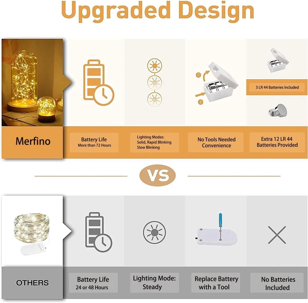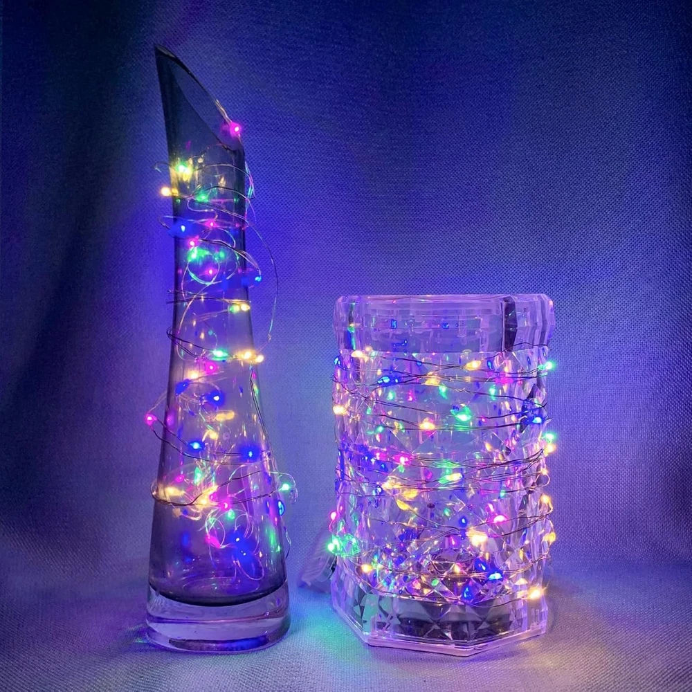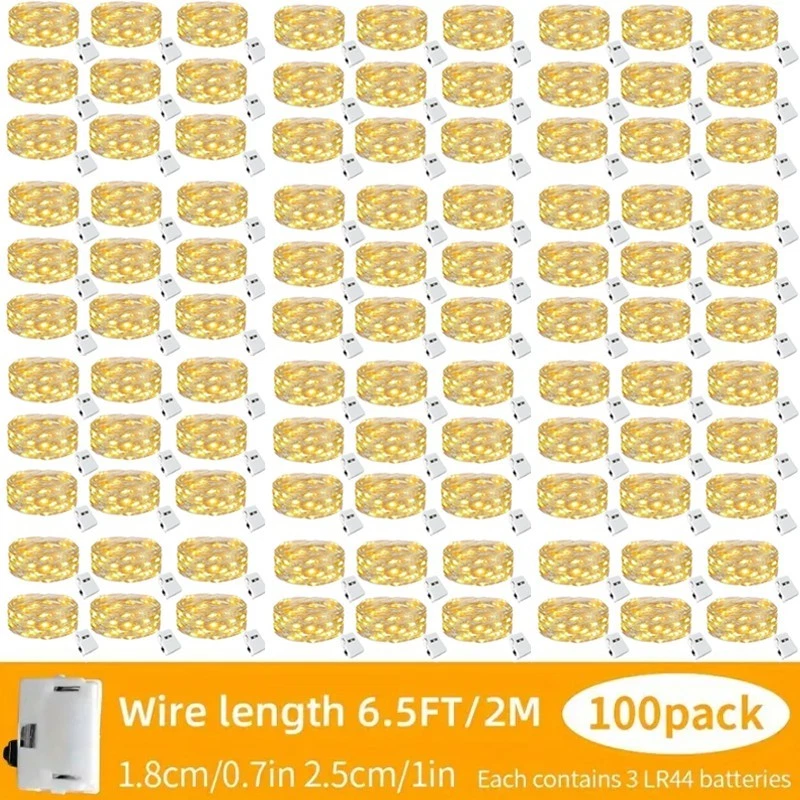 Feature: High brightness, low power consumption Energy-saving and environmentally friendly. Powered by battery (battery included) High flexibility - soft plastic rope, soft and flexible, can be wound around anywhere. Add decoration to your computer, Christmas tree and workbench, easily creating a festive atmosphere. Specification: Cable material: Copper Cable length: 2 meters Number of LEDs: 20 Color: Warm white/Multicolor Function mode: Always on Waterproof rating: IP65 Product quantity: 100 Note: Copper wire has waterproof properties. You can place it wherever you like (but the CR2032 battery compartment is not waterproof, please keep it away from water and damp environments)