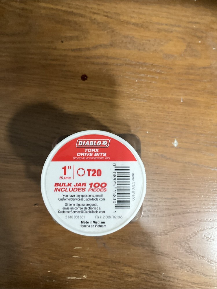 This is a 100-pack of Diablo 1 inch #20 Torx Drive Bits by Diablo, a brand known for quality power tool accessories. The drill bits are designed for use with power tools and have a Torx drive style. Each bit is 1 inch long, making them ideal for various drilling tasks. You will receive the exact item picture please check out my other listings!