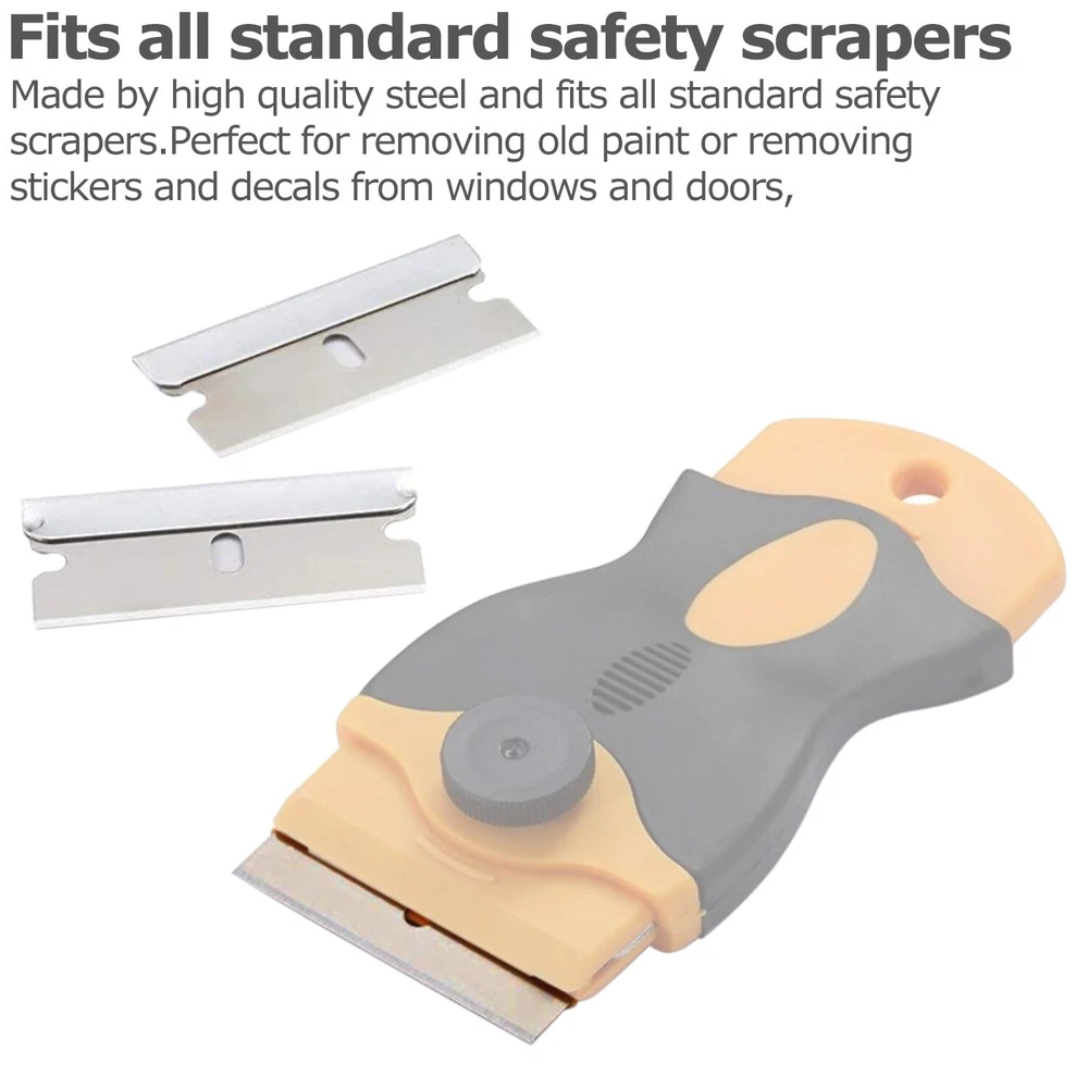 100 PCS Razor Blades Single Edge Extra Sharp Heat Treated Safety Knife Scrapers Features Single Edge Extra Sharp Laser Sharpened Each Blade Protected By Sleeve Heat treat blades Perfect for use as or in scrapers Specifications Material: Steel Quantity: 100pcs Dimensions: 1.5"x0.8" Items Included 100 PCS Razor Blades
