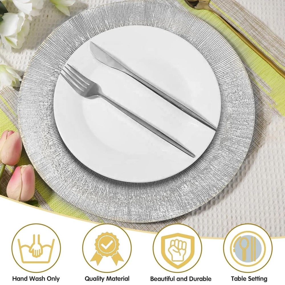 Store category Sign Up Now ! You may also like Product Description Bullet Points: Enough Quantity: Catering to event planners and homeowners, these 100 pieces of gold textured round dinner plates provide a sufficient quantity, ensuring an efficient tableware solution for any reception needs Improved Table Setting: Constructed from high-quality gold PP, these charger plates feature a distinctive textured surfaces for a sophisticated design. Improve your dining experience while making your guests feel special and valued with this elegant addition to your table setting Maintain a Clean Table: Our gold charger plates boast a wide edge design and suitable size that effectively prevents food spillage, making each dinner party easy. Each plate is approximately 13 inches in size and also increases stability and practicality Wide Application: Improve your dining experience with these gold charger plates that add a touch of elegance to any occasion. Perfect for weddings, birthdays, and cultural events, they're suitable for both indoor and outdoor dining and make your food look more attractive, adding to the fun of dining Simply Clean: Improve your table setting with these exquisite gold charger plates that are crafted for easy use and convenient maintenance. Simply wipe them clean with a damp cloth and store them at room temperature for their next use Add an elegant touch to weddings and special events with our bulk gold charger plates. With a sufficient quantity and unique texture on the surfaces, these plates also increase stability and practicality. Store at room temperature for long-lasting use. Specifications: Product name: Sliver Charger Plate Product color: Sliver Product material: PP Product size: about 33x33x1cm/13x13x0.4 inches Packing List: 100* Sliver Charger Plates Notes: 1. Due to different lighting and screen settings, the item color may be slightly different from the picture. 2. Due to different manual measurements, please allow a 1-2cm difference in size. Payment Delivery details Terms of sales About us Feedback & DSRs Payment Before you palce an order, please kindly make sure that you have a paypal account. We accept PAYPAL payment only. Payment should be completed within 2 days after auction closed, or unpaid dispute will be filed for an closing auction. An unpaid case will be filled after 4 days. Delivery details We ship to your eBay address. Each package will be shipped to US by UPS Regular Parcel with tracking number. Please check your shipping address carefully before checkout, it can't be changed if order completed. All items will be shipped within 1-2 business day upon receipt of payment.Orders placed on weekend will be shipped within 3 days. If you do not receive your item in 7-10 business days.please contact us immediately for further assistance. We will be responsible for any damages or losses incurred in the shipping process. About us We maintain high standards of excellence FIVE STAR and strive for 100% customer satisfaction! Positive Feedback is very important to us. We hope that you contact us immediately Before you give us neutral or negative feedback, so that we can satisfactorily address your concerns. We promise to offer the lowest price and high quality produce. Our working time: From Monday to Friday(9:30 am to 18:00pm), we don't working on holidays ,hope you can understand and know that , thank you. Please always talk to us via ebay Message. We appreciate your business and look forward to growing our e-Bay sales with satisfied customers. Feedback Contact us If you have any questions, please feel free to contact with us by ebay Message during our business hours ( 9:30a.m. to 5:30 p.m.), or email us through eBay, we will try our best to help you to resolve it. For any presale or after-sale questions,please do feel free to email us! Due to the time difference, each email will be replied within 1 working day,and weekend will be delayed a bit. Feedback