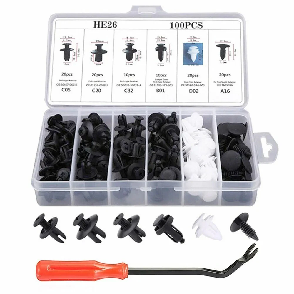 Features High quality material Bumper clips are made of high-quality Black nylon Material, anti-wear and anti-corrosion, would not break or crack easily during use. It can allow you to quickly and easily remove car door panel without any damage to them. Easily access into confined areas. 100PCS 6 Different Sizes Fasteners clips hole sizes for the OEM replacement of Ford, GM, Chrysler, Toyota, etc. But it means not only use for these car, this kit can also meet your other needs as well. Fit Most Cars Universal for most of car models, such as Audi, BMW, Cadillac, Chevrolet, Daewoo, Daihatsu, Dodge, DMC, Ford, General Motors, GMC, Honda, Hyundai, Jeep, Kia, Mazda, Mercedes, Mini, Mitsubishi, Renault, Rover, Saab, SEAT, Skoda, Subaru, Tesla, Toyota. Most Convenient and Space Saving Comes with a plastic box of each separate storage. Compact size, light weight were good for the cars. Allows to freely DIY your vehicle accessories at anytime you wanted. It is definitely cheaper than going to the auto parts store. Widely Application These push clips are widely used for trim panel clips, door trim clips, door Panel clips, bumper clips, fender clips, engine cover and splash shield retainers replacement. It always covers some applications include telecom equipment, motor vehicles, domestic appliances, furniture and electrical equipment. Specification Retainer Clips Material: Nylon Color: C05: 20pcs Black C20: 20pcs Black C32: 10pcs Black B01: 10pcs Black D02: 20pcs White A16: 20pcs Black Fastener Removers Color: Yellow Size: 5.5" x0.78", 6.3"x0.85",7.3"x0.85", 8.7"x0.8"(LxW) Screwdriver Color: Red Size: 12.4" Clip of C05 Screw Type Clip Retainer Rivet Size Approx: Head Diameter: 15mm Stem Length: 12mm Fits Into 6mm Hole For GM Replace 20426301 For Mazda Replace 9926-50-625 For Toyota Replace 90467-06017 For Toyota Replace 90467-06017-20 For Toyota Replace 90467-06017-41 For Auveco A14260 Clip of C20 Fender Liner Clip Splash Shield Blind Rivet Fits For Mazda Replace FB01-56-964 Fits For Honda Replace 90675-SB3-003 Fits For Nissan Replace 63876-95596 Fits For B16 B18 B18C B20 H22A EK9 EG6 Fits For Accord Civic Prelude CR-V Del Sol CRX Fits For INTEGRA GSR S2000 AP1 MUGEN Fits For TYPE R Si Size Approx: Head Diameter: 20.6mm (0.81") Stem Length: 9.5mm (0.37") Fits Into 8mm (0.32") Hole For Auveco A16000 Clip of C32 Push-Type Retainer Head Diameter: 20mm Stem Length: 13mm Fits Into 8mm Hole Fits For Mazda 6 2002-2006 Fits For Mazda 323 1998-2003 Fits For Ford Aspire Fits For Mazda Replace B092-51-833 Fits For Ford Replace MB-455-56143 Fits For Kia Replace MB455-56-143 Fits For Nissan Replace 09409-09302 Fits For Hyundai Replace 86590-28000 For Auveco A17632 Clip of B01 Front & Rear Bumper Retainer Push Type Clip Head Diameter: 20mm Stem Length: 18mm Fits Hole Size: 10mm For Honda Replace 91503-SZ5-003 (1996-On) For Acura Replace 91503-SZ5-003 For Auveco A20564 For PAS9282, PAS938 Clip of D02 Interior Trim Board Retainer Clip Top Head Diameter: 13mm Middle Head Diameter: 16mm Bottom Head Diameter: 18mm Stem Length: 15mm Stem Diameter: 8.5mm x 8.5mm Overall Length: 20mm Fits For GM Replaces 94858299 Fits For Geo Prizm 1998-On Fits For Pontiac Vibe 1998-On Fits For Toyota Replaces 90467-10161 Fits For Sienna, Solara & Tercel 1990-On Fits For Previa 2007-On, Corolla 2003-On Fits For Lexus LS460, LS460L 1990-On For Auveco A18876 Clip of A16 Radiator Yoke, Fender & Bumper Shield Retainer Christmas Tree Type Clip Head Diameter: 17.8mm Stem Length: 20mm Stem Diameter: 7.6mm For GM Replaces 1595864, 1605396 For Ford Replaces 388577S For Ford Replaces W705589-S300 For Chrysler Replaces 6030441 For Auveco A11146, A15414 Package included 100pcs Retainer Clips 4 x Fastener Removers 1 x Red screwdriver