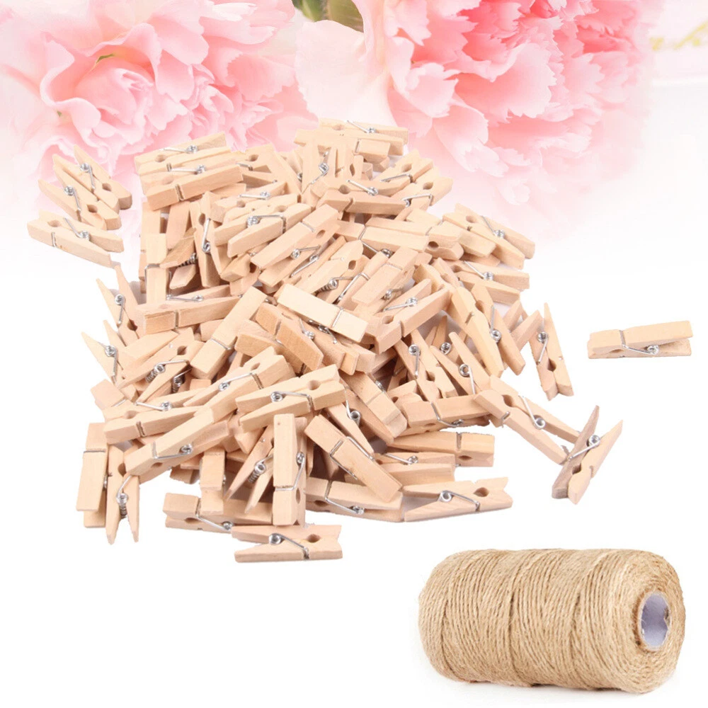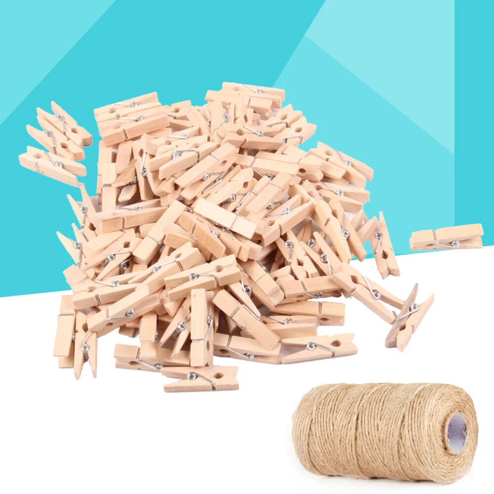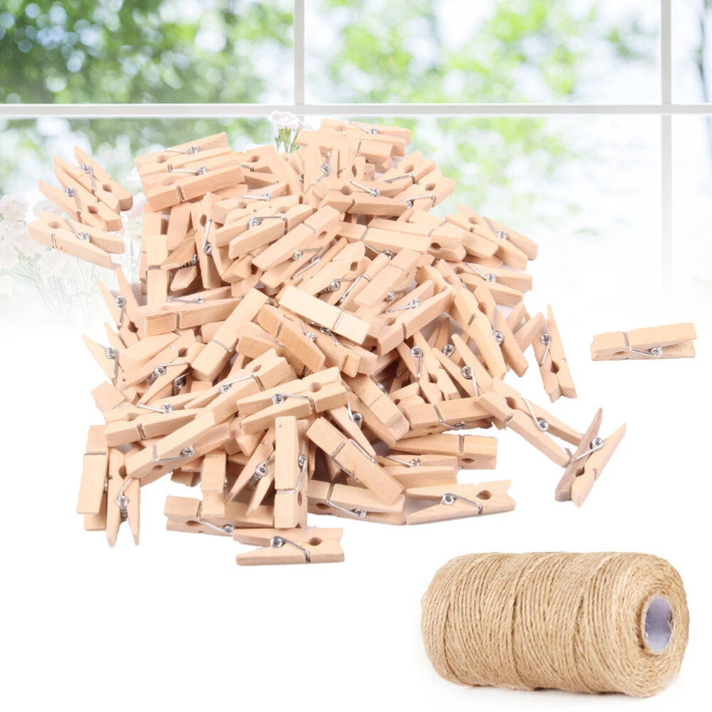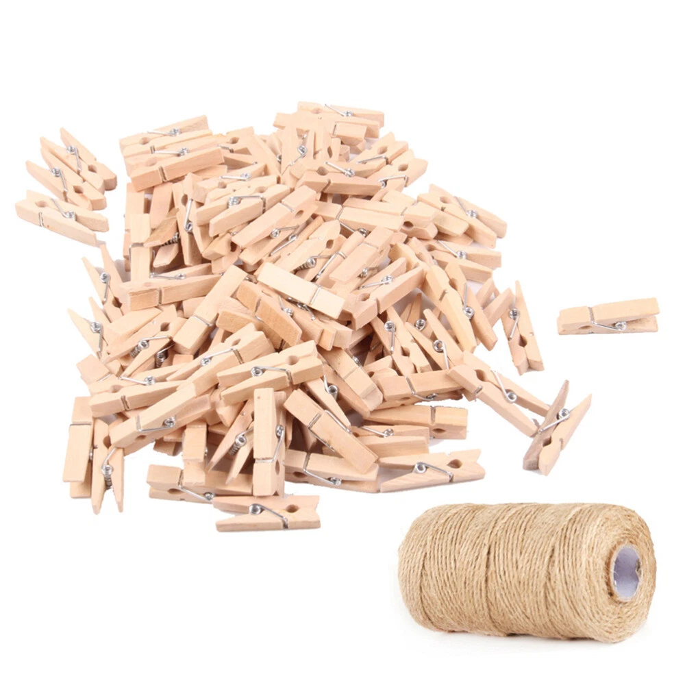100Pcs Mini Wooden Clothespins Pegs Photo Clips with Jute Twine for Crafts