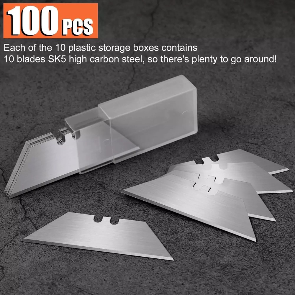 HIGH QUALITY SK5 HIGH CARBON STEEL: SK5 High carbon steel material is chosen to make razor blades utility knife blades refills high hardness and wear resistance. The excellent material makes utility blades for box cutter not easy to rust break and deform, have a longer service life, and are heavy-duty and practical utility knife blades. STANDARD BLADE REPLACEMENT: The razor blades utility knife blades refills are 1.26 inches wide at the top, 2.36 inches wide at the bottom, and 0.75 inches high. Standard size, suitable as a replacement blade for most folding knives, box cutters, and retractable knives, is a commonly used household tool. SHARP AND DURABLE: The razor blades utility knife edges are precisely sanded, polished, sharp, and durable, with good cutting performance. Use box cutter blades refills to cut quickly and the incision is smooth, great for cutting leather, rope, paper, carpet, rubber, cardboard, pipes, and more, and suitable for most DIY projects. PORTABLE PACKAGING: 100 pieces of box cutter blades refills are packed in 10 plastic storage boxes, 10 pieces in each box, convenient for daily use and carrying—enough quantity, perfect for sharing with family and friends to start your handmade creations. WARM TIP: If you encounter any problem using utility blades for box cutter, please get in touch with us immediately. We will solve the problem for you as fast as possible. In daily life, for the safety of your children, please put the razor knife blades where your children can't touch.