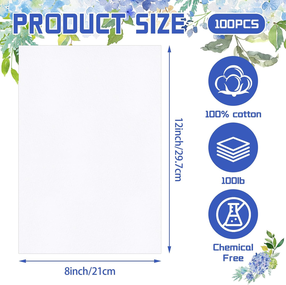 100-Piece Set of 12 X 8 Inch White 100% Rag Cotton Cold Press Watercolor Paper -