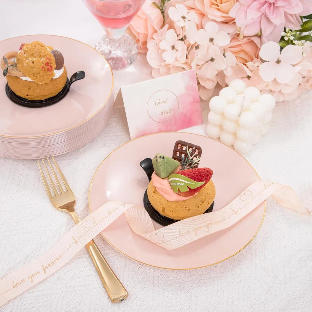 Premium Quality: Expertly made using heavyweight plastic construction for long-lasting strength, these pink plastic plates are resistant to breaking, bending and snapping. BPA-Free and non-toxic, this pink disposable plates are 100% food grade plastic ensures a safe eating experience for you and your guests. Elegant Appearance: 7.5inch gold rim plastic plates can hold more food and the gold rim make pink and gold plates look more refined and luxurious. For Every Occasion: This pink gold plates that is suitable for a variety of social events and occasions, such as for weddings, birthday parties, holidays, picnics, Suitable for banquets and all occasions. Good Value: Want more time to celebrate with your family? You can get rid of the pink plated plates or you can wash the pink dessert plates by hand and reuse them. Premium Set of Dinnerware: Our gold trim plastic plates are excellent options that you will get everything you need in this kit - plates (100 7.5inch dessert plates), which are perfect for events that you need to feel fancy or special.