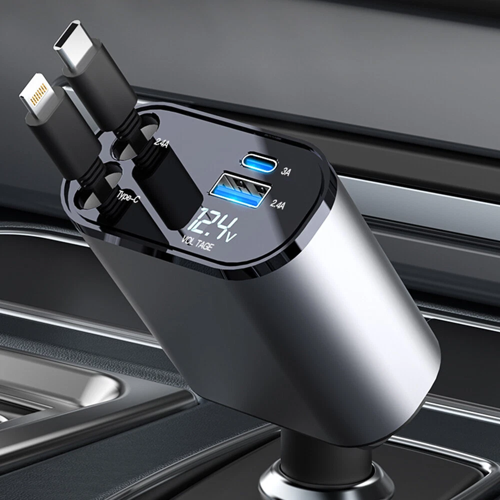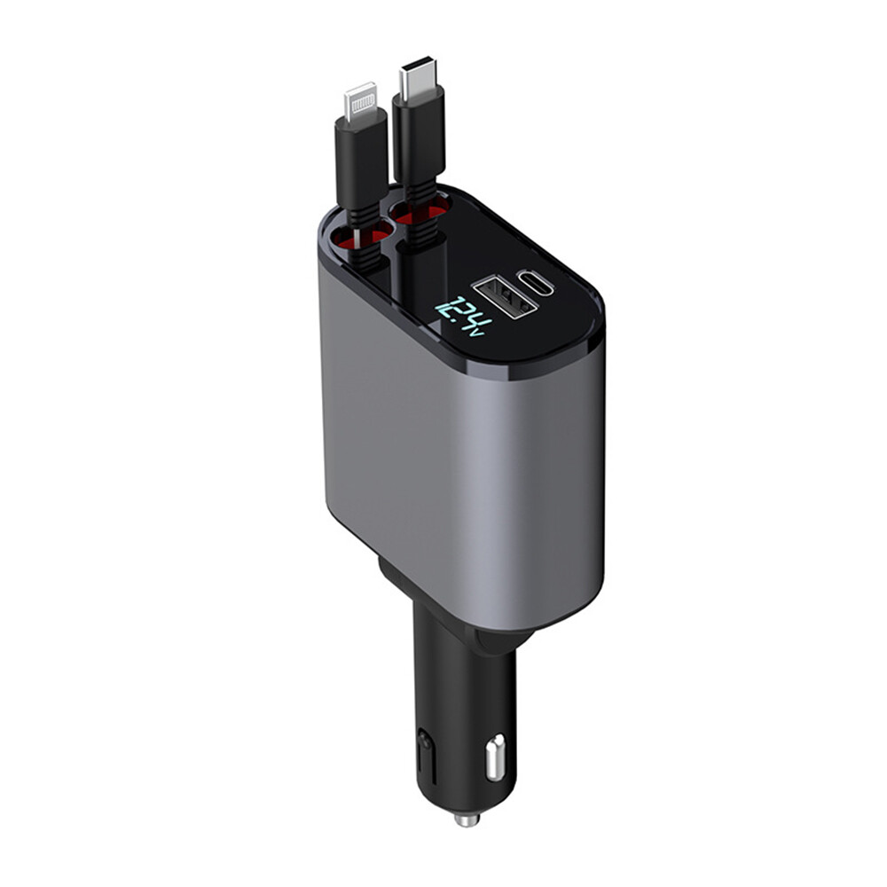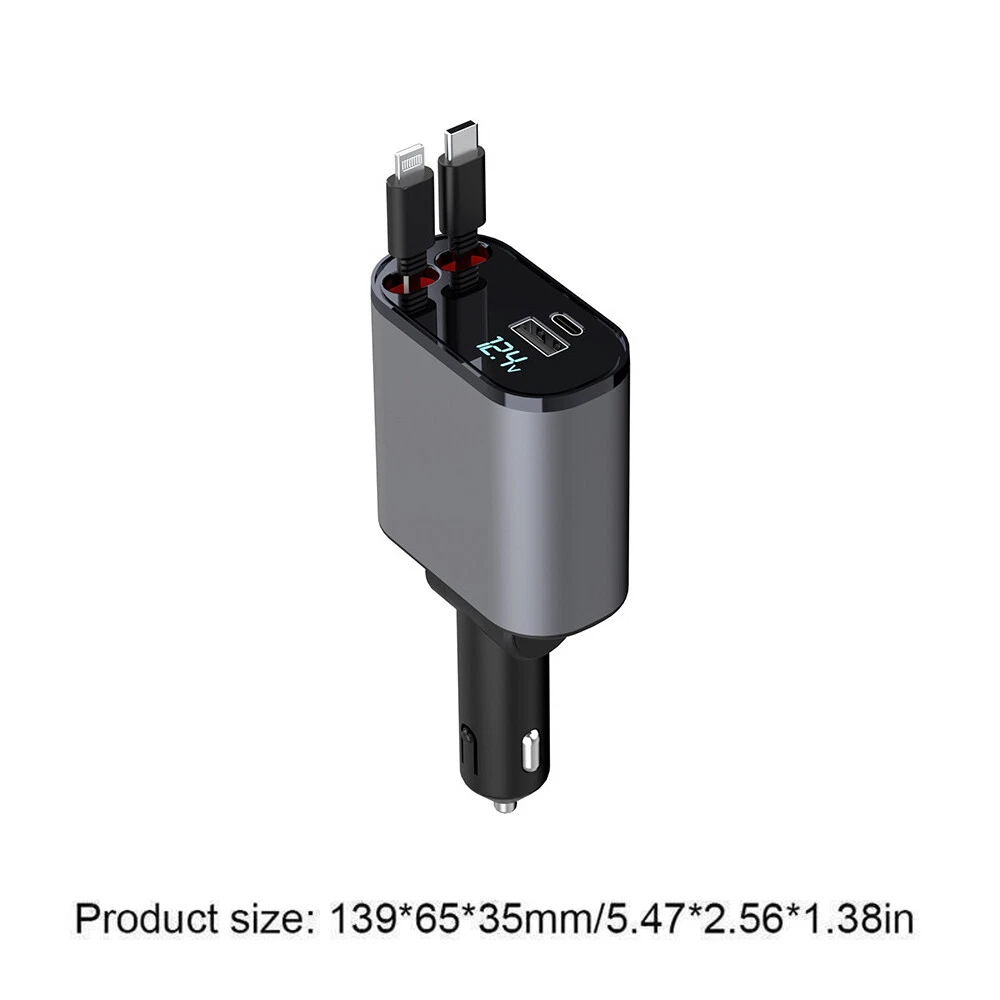 Features: 【4-in-1 Ultra High Speed Car Charger】This Multi-Car Retractable Charger comes with two retractable cables:Type C (PD) connector for fast charging of Type C cell phones, iPhone USB connector: max 12W. Type C Female Output: max 20W, 4PIN USB: max 20W. It can satisfy the charging needs of 4 people at the same time! The best gift for traveling. 【Quick Charge Voltage Display】100W quick charge, 5 times faster than ordinary chargers. Voltage digital display shows real-time voltage, convenient for you to check your car battery status. Car charger cigar socket input voltage is 10V/30V for standard and large vehicles. [WIDELY COMPATIBLE WITH CAR CHARGERS】This fast charging car charger is suitable for cell phones, tablets, laptops, wireless headphones, smartwatches, gaming consoles, drones and more. 【 Suitable for Various Vehicles 】 Retractable Apple Cell Phone Car Charger has a wide range of compatibility for cars, trucks, SUVs, RVs, etc., it is suitable for mainstream 12V-24V cars, the plug is firm and won't pop out even when driving on a bumpy road. 【Multiple Safety Protection Design】With Voltage Monitor Fast charging retractable car charger is made of high quality ABS and PC component materials, with over-charging, over-current, over-voltage, temperature control and short-circuit protection, which protects the device battery from over-charging damage. The car cell phone charger is built-in multiple overcharge detection smart chips to protect your car's electronic safety. Specification: Name: Fast charging car charger (TYPE-C+Apple) Color: Gray Item Type: Cables, Adapters and Sockets Model Name: Car fast charger Item size: 139x65x34.5 mm / 5.47x2.56x1.36 inches Item weight: 180 grams Material type: ABS+PC Style (optional): Type-C+For Apple Display voltage :DC 10-30V Input voltage :DC12-24V Type-C : 5V/2A, 9V/2A, 12V/1.5A (max 66W) Apple 5V/2.4A (max. 12W) USB: 5V/2.4A (20W max) Type-C Female: 5V/3A (20W max) Charging cable retractable length: 800 mm +/-30 mm Product Includes: 1× Fast Charging Car Charger (TYPE-C+For Apple) On Aug 1, 2024 at 14:48:22 PDT, seller added the following information: On Aug 30, 2024 at 21:11:05 PDT, seller added the following information: On Dec 4, 2024 at 23:41:02 PST, seller added the following information: