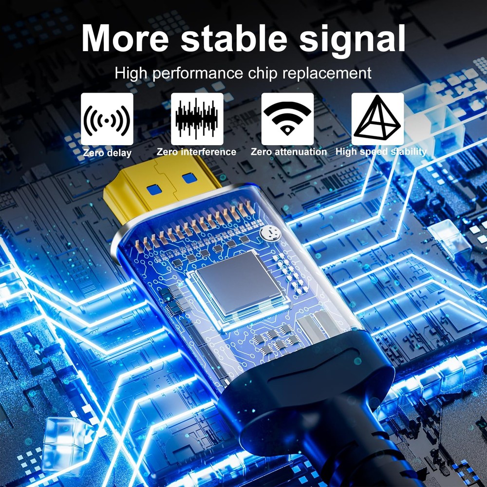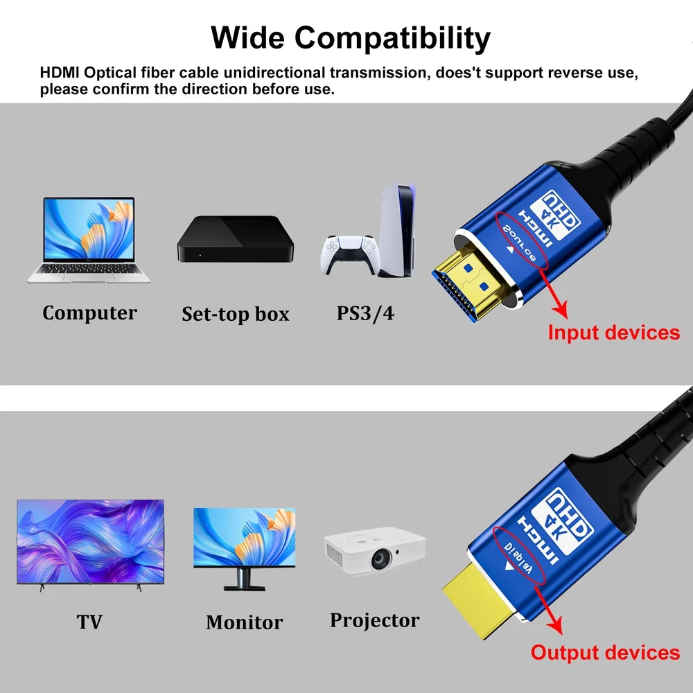 【Electromagnetic Interference Shielding】The hdmi fiber optic cable 100 foot incorporates a German chipset, ensuring compatibility with various devices and accurate conversion between optical and electrical signals. Compared to digital signals transmitted through copper cables, it is immune to electromagnetic interference. 【Long-Distance Transmission without Attenuation or Delay】 Use four high-quality optical fibers as the transmission medium, achieving light-speed transmission with no attenuation, no delay, and low power consumption. It supports 4K@60Hz 4:4:4 RGB backward compatible with 2K@144Hz, HDR10/eARC/CEC/3D/HDCP2.2, and is the ideal solution for long-distance transmission of 4K ultra-high-definition video. 【Lightweight, Thin, durability, and Portable】 The fiber hdmi 100’ has a diameter of only 4.8 millimeters, making it lightweight and thin. Its highly flexible and durability design makes wiring easier and storage more convenient, easily adapting to various wiring environments. 【Directional Connection】 The 100+ ft optical hdmi Cables has directionality. Connect the interface labeled "Source" to the input/source device (such as a player, PS, Xbox AV Receiver, etc.), and connect the interface labeled "Display" to the display device (such as a computer, HD TV). Otherwise, the display device will not work. 【QUALITY ASSURANCE】 If You Have Any Questions of 100 ft hdmi cable,please Contact Us Through Amazon And We Will Provide Professional After-sales Service And Online Response With In 24 Hours. 【Electromagnetic Interference Shielding】The hdmi fiber optic cable 100 foot incorporates a German chipset, ensuring compatibility with various devices and accurate conversion between optical and electrical signals. Compared to digital signals transmitted through copper cables, it is immune to electromagnetic interference. 【Long-Distance Transmission without Attenuation or Delay】Use four high-quality optical fibers as the transmission medium, achieving light-speed transmission with no attenuation, no delay, and low power consumption. It supports 4K@60Hz 4:4:4 RGB backward compatible with 2K@144Hz, HDR10/eARC/CEC/3D/HDCP2.2, and is the ideal solution for long-distance transmission of 4K ultra-high-definition video. 【Lightweight, Thin, durability, and Portable】The fiber hdmi 100’ has a diameter of only 4.8 millimeters, making it lightweight and thin. Its highly flexible and durability design makes wiring easier and storage more convenient, easily adapting to various wiring environments. 【Directional Connection】The 100+ ft optical hdmi Cables has directionality. Connect the interface labeled "Source" to the input/source device (such as a player, PS, Xbox AV Receiver, etc.), and connect the interface labeled "Display" to the display device (such as a computer, HD TV). Otherwise, the display device will not work. 【QUALITY ASSURANCE】If You Have Any Questions of 100 ft hdmi cable,please Contact Us Through Amazon And We Will Provide Professional After-sales Service And Online Response With In 24 Hours.