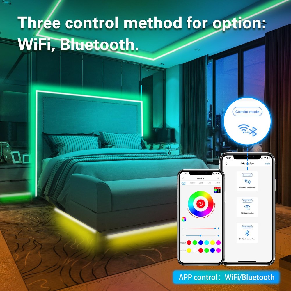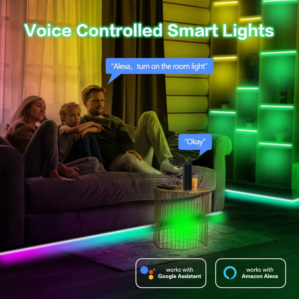 【100ft Ultra Long LED Lights】The WiFi led strip lights come with 2 rolls of 50ft, long enough to decorate an entire room. Your home will look gorgeous with the embellish of the light strip. The lights are wonderful decors for bedroom, living room, kitchen, cabinets, parties and Christmas, etc. 【Hands-Free Voice Control】The led light strips can work with both Alexa and Google Assistant. You can easily turn on/off the led lights, change the light colors and dim the brightness by simple voice commands. You can totally free up your hands to control your lighting environment and enjoy intelligent life. 【APP Remote Control】 You can control the smart WiFi led lights anywhere with your mobile phone by bluetooth or WiFi Connection, no matter you are working in the office or on vacation. Also, you can use group function to create a group for multiple led strips, and then activate them all with one click. 【Music Sync Mode】The led lights for bedroom has built-in high sensitive mic, supporting amazing music sync mode. It can detect all kinds of music, flashing and changing colors, brightness and the speed of the lights to the beat of the music and surrounding sounds creating romantic, relaxing, gorgeous and cheerful atmosphere for parties. 【Easy Installation】The led light strip comes with strong self-adhesive tape, controller, power adapter and very easy to be installed, no need other devices. You can easily install the strip lights in seconds with the adhesive on clean and dry surface. Just follow instructions on the user manual and your home will become colorful. Note: the led lights can be only used indoor, NOT waterproof. 【Timer Mode】The strip lights have a smart timer model. Never worry about forgetting to turn off your lights, set a timer for your rope lights when you wake up in your bedroom to bright your beginning of the day.