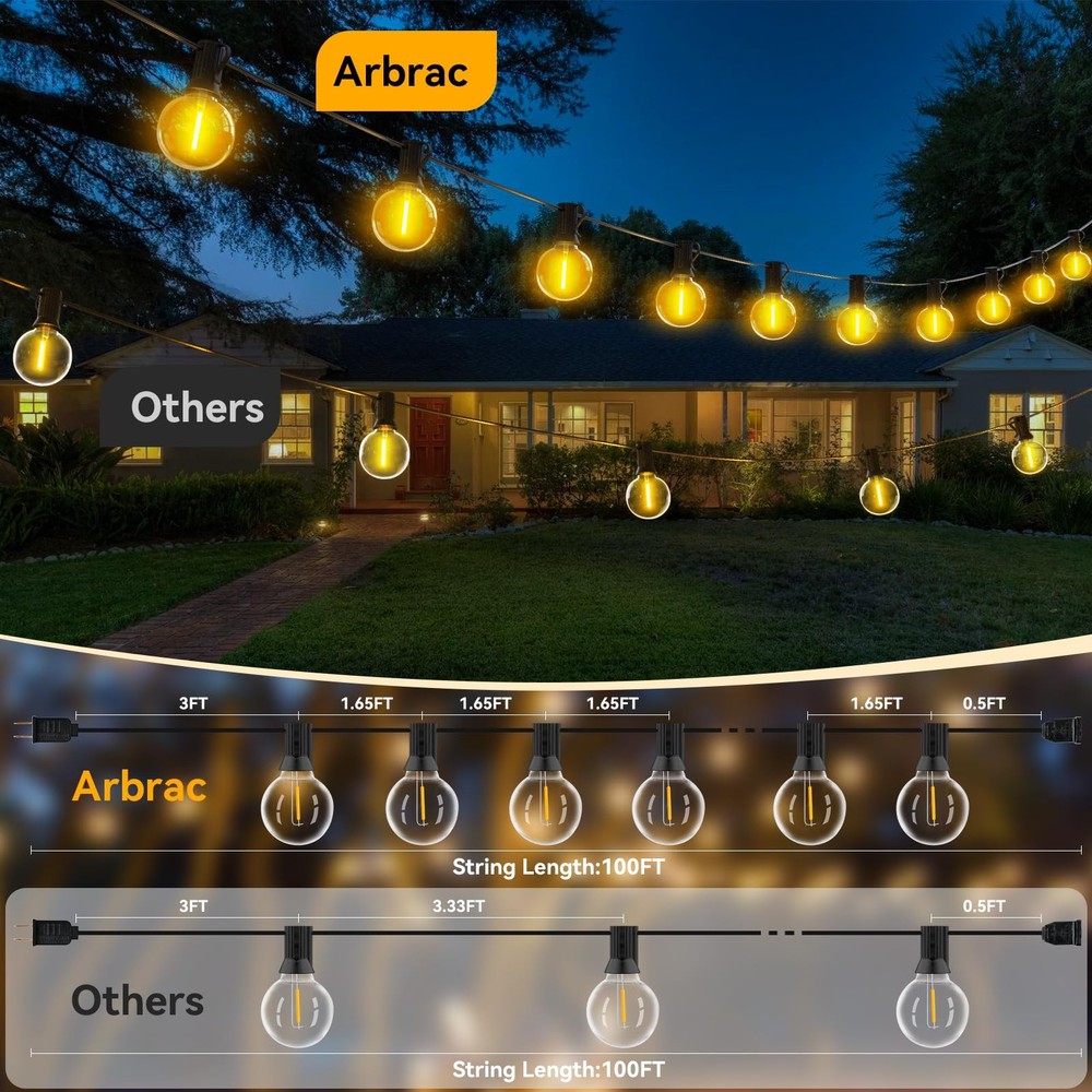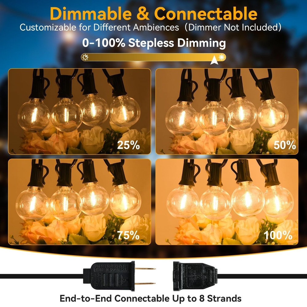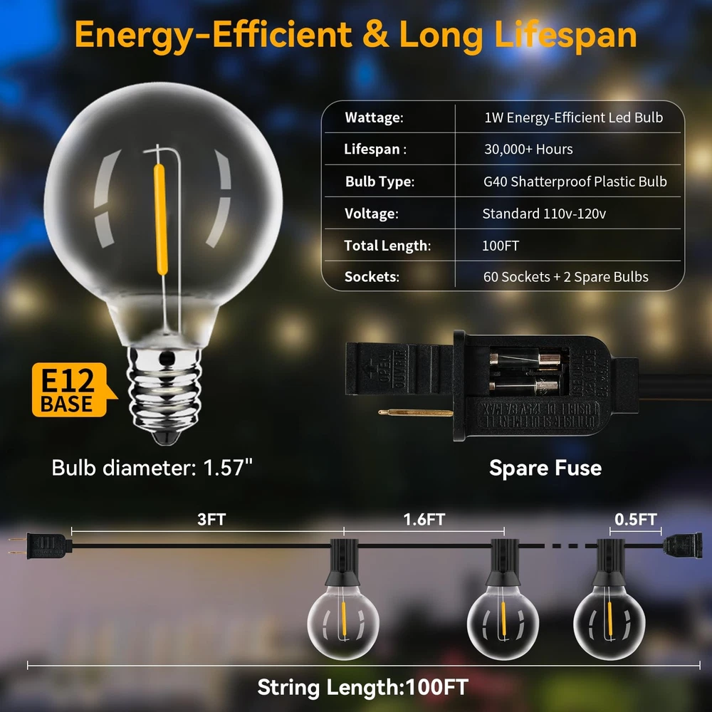 G40 LED String Lights: The modern creative decorative string light can not only be used for lighting, but also perfectly decorate indoor and outdoor parties, creating a romantic atmosphere, amazing scenery, and enjoying happy time with family and friends. brightness patio string lights are made of high-quality materials and waterproof technology, safe, flexible and practical, which can meet the lighting and decoration needs of different occasions. It is an ideal decoration for outdoor markets, lofts, apartments, gardens, pool areas, kitchen dining areas, dormitories, parties, Christmas, weddings, etc. Specification: Project: G40 Globe Patio Light String Color: Warm white Lamp length: 50/100Ft Number of bulbs: 50/64 plastic bulbs (4/4 spare) Voltage: 110V Rated power: 1W per bulb Installation suggestions: It is recommended to unscrew the bulb before hanging, place and fix the harness with an empty socket, and then tighten the bulb to complete the installation. Each bulb should be placed separately in case the strong wind or other conditions cause the two bulbs to be too close to break. 【Shatterproof and Weatherproof】Don't let weather or accidents dim your outdoor lighting. These string lights for outside use high light transmittance plastic bulbs that are shatter-resistant and wear-resistant, making them last longer than other fragile glass bulbs and perfect for outdoor use. With an IP44 waterproof rating, these outside lights are designed to withstand sunlight, rain, snow, and wind, you can rest assured that these lights will continue to shine brightly, no matter the weather. 【Energy-Saving & Dimmer Compatible】With dimmable capability (Dimmer NOT Included) and two spare bulbs for replacements, our outdoor lights will continue to brighten up your life even if some bulbs break or are removed. You can easily adjust the ambiance to suit any occasion. Elevate your outdoor space with our UL-listed led string lights that brighten up your patio, garden, backyard, rooftop, balcony, deck, porch, and more! 【End-to-End Connectable】 outdoor string lights are designed with end-to-end connections, allowing you to cover a larger area and customize the length to fit your specific needs. You can create a cozy atmosphere that extends beyond your home, perfect for gatherings, dinner parties, and weddings. 【Versatile Decoration】Add a touch of warmth and charm to any space with our string lights! With a beautiful warm white glow, they're a great way to add a cozy and inviting atmosphere to any occasion, including a cafe, bistro, pergola, birthday or nighttime pool parties, and even your bedroom and living room. Whether you're hosting a backyard BBQ, having a romantic dinner for two on your patio, or celebrating a special occasion, these lights will leave a lasting impression on your guests. 【100% Satisfaction Guarantee】At , we take pride in providing our customers with the best possible shopping experience, which is why we offer a 100% satisfaction guarantee on all of our products. If for any reason you're not completely satisfied with your purchase, please don't hesitate to reach out to us, and we'll make it right! Don't settle for mediocre outdoor lighting - add our premium string lights to your cart now and elevate your outdoor space to the next level!