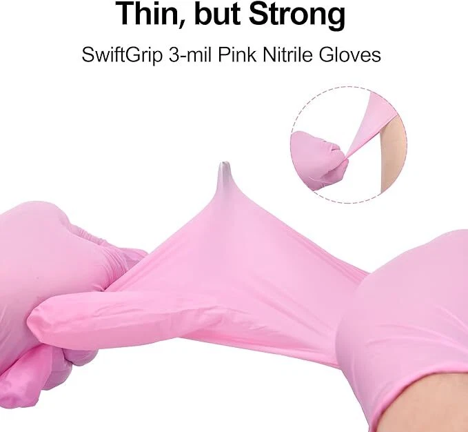 MEDICAL EXAM GLOVES: Our medical grade nitrile gloves passed rigorous medical glove quality tests. Thin but not "cheap", our 3-mil nitrile gloves provide good tactile sensitivity with reliable barrier protection from soil, grease & organic solvents. LATEX-FREE: Free of natural latex rubber, these latex-free nitrile gloves reduce allergic skin reactions to latex and protein; these non-latex gloves are stretchy and durable, and more puncture-resistant than similar latex gloves. FOOD-SAFE: Our powder-free food-grade disposable gloves can be used as food gloves for food processing, food prep, and food handling. As food service gloves they are lightweight and waterproof - an economical solution for frequent glove changes. SIZES & PACKAGING: 100ct boxes Case differently for small, medium, large, and XL sizes. These ambidextrous gloves have a snug fit for men and women. MULTIPURPOSE: SwiftGrip 3mil nitrile gloves offer great dexterity and comfort, ideal for light-duty tasks such as examination, healthcare, household cleaning, food prep, food service, janitorial service, esthetician, salon, and maintenance.