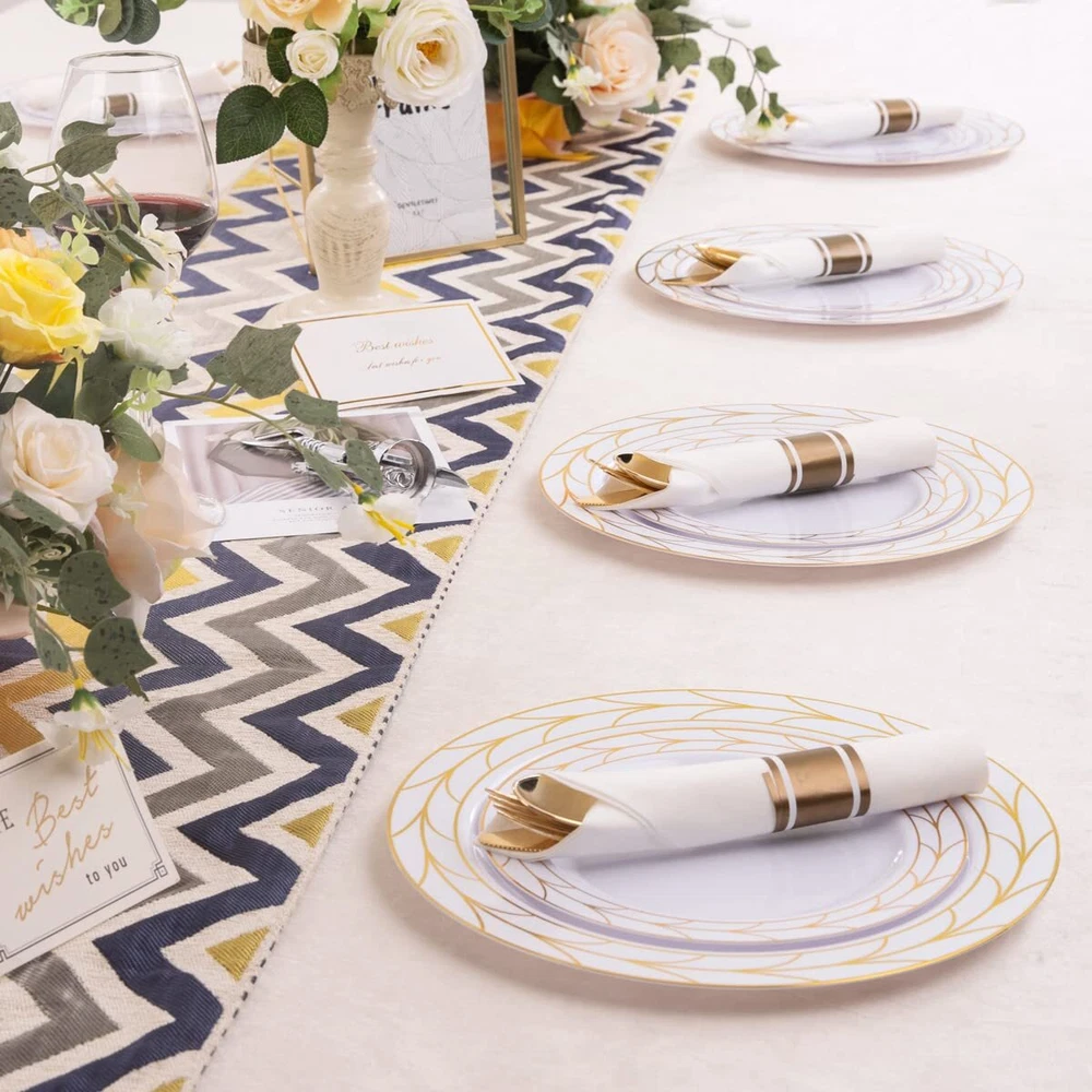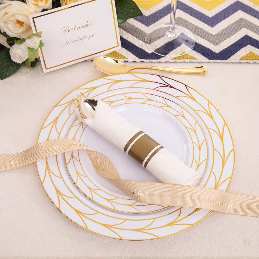 PLASTIC THANKSGIVING PLATES: Disposable Plastic Thanksgiving party plates set Including 50 10.25" dinner plates and 50 7.5" dessert plates, which can serve 50 guests. Disposable Gold plastic plates make your party clean easy! ELEGANT DESIGN: There Simple Gold line in white plastic plates like a China Plate looks elegant Classical . Impress your guests a unforgettable party. Matches with 50pcs pre-rolled Napkin gold silverware set will be Perfecty. HIGN QUALITY:The gold plastic plates is make by food grade plastic that is non-toxic and BPA-free. Important attention The plastic plates are only suite for handle wash and no microware. PERFECT FOR ANY OCCASIONS: This gold plastic plates can meet any request. great for Thsngiving, Christmas, Wedding, Self-service areas, Party, Home, Event, Patio, Poolside, Picnic, and other outdoor use. It is the ideal choice for any party. SERVE: We value our customers. If you are not 100% satisfied with our products, please feel free to contact our customer service, We will provide the best solution for you in 24 hours. Your satisfaction is paramount!