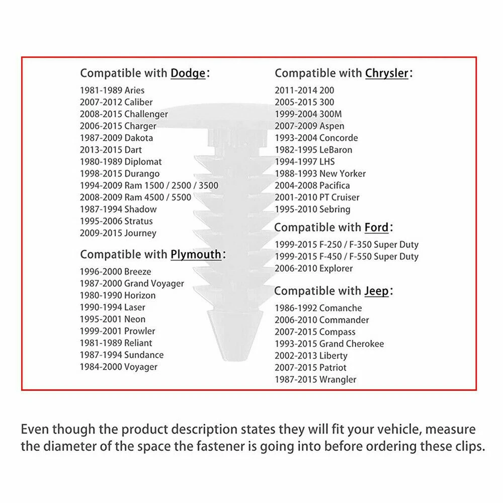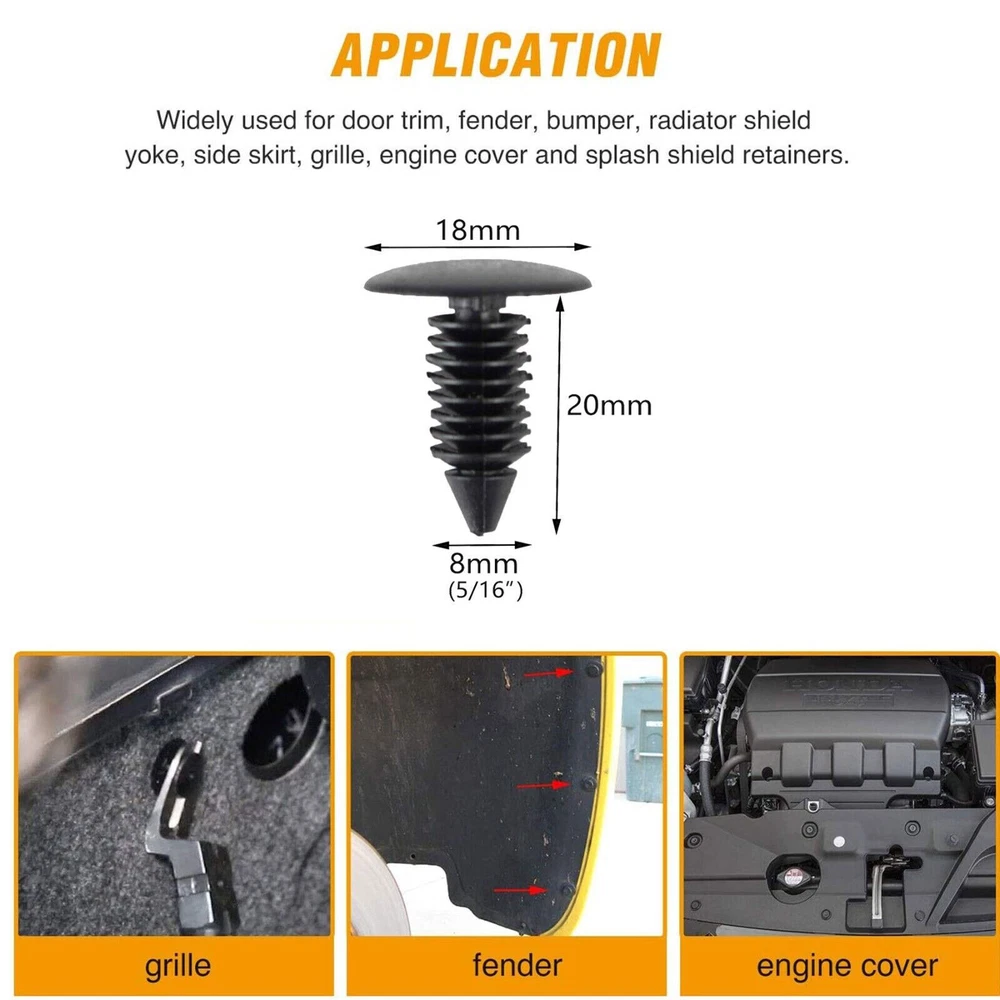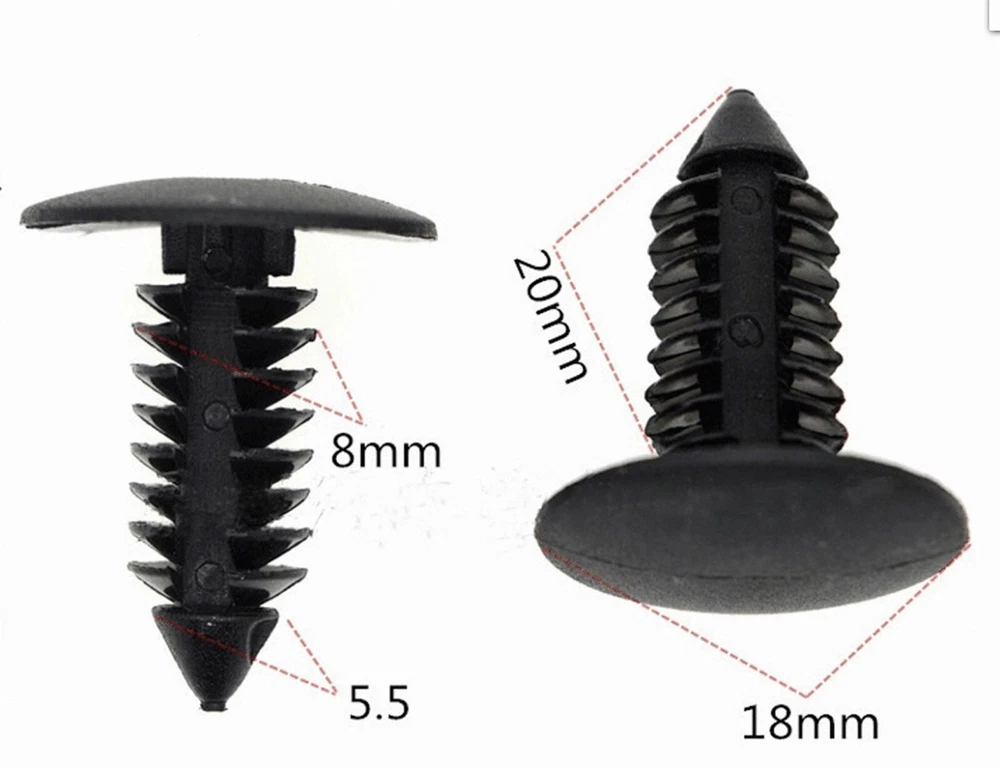 Widely Application: These are widely Used for car fenders, bumpers, doors, side skirts or other car surfaces. They can be used on motorcycle, buses, cars, trains, planes, truck, etc. This is the Non-OEM product accessories. Great Material: These bumper clips are made of high-quality black Plastic, anti-wear. Technical Specifications: Color: black only Material: plastic Fit Hole Diameter :8mm/0.31 inches Stem Length: 20mm/0.78 inches Total Length: 22mm / 0.86 inches Diameter: 18mm / 0.7 inches Fitment: GM: 1605396 1595864 Chrysler: 6030441 Ford: 388577S W705589-S300 And many others etc... Package: 100 pcs in one OPP ba Note: This is after-market, Not OEM one. 100x 8mm Bumper Clips Auto Car Hole Plastic Rivets Fastener Fender Push Pin NEW Great Material: These bumper clips are made of high-quality black Plastic, anti-wear. OE/OEM Part Number: Bumper Clip Type: Bumper Application 1: Wing door card internal sealing strip trim Application 2: Nylon Christmas tree style carpet mat clip Replaced Part Numbers: Carpet, Floor, Mat, Set, Bus, Train, Aircraft, Truck, Motorcycle, Bicycle, Packaging Other part numbers: Plastic push type bumper fixing clip Widely used: Widely used on car fenders, bumpers, doors, side skirts, or other automotive surfaces. They can be used for motorcycles, buses, cars, trains, airplanes, trucks, etc. This is a non OEM product accessory. High quality material: These bumper clips are made of high-quality black plastic and are wear-resistant. Technical Specifications: Color: black only Material: plastic Fit Hole Diameter :8mm/0.31 inches Stem Length: 20mm/0.78 inches Total Length: 22mm / 0.86 inches Diameter: 18mm / 0.7 inches Fitment: GM: 1605396 1595864 Chrysler: 6030441 Ford: 388577S W705589-S300 And many others etc... Package: 100 pcs in one OPP ba Payment Delivery details Terms of sales About us Contact us Payment We accept major credit card payments via Paypal. Payment must be received within 7 days of auction closing date. If you do not contact us or respond to our email within 7 days of auction closing date, we do not guarantee the item availability. We reserve the right to cancel any unwanted bids. Delivery details Flat rate shipping charge will be applied to the 48 continental USA States. Extra shipping fee will be charged to ship item(s) to HI, AK, PR, GU, VI, APO, FPO . Item(s) will be shipped via UPS Ground or USPS or Fedex within 3 Business days after payment is received. A Tracking Number will be upload on platform as soon as item(s) is shipped. International buyers please note, we are not responsible for any custom duties, taxes and brokerage fees. For some oversize packages, we may not be able to ship via USPS. Terms of sales All of our items are professionally made and guaranteed to fit. A professional installation is always recommended. Please send a message over eBay if you have any questions. We accept returns within 30 or 60 days after you received the item(s). All returned items must be new and in original package. The buyer will pay return shipping fees. No refund will be made for damaged parts. Shipping and handling fees and insurance fee are not refundable. About us Our warehouses are located in CA and NJ The transportation time is approximately 3-5 working days Contact us Your satisfaction is our top priority. We stand behind all products that we sell. If you have a problem with any of our listings, please allow us to work it out. Our business times are Monday-Friday 9:00- 5:00 Pacific Time. Office closes on weekends and holidays. We are striving to earn a 5- star rating with every purchase. Please take a moment to leave us a positive feedback when you receive your order. If you are not satisfied, please let us know before you leaving feedback. Please always include your purchase eBay item number in the mail whenever you have any questions.