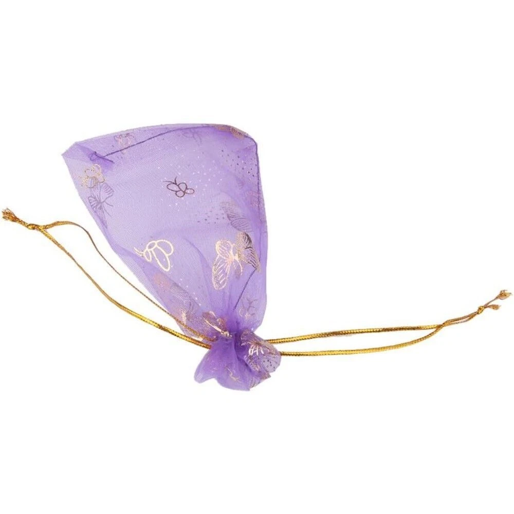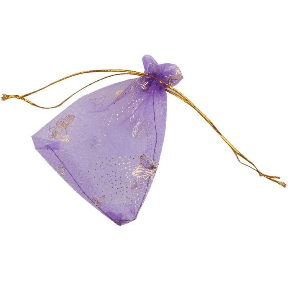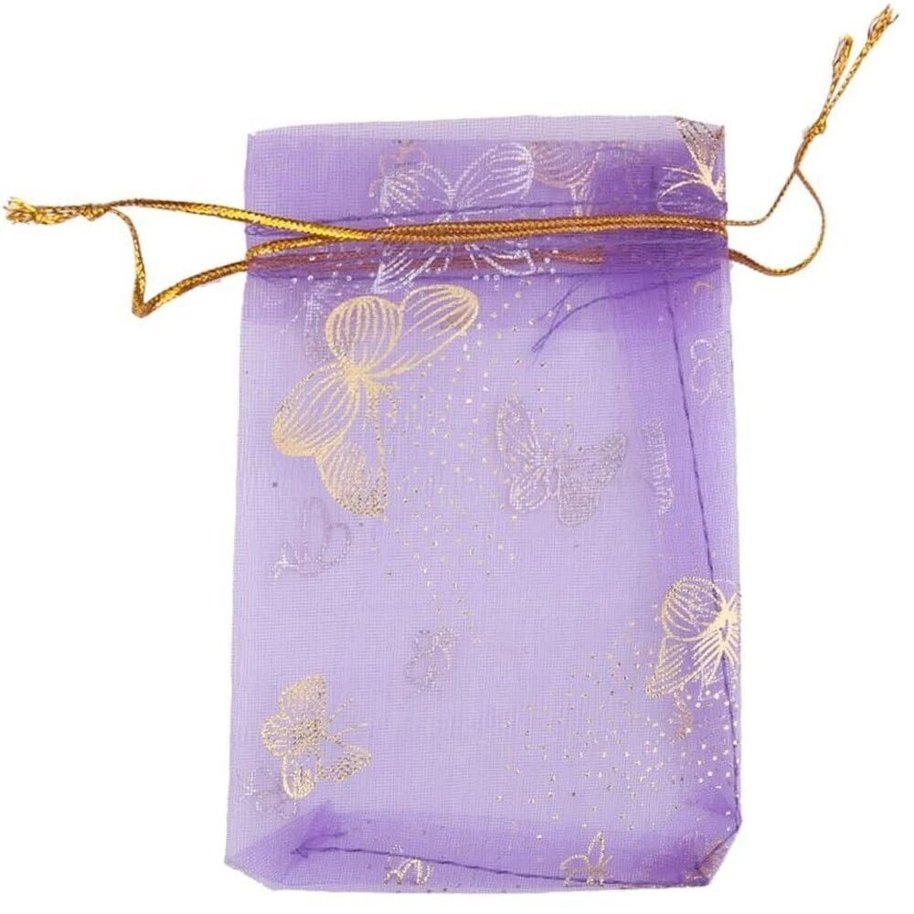 Specifications: Material: Organza Size (Width x Length): 9x12cm/3.5"x4.7" Color: Purple Pattern: Butterfly Package Includes: 100 x Organza Drawstring Bags Premium Material: Made of organza fabric material, which is safe, sturdy, washable and not easy to break, you can use it for a long time; It is also lightweight and portable for you to carry. Easy To Use: Each bag comes with two gold corlor drawstrings on both ends, making the bags open or close conveniently, and you can also be easy to carry your items in them with the strings. Wide Applications: Can be used for storing food, packing gift, travel storage, and keeping some items such as snacks, cream jars, jewelry, coins, candy at parties, shipping hardware or other small metal parts. You can store daily essential. Notices: Due to the light and screen setting difference, the item's color may be slightly different from the pictures. Please allow slight dimension difference due to different manual measurement.
