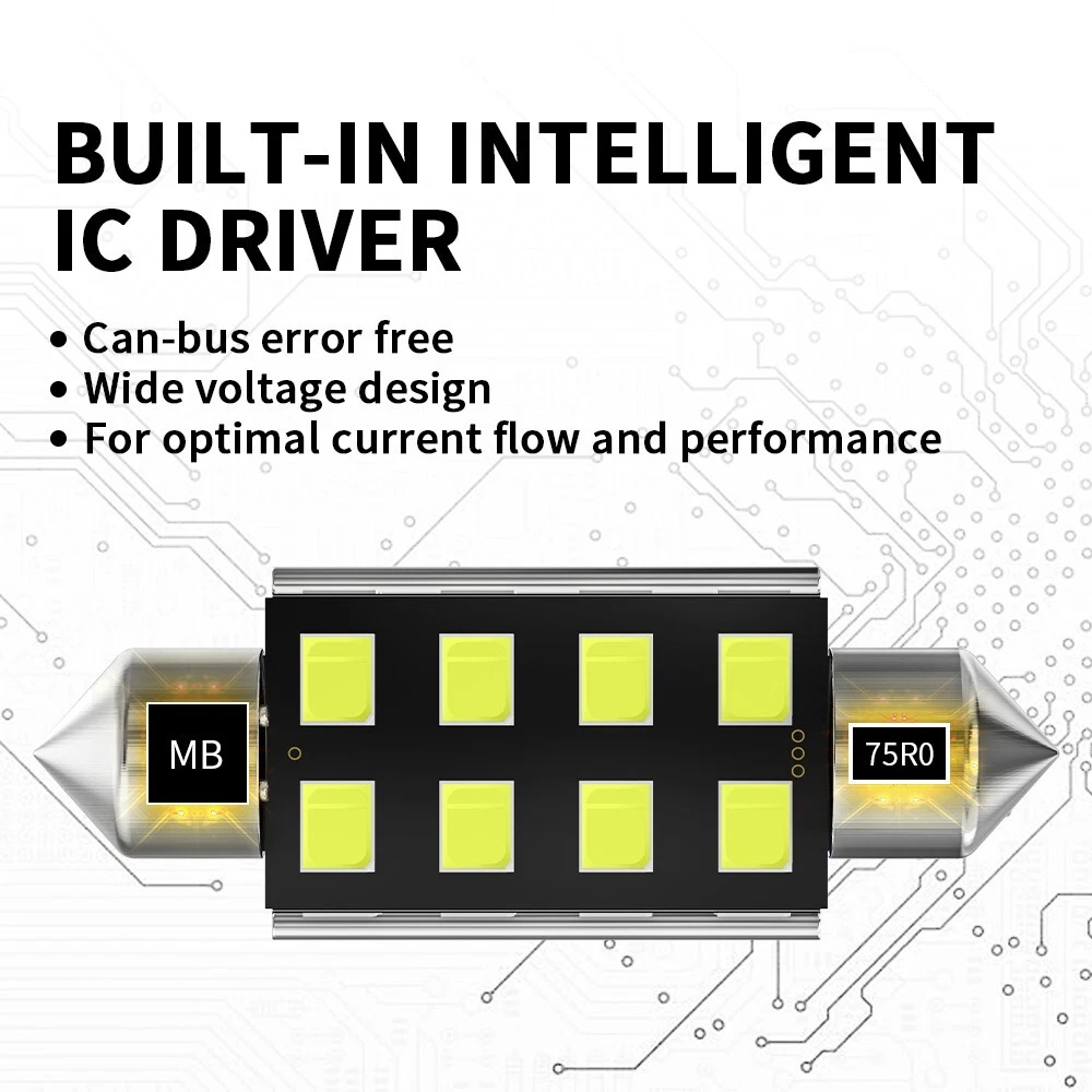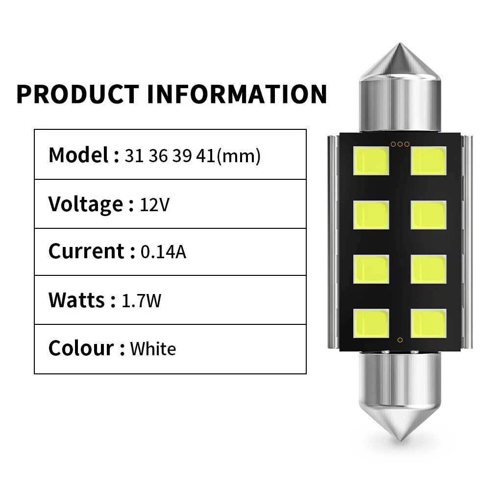 Product summary Technology: Led Wattage: 1.7w Voltage: DC 12v Guarantee: 12 months Description Cool White Light Color. 1 Year warranty. Canbus error free technology. Built in resistor which will prevent any dashboard errors and repeat flickering. Note, although these bulbs are canbus error free certain premium car models may still require an additional load resistor. Super bright light - transform the look of your vehicle without any re-wiring or upgrading. Can be installed anywhere that takes the 239 fitting: Interior, number plate etc. Select bulb size & quantity of bulbs required from the drop down menu selections. Also known as Festoon, 264, C5W, C10W fitment. Up to 5 times more brighter than standard bulbs. 50,000+ hours, long life. Plug & play, simply remove your existing bulb & put this one in it's place. All our bulbs are sourced from quality suppliers. Package Include: 10-100pcs X 31/36/39/41mm 2835 LED Car Interior Light Bulb