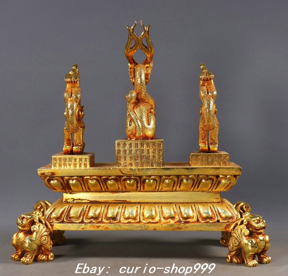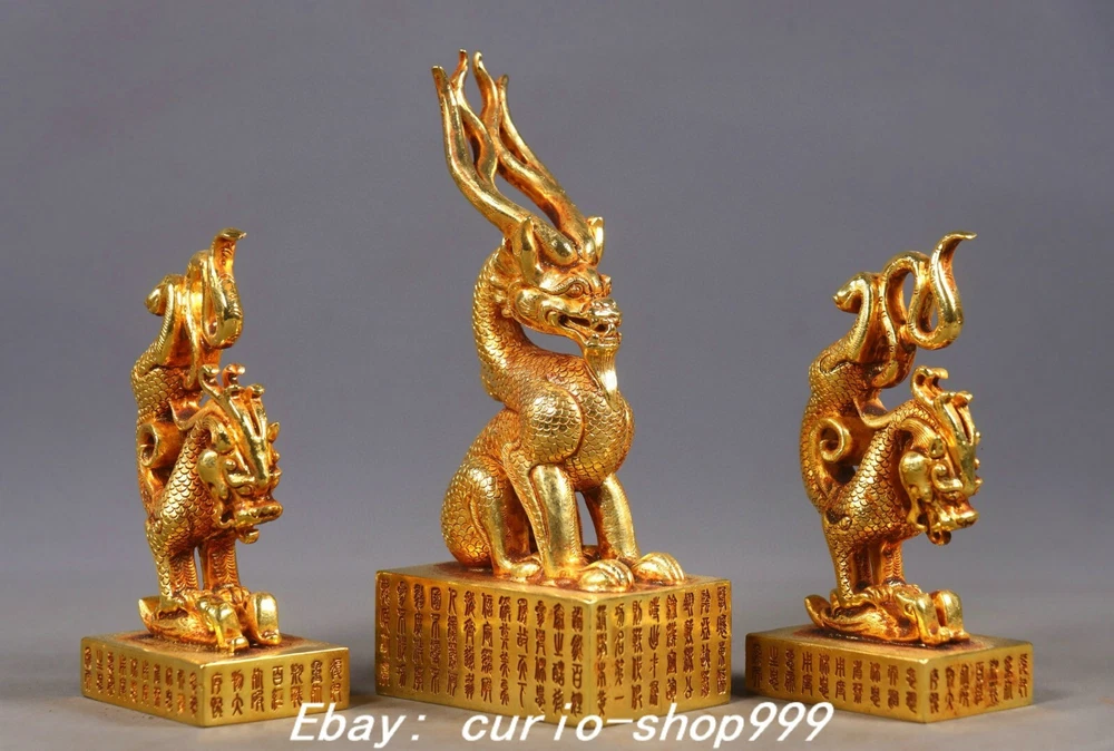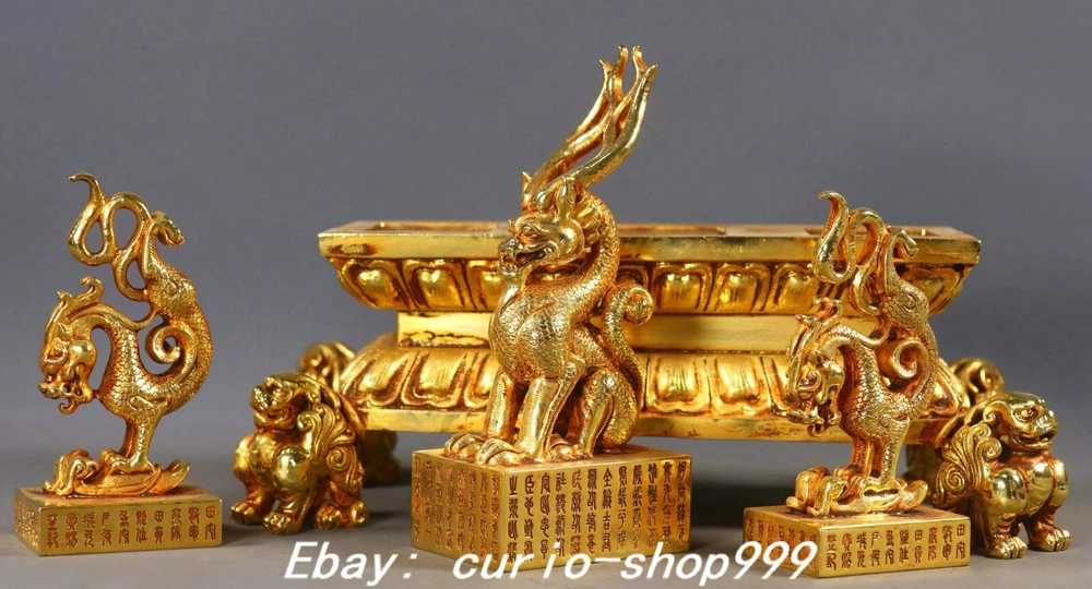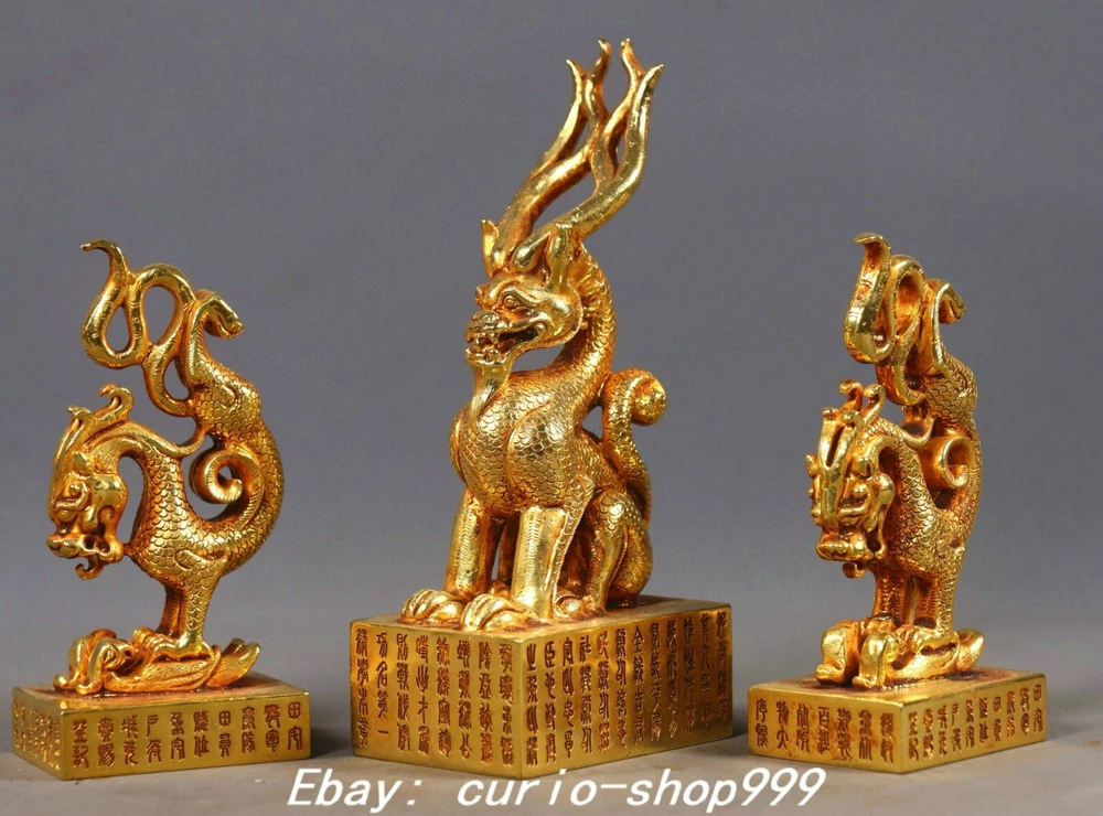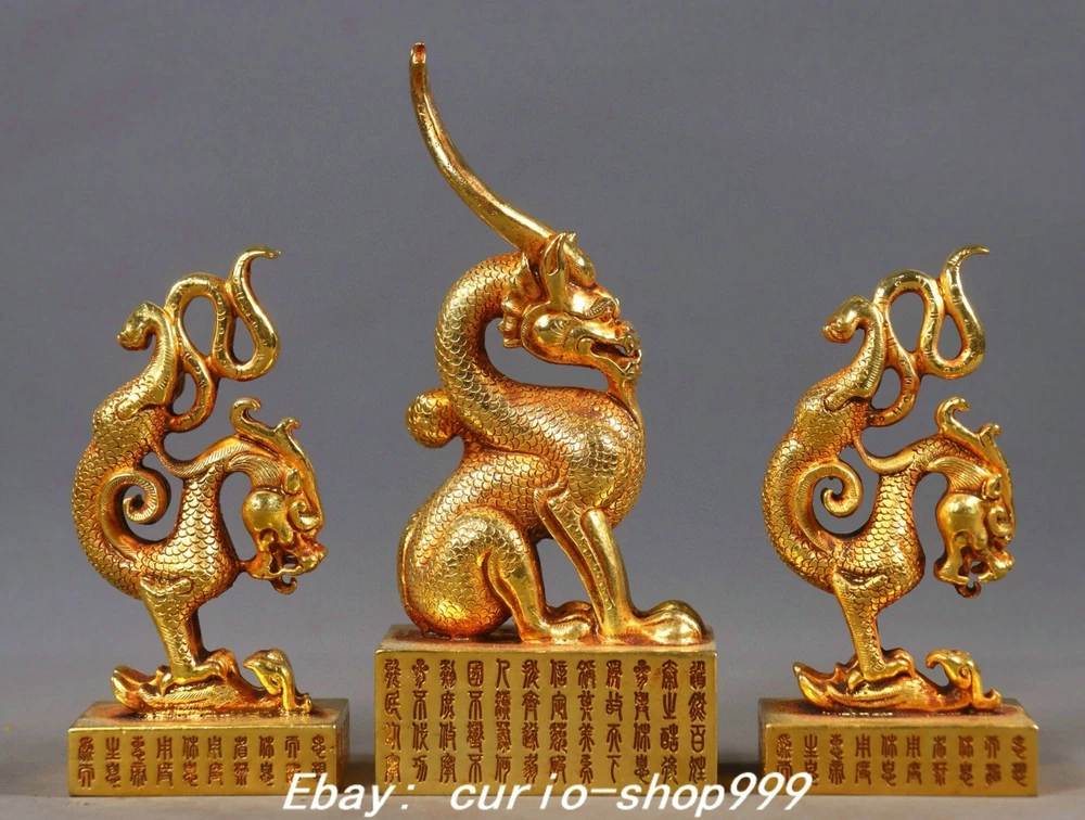 **** Welcome to our antique & Collectable Shop : Porcelain**** Description: Here is 10.2" Old Dynasty Pure Bronze Gold Dragon Loong Beast Seal Stamp Signet Set . It is in good condition, and was created by skilled craftsmen in traditional style with fine handcrafts.This is a great piece of valuable collection, a valuable personal alter or a very good present. the handwork is very fine with incredible detailling. Don't miss out this chance to get it.Wish you good luck! . Material : Pure Bronze Gold Size : Heigh t 9.8 Long 10.2 B readth 5.3 (inch) Condition Perfect Condition. Perfect, with no scratches, flaws or repairs. Weight: 7.6 KG----included the weight of packing materials Shipping cost to all over the world countries in Free Honored Customers: We are selling the collectibles products and crafts in Beijing ,China since 1993 and collected them all over the world all the time . In our shop the bronze sculpture, animal, vase, urn, flowerpot,Incense Burner.Table chair sets. Militaria goods. buddha statues, Bodhisattva Statues, Buddhist Ritual Items etc is our speciality .Many of the items we sell come from our own personal collection and have been in our family for a very long time .My great-grandfather was the first in this family to start collecting art & antiques when he still lived in San Xi and Tibet around 1922 ,some of the paintings he once collected can now be seen in museums around the globe.We won't make money from t he shipping cost, if you dislike the item when you receive it,we can refund all of your money to you within thirty days. Please confidence for bidding . We recommend the combine shipping and offer you an big price discount if you order more items together ! 2025.4.15 四 号