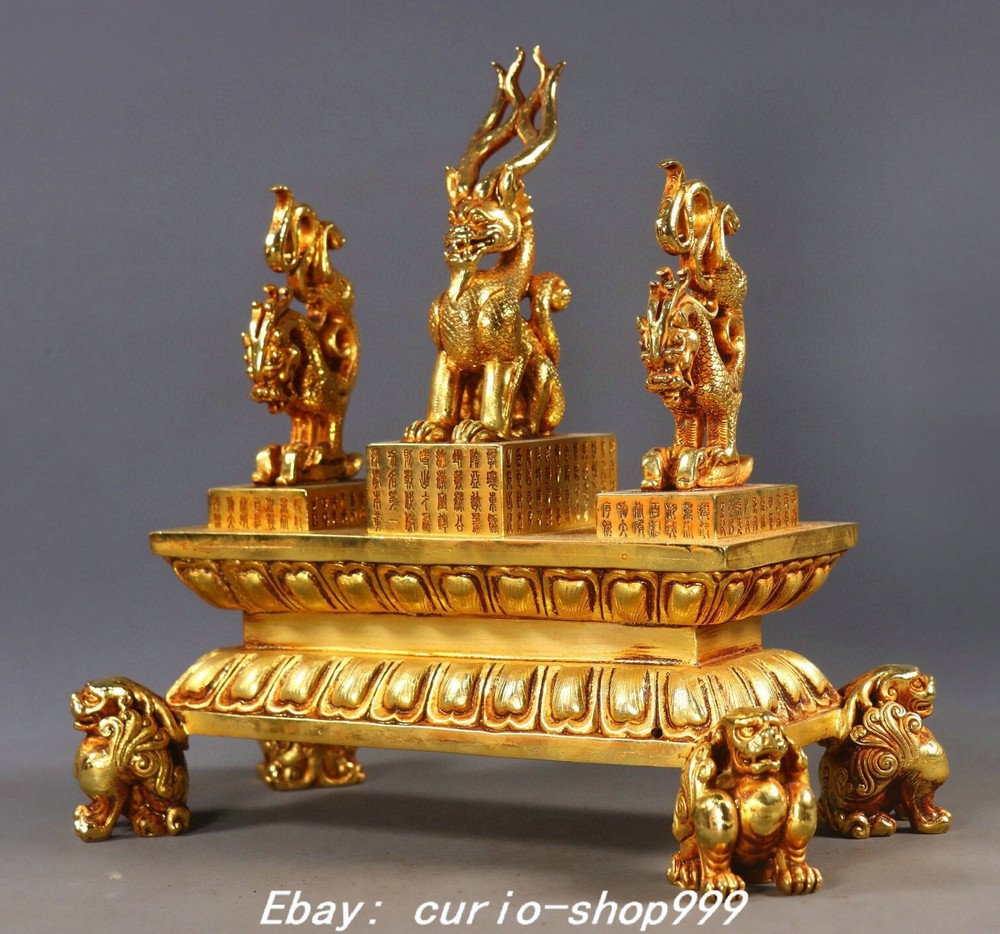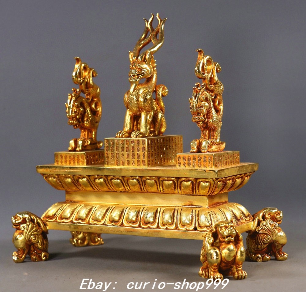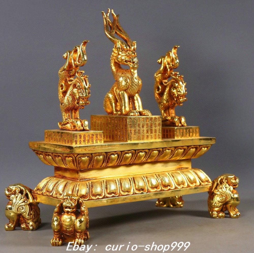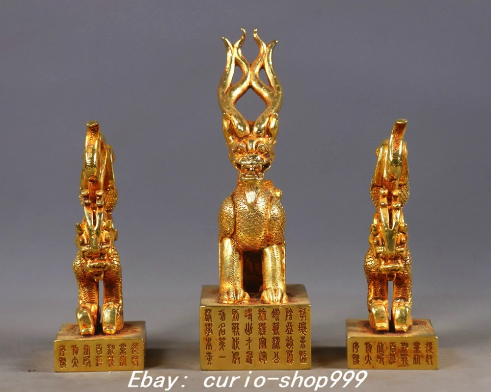 **** Welcome to our antique & Collectable Shop : Porcelain**** Description: Here is 10.2" Old Dynasty Pure Bronze Gold Dragon Loong Beast Seal Stamp Signet Set . It is in good condition, and was created by skilled craftsmen in traditional style with fine handcrafts.This is a great piece of valuable collection, a valuable personal alter or a very good present. the handwork is very fine with incredible detailling. Don't miss out this chance to get it.Wish you good luck! . Material : Pure Bronze Gold Size : Heigh t 9.8 Long 10.2 B readth 5.3 (inch) Condition Perfect Condition. Perfect, with no scratches, flaws or repairs. Weight: 7.6 KG----included the weight of packing materials Shipping cost to all over the world countries in Free Honored Customers: We are selling the collectibles products and crafts in Beijing ,China since 1993 and collected them all over the world all the time . In our shop the bronze sculpture, animal, vase, urn, flowerpot,Incense Burner.Table chair sets. Militaria goods. buddha statues, Bodhisattva Statues, Buddhist Ritual Items etc is our speciality .Many of the items we sell come from our own personal collection and have been in our family for a very long time .My great-grandfather was the first in this family to start collecting art & antiques when he still lived in San Xi and Tibet around 1922 ,some of the paintings he once collected can now be seen in museums around the globe.We won't make money from t he shipping cost, if you dislike the item when you receive it,we can refund all of your money to you within thirty days. Please confidence for bidding . We recommend the combine shipping and offer you an big price discount if you order more items together ! 2025.4.15 四 号