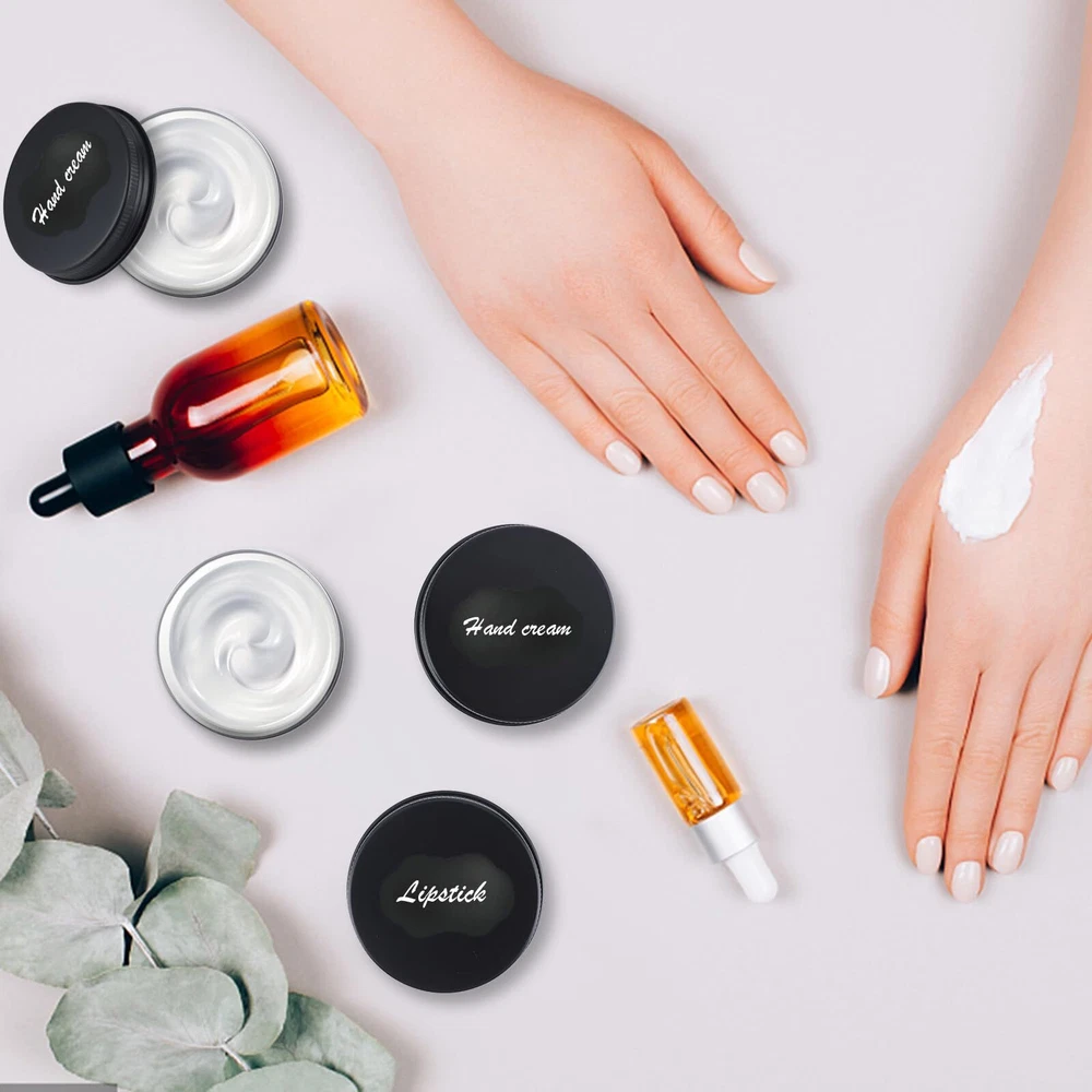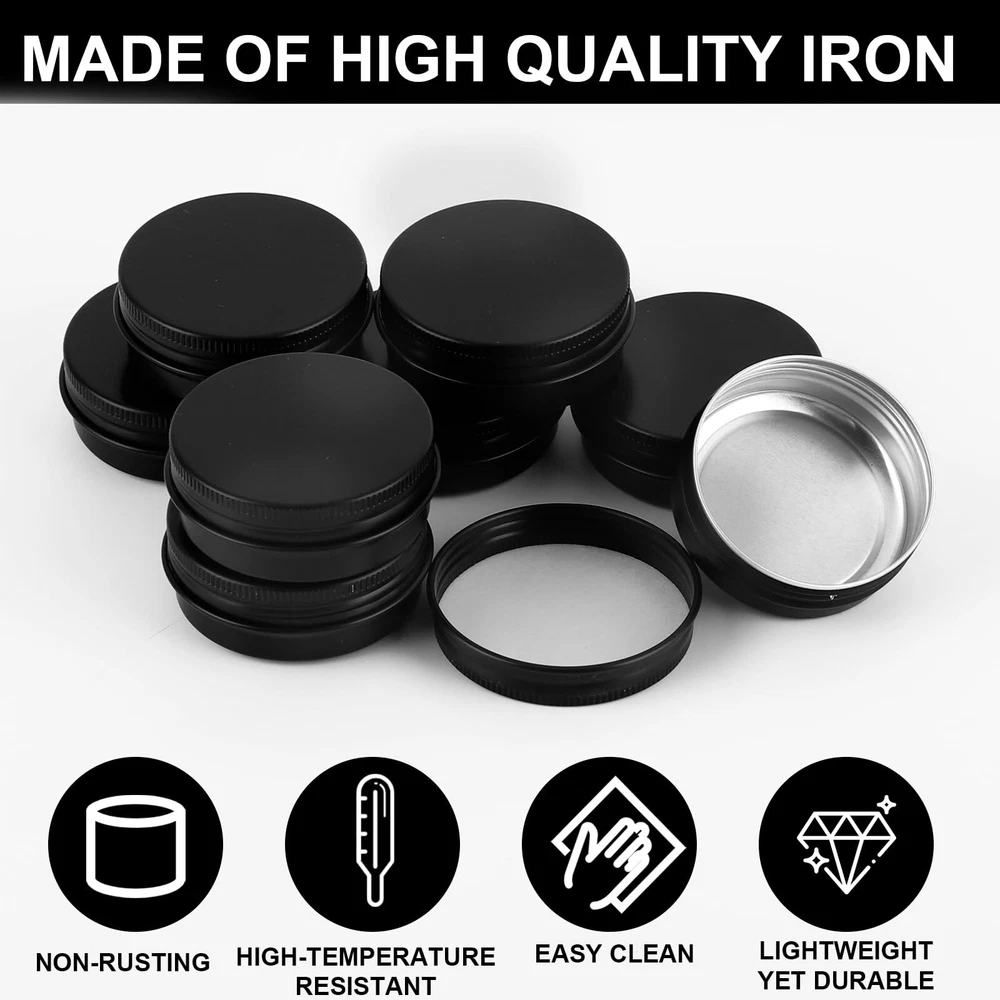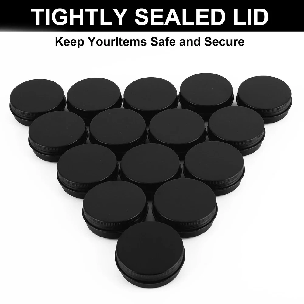 ABOUT US: is a professional company focus on people's real needs in life. After years of researching and concluding, we finally create this premium aluminum tins to meet your multiple needs. With food-grade material and superior craftsmanship, you can never go wrong with Package Contains:You will get 102 PACK with screw cap aluminum metal box, and 105 black stickers, and four erasable pens Capacity: 1 oz/30 ml, 2" diameter x 0.8" height ! SPECIFICATION: 1. Material: Aluminum 2. Capacity: 1 Oz 3. Color: Silver 4. Dimension (Diameter): 2 inches diameter * 0.8 inch height 5. Net Weight:1 ounces / 30 ml 6. Package Information: 102 x Aluminum Storage Cans Why Choose 's Metal Round Tins? - Premium material and superior craftsmanship, rust-proof, leak-proof, and durable. Can be used for several years. - Upgraded screw lid, easy to use. - Lightweight and compact, easy to store or carry around. - Multifunctional and suitable for various usages. WARM TIPS: ① The color may slightly differ from the picture mainly due to different light and monitors, please kindly understand. ② We provide 24-hour online customer service, please don't hesitate to contact us if you have any questions or suggestions and we will reach you at the soonest. 【Package Contains】102 aluminum tin cans with screw lids,4 pieces of white markers,105 pieces of black labels.Usage for salves/lotions 【Capacity/Small Gifts】Stores up to 1 oz/30 ml,Useful for storing many small items that you can also share with your family or friends 【Premium & Safe Material】Made of high-quality metal aluminum, the tin can is beautiful in shape, light in weight yet durable, Smooth surface ,can be labeled with small labels for easy identification. tins are perfect for storing homemade skincare products 【Sealing and Leak-Proof】The metal aluminum tin can adopts a tightly sealed screw twist lid structure, it can prevent liquid from leaking efficiently.The best gift for your friends or family who love making jars or cosmetics by themselves. 【Wide Application】- These empty aluminum containers are perfect be widely used to make candles or store DIY ointments, food storage, beard balms,DIY balm, cosmetic packaging, candy storage, and so on.