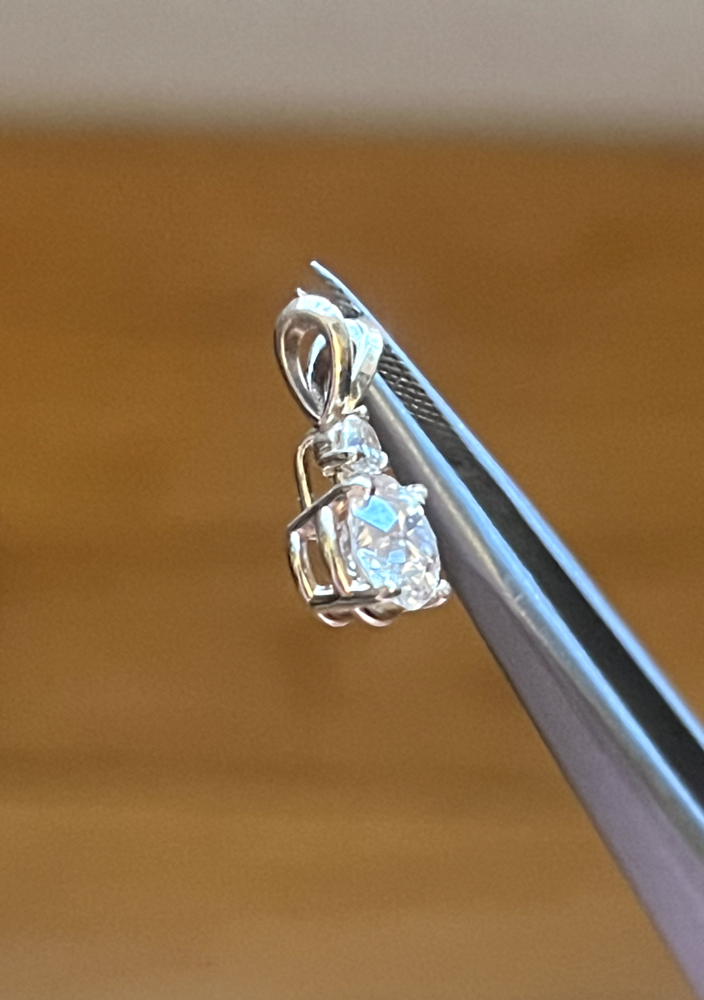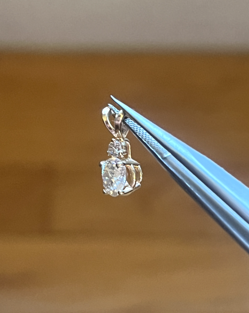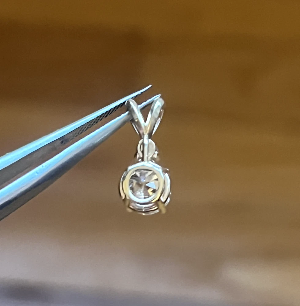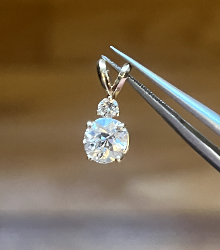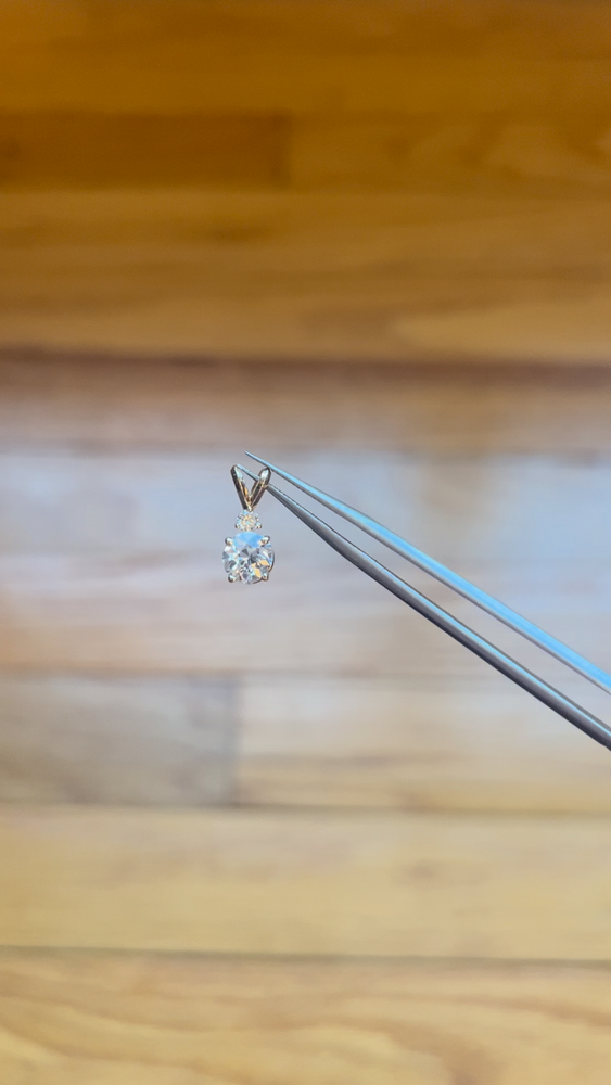 This is a charming vintage circular brilliant diamond cut roughly between 1880-1940 repurposed into this 14 kt gold pendant with a 0.07ct accent diamond. It features an open culet and a frosted girdle. It faces up colorless and is full of fire and brilliance. This pendant comes with the original copy of the GIA certificate. The main diamond was laser inscribed to match its report. Shop with peace of mind as this purchase comes with authenticity guarantee.