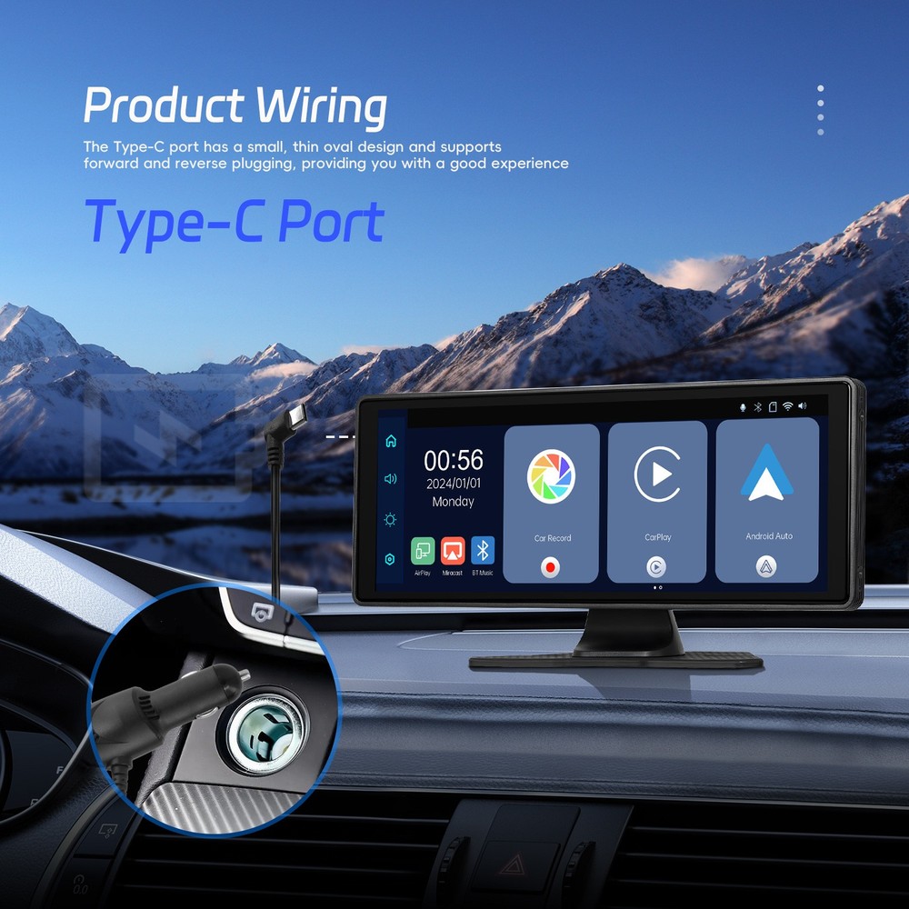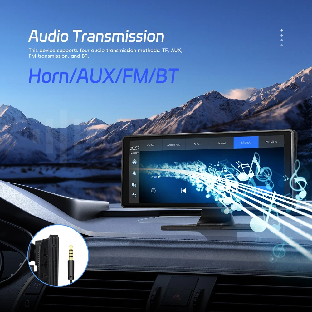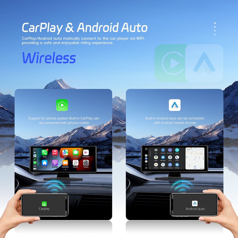 Car Multimedia Monitor Product Description: Feature: 【Front 4K Dash Cam】This monitor support 4K front dash cam. Support loop recording, G-sensor. 【Wireless Apple CarPlay & Android Auto】This car multimedia monitor is compatible with wireless Apple Carplay, wireless Android Auto function. 【Apple Carplay & Android Auto Voice Control】Uses your smartphones such as Hi, Siri / Hello Google assistant wirelessly to make calls and play your music without taking your eyes off the road. 【Apple Carplay & Android Auto Navigation】You can use Apple Carplay & Android Auto on line GPS navigation. Such as Apple map, google map, Here we go etc. 【Reversing Image】This monitor can support rear view backup RCA camera image input. It can help you have a safe reversing and parking. (One camera come with the monitor for reversing rear view) 【FM Voice Transmit】Our multimedia monitor have a small speaker. If you want to enjoy your original car audio, you can use FM Transmit function to launch voice signal to your original car radio. 【 TF Card, Bluetooth】This car multimedia monitor can support USB disk, TF card music, video playback. It also can supprot Bluetooth music & handsfree call. 【IPS Touch Screen】10.26 inch screen car stereo with 1600x600P IPS screen, support 2K video playback. Enjoy the features such as maps, movies and more. 【Simple Installation】This car multimedia monitor with the suction mount secures intellidash to your dashboard or windshield and can be easily removed and stored. 【Compatible with 99% vehicle】Our multimedia monitor work voltage is 12-30V. Truck, bus, van, car, both vehicle can be used. It can let everyone enjoy CarPlay & Android Auto. Item Specification: OS: Linux Dash Cam: Supported Screen size: 10.26 inches Dash Cam Resolution: 4K Screen resolution: 1600x600 Radio Transmit frequency: FM 87.5.0~108.0MHz Output power: built-in 1W speaker Working voltage: 12~24V Working temperature: -10~+60℃ Bluetooth version: 5.0 (default name: SWL-BT) Panel size: 245x95 mm/9.65x3.74 inch Steering wheel control: not supported Video output: not supported Offline maps: not supported Built-in speaker: yes TF card: support Reversing video input: support Audio format: MP3/AAC/APE/OGG/M4A/RA/WAV Video format: H263/H264/H265/HD/AVI/FLV/MKV/MPEG/MP4/WMV9/VC/ASF/TS/QT Image format: JPEG/PNG/BMP/GIF/TIFF PACKAGE INCLUDES 1 x Car Multimedia Monitor 1 x Cigarette Lighter Power Cable 1 x Monitor Bracket 1 x Rear View Camera 1 x Rear Camera Input Cable 1 x User Manual 1 x Suction cup holder This car multimedia monitor with the suction mount secures intellidash to your dashboard or windshield and can be easily removed and stored. Our multimedia monitor work voltage is 12-24V. Truck, bus, van, car, both vehicle can be used. It can let everyone enjoy CarPlay & Android Auto. 10.26 inch screen car stereo with 1600x600P IPS screen, support 2K video playback. Enjoy the features such as maps, movies and more. This monitor support 2K front dash cam. Support loop recording, G-sensor. This monitor support 4K front dash cam. Support loop recording, G-sensor. This car multimedia monitor is compatible with wireless Apple Carplay, wireless Android Auto function.