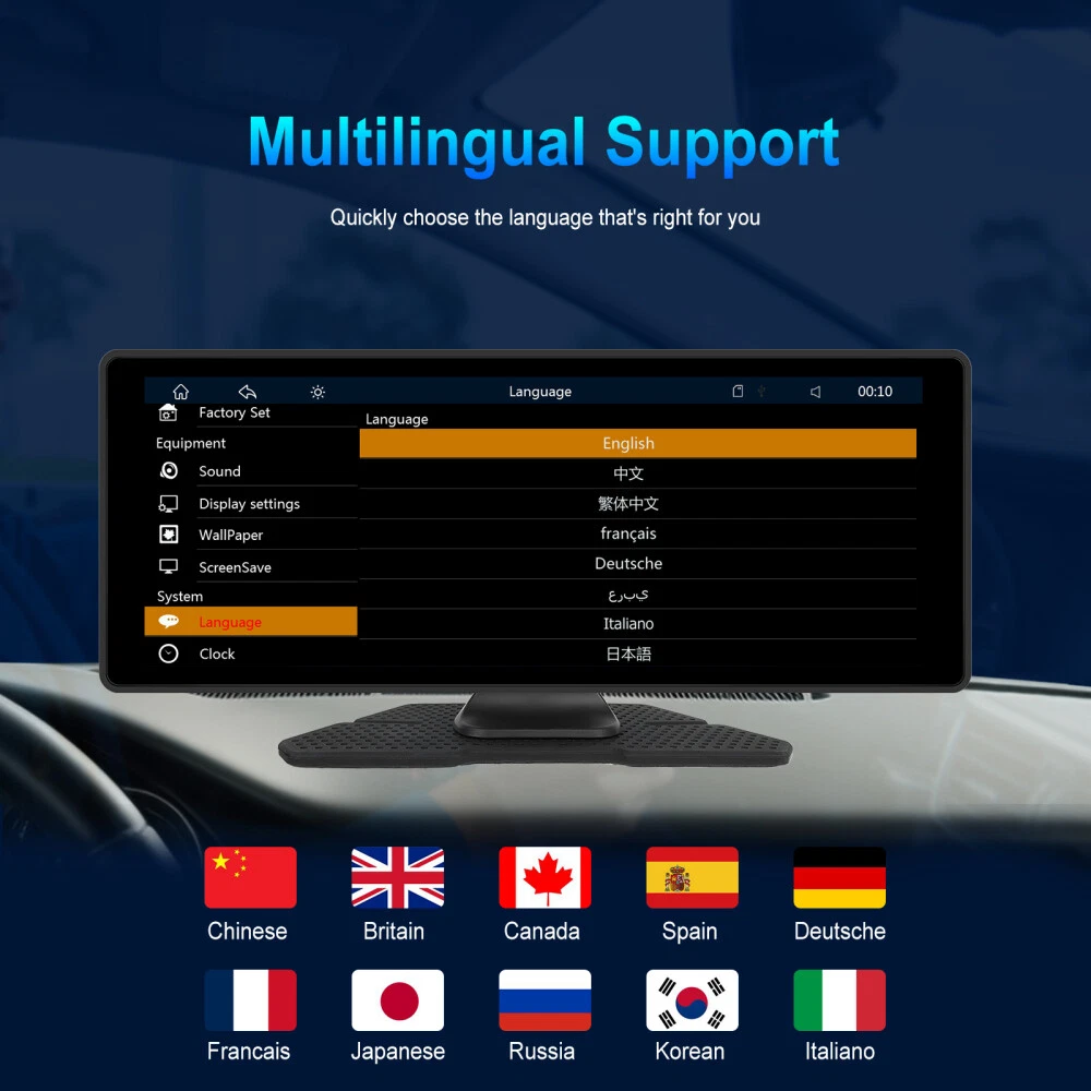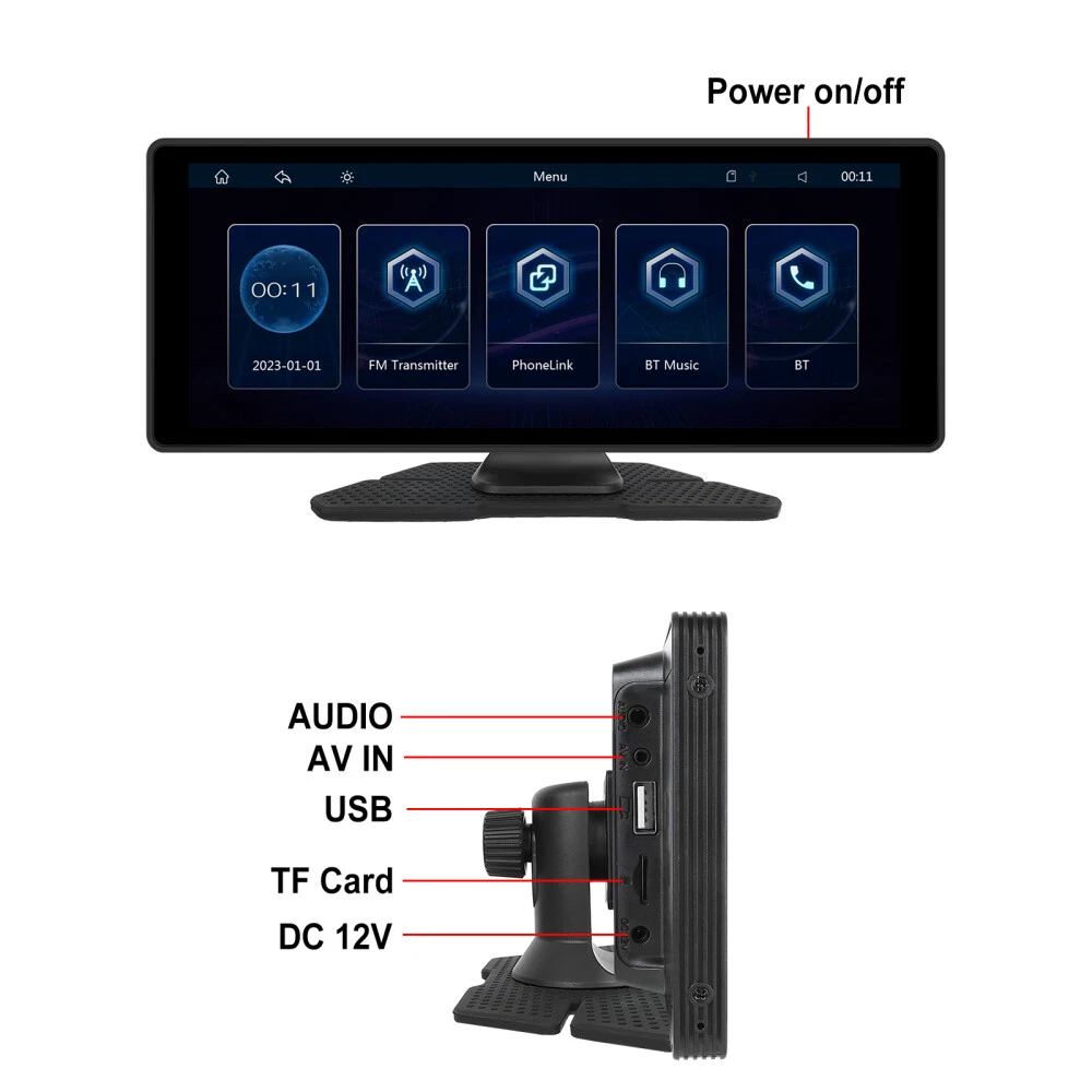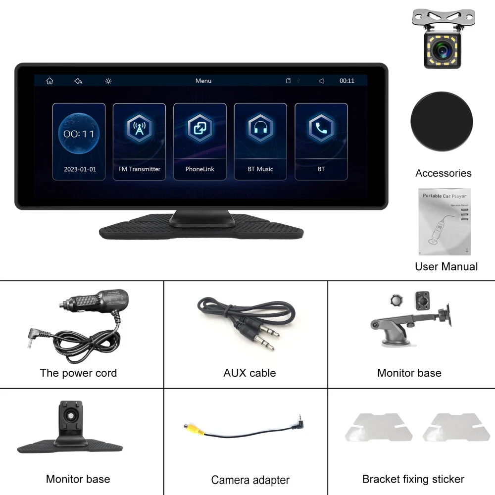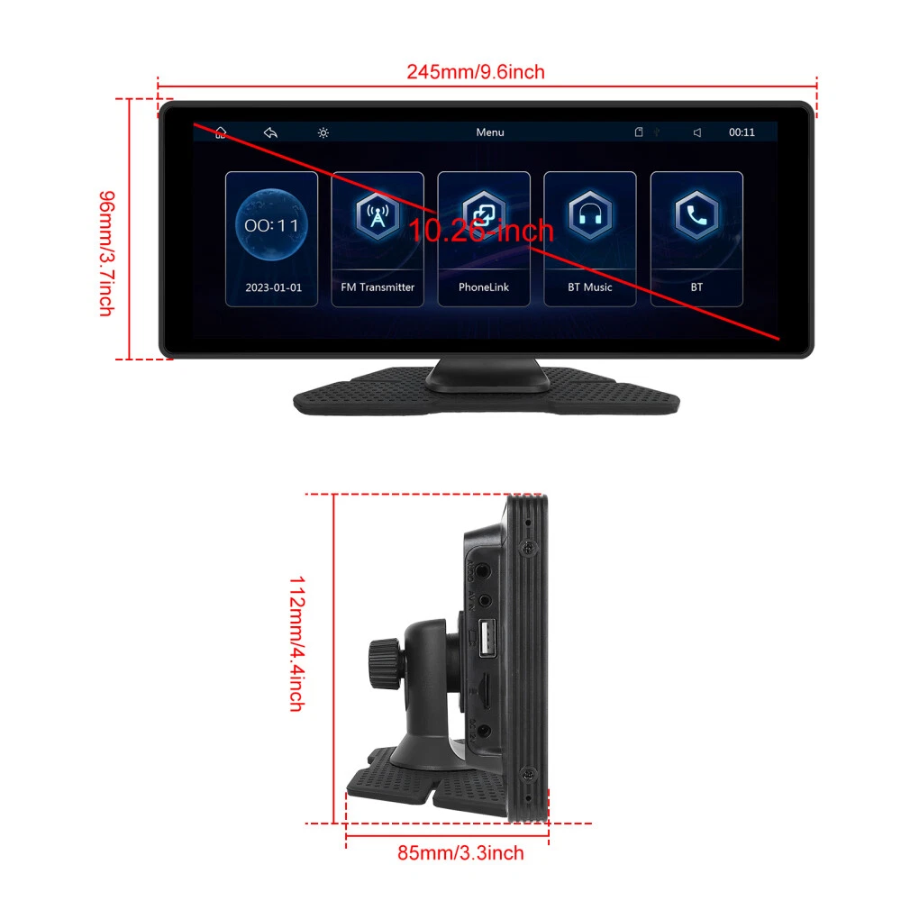 10.26" Touch Screen Wireless Apple Carplay Portable Car Stereo Android Auto Description Description: The 10.26-inch high-resolution screen has good display effect, bright colors and delicate picture texture. Support wired/wireless Apple CarPlay function, can connect to the host through mobile phone Bluetooth and WiFi and use iPhone CarPlay function. You can view navigation, listen to songs, etc. through CarPlay Support the wired/wireless Android AUTO function, you can connect to the host through the Bluetooth and WiFi of the mobile phone and use the AUTO function of the Android mobile phone. FM transmitter function, through this function, you can transmit the music or other sound of the host to the original car audio system. AUX cable connection is also supported With card reading function, insert the memory card into the host to watch the videos stored in the card. With Airplay, Phonelink and other screen projection software, support for iPhone and Android phone screen projection. A camera can be inserted as a back-up or blind zone camera to increase driving safety. connect mobile phone Bluetooth can use Bluetooth music and Bluetooth phone 10.26 Inches Smart Player Screen : HD 1600*600 Language:Chinese/English/French/German/Italian/Japanese/Portuguese/Russian/Spanish/Polish/Turkish/Korean, etc Voltage: 7-32V Camera System: P AL /NTSC Camera: CVBS Installation method: Vertical stand/Sucker support Operating temperature: :-4~149 ℉ Intelligent interconnection: support IOS CarPlay/Android Auto/Bluetooth music/FM transmission/Airplay/Phonelink/FM transmitter Cooling method: Passive cooling Reset: Support Firmware version: Support CarPlay:wired/wireless Android Auto:wired/wireless iPhone/Android phone cast:support wired connection SD card: Supports local audio playback USB port: Supports local audio playback Wallpaper Replacement: Supported FM emission: Support (FM 87.5-108) Bluetooth: Support Bluetooth music, Bluetooth call, address book EQ: Support Reversing sound mute: Switch Mirror: Flip left and right, flip up and down Driving video: Switch Touch calibration: Support Display Settings: Supported Time setting: Supported BT for CarPlay:Supported Screen save: off/10s/30s/1 min/5 min/10 min/30 min Package included : 10.26 Inches Smart Screen Player Universal Mount*2 User Manual Cigarette lighter (1M) AUX cable Camera adapter Accessories Payment Shipping Returns Contact Us 1. Only accept Paypal 2. All major credit cards are accepted through our secure payment processor PayPal. 3. We ship to your Paypal address. Please make sure your Paypal address is correct before you pay. Please make sure your eBay shipping address is correct for your receiving. We will try our best to solve any dispute and try our best to satisfy you. If you are not satisfied with our product, please contact first . Please contact us in time if any enquriy under any circumstances. We greatly appreciate your positive feedback and we'll do the same to you.