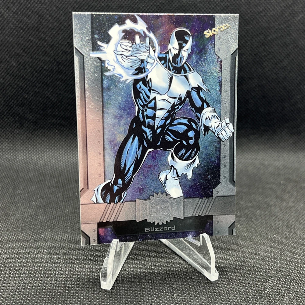 The product is a 2024 Marvel Metal Avengers Universe trading card featuring character #103, Blizzard, from the High Series set. Manufactured by SkyBox, this non-sport trading card is part of the Marvel franchise, specifically the Avengers and Marvel Cinematic Universe (MCU). The card is a base set card and does not come with an autograph. Perfect for collectors of Marvel trading cards, this item captures a piece of the Avengers universe in a visually appealing format.