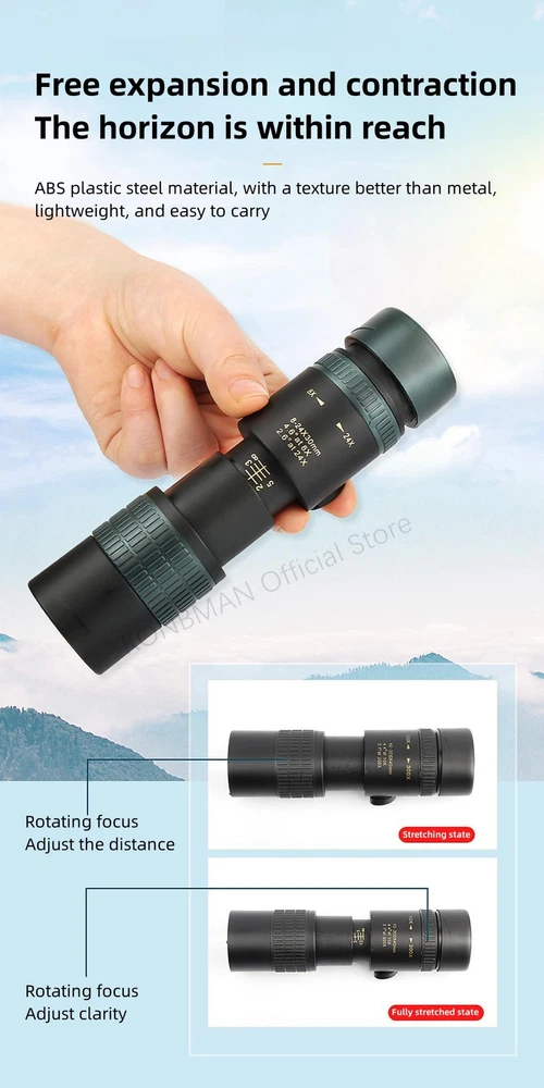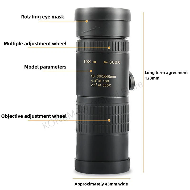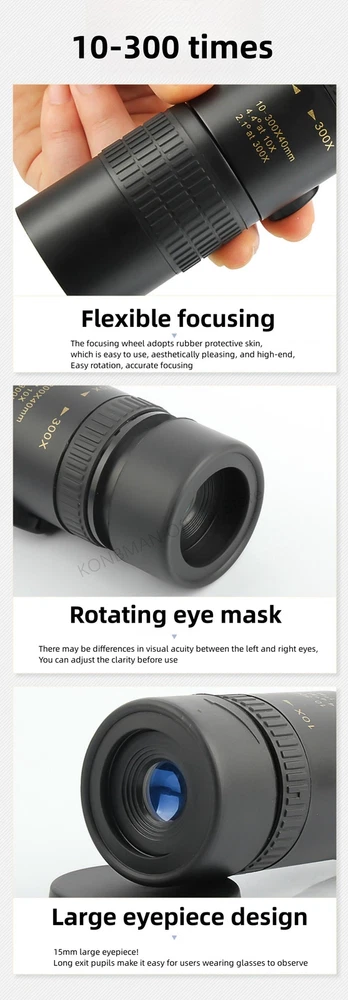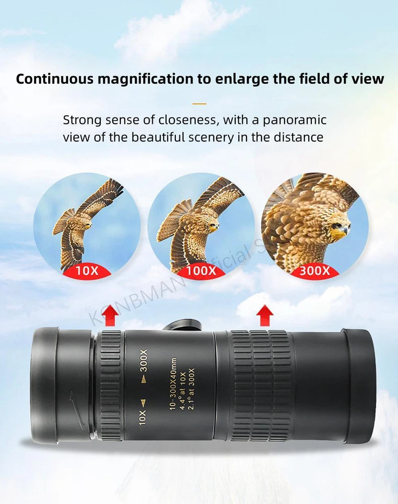 Free and fast shipping , shipping take up 1-7 Business Days 30 Day Return Accepted EASY PAYMENT via PayPal, Credit Card, PayPal Credit, Google Pay... 10-300x Zoom Monocular Telescope Travelling Plastic Multicolor Modern Waterproof 10-300X Zoom High Definition Powerful Binocular Telescope Remote Portable High Quality Professional Hunting Monocular Telescope Product parameters Objective lens diameter: 30mm Eyepiece diameter: 15mm Objective lens coating: FMC broadband green film Eyepiece coating: Blue film Prism material: BAK-4 Prism system: Roof ridge system Focusing method: Rotating focusing/Stretching focusing Close range: 2 meters Tripod interface: 1/4 standard screw Product material: ABS plastic steel material Product color: Black Product size: 128/168x43mm REVIEWS The product came very well packaged. I'm very happy. thank you for everything. Seller strongly recommended. This is great! I definitely recommend! Product looks amazing Delivery was fast. Excellent seller, great communication. I advise everyone to buy it!