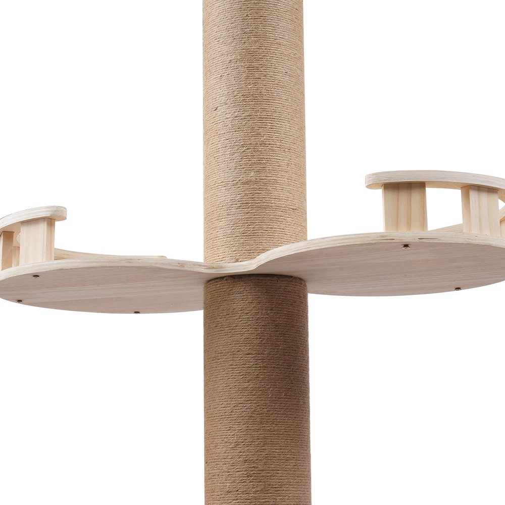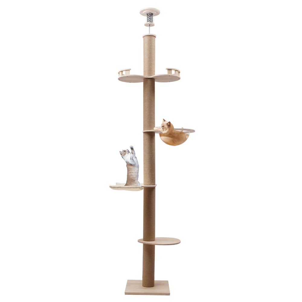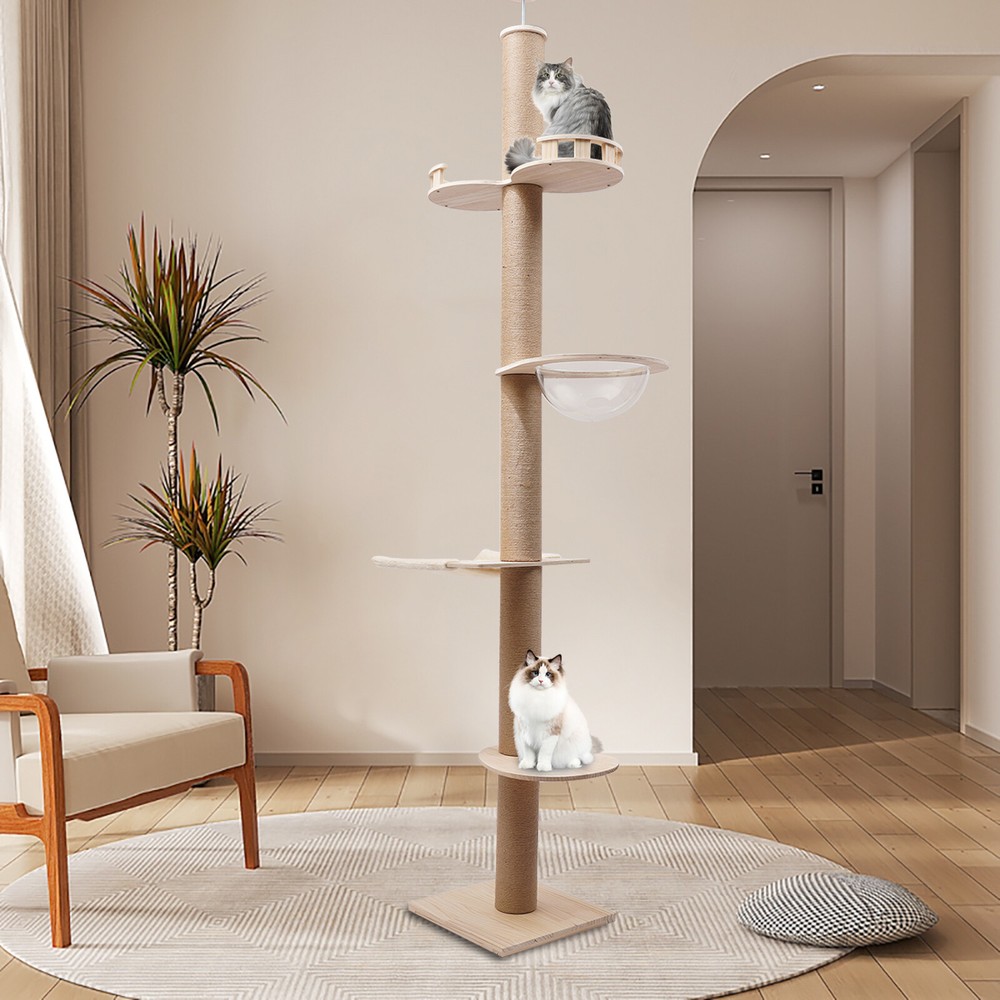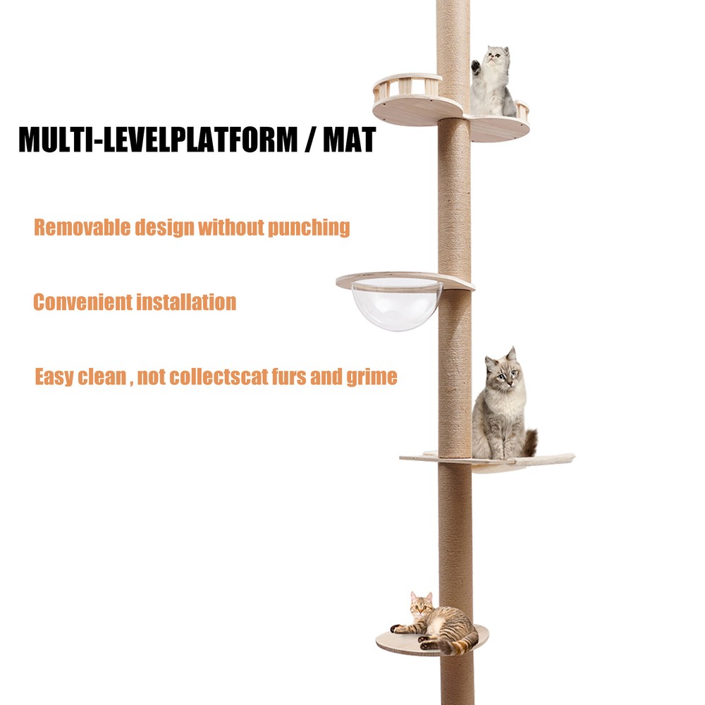 Cat Tree 104" Cat Climbing Tower for Indoor w/Natural Sisal Rope Scratching Post Floor-to-Ceiling Cat Tree Cat Climbing Tower with Natural Sisal Rope Scratching Post, (Adjustable Height:100.4inch-104.3inch) Description Buy a cat tree for your cat, and give it a home paradise to play in. This cat tree includes a springboard, space capsule, U-shaped hammock, and a double watchtower, which is a fabulous play truck for your cat to climb, scratch, sleep, and play. It uses MDF , paper tubes, and hemp ropes as material, making this cat tree safe, durable, and environmental-friendly . Its height is adjustable from 100.4-104.3". You can send it to a cat lover at various festivals. Key Features Premium Material: This cat tree is made of MDF , paper tubes, and hemp ropes without paint, making it strong, long-lasting, environmental-friendly , and safe for your cat. Adjustable&Proper Height: The tension rod with a spring on the top makes this cat tree be adjusted from 100.4-104.3" to accommodate the room ceiling. Its proper height (max. 104.3" ) arouses cats' curiosity a nd allows them to better enjoy the scenery above, thus relieving the pressure on the cat and people. Sturdy Construction: Large-diameter columns(4.5"), MDF and square bottom plates add firmness to the structure of this cat tree, making its load-bearing capacity reach 33 lbs, which is suitable for most cats. Family Playground : With a springboard, space capsule, U-shaped hammock, and double watchtower in a cross distribution, this cat tree is a home paradise for your cat to play, snap, climb, and so on. Considerate Design: All posts are covered with hemp ropes, making it good for cats to form a good habit of scratching without damaging your expensive furniture. Modern Appearance: The light-colored wood, round&square shape, and smooth surface make this cat tree attractive, fit any room decor, and add beauty to your home. DIY Combination: You can freely change the places of the springboard, space capsule, U-shaped hammock, and double watchtower to suit your cat's habits. Easy to Assemble : You can easily assemble the cat tree without drilling holes in the ceiling. And there is a Chinese&English diagram for your reference. Ideal Gift: Thanks to its exquisite design and modern appearance, you can choose this cat tree as a gift for people around you who have a cat on Thanksgiving Day, Christmas, etc. Easy to Store&Space-saving: You can disassemble it for easy storage. It takes up mostly vertical space and occupies only a 15.7*15.7inch base on the floor, so you can settle it to any spot you’d like to. Easy to Clean: Because of the smooth surface, you can wipe the dirt from this product with a wet cloth. Details Round Edges : All boards with fine grinding treatment have round edges that prevent your cat from scratching. Clear Space Capsule: The clear space capsule allows you to view the cat's status when it is sleeping in it. Soft U-shaped Hammock: The soft U-shaped hammock allows your cats to rest, perch, and take a nap on the plush platforms if tired and provides them with deep quality sleep. Application It is suitable for all kinds of cats to jump, scratch, sleep, climb, play, etc. The cat should be lighter than 33 lbs. And you can place this cat tree in your living room, bathroom, balcony, playroom, study room, and so on. Specifications Color: Light Brown Material: MDF , Hemp Rope, Paper Tube Process: Grinding Style: Adjustable Target Species: Cat Uses: Indoor Mounting Type: Free-standing Number of Tiers: 4 Assembly Required: Yes Weight Capacity: About 15kg/33lbs Posts Diameter: 11.5cm/4.5inch Baseboard Size(L*W): 40*40cm/15.7*15.7inch Springboard Size(L*W): 40*35cm/15.7*13.8inch U-shaped Hammock Size(L*W): 45*40cm/17.7*15.7inch Space Capsule Size: 49*40*30cm/19.3*15.7*11.8inch Double Watchtower Size(L*W): 60*30cm/23.6*11.8inch Adjustable Height: 255-265cm/100.4-104.3inch Package Included 1* Cat Tree 1* Chinese&English Installation Diagram All Accessories for Assembly Notes This type is fit for a ceiling height of 100.4-104.3" . Please confirm the ceiling height before purchase. Selecting the right height for the product can ensure its stability, otherwise, it will cause the cat tree to be unstable. It is recommended for cats lighter than 33 lbs. You can place the cat tree somewhere away from your furniture so that there will be fewer scratches added to your furniture. You can prepare a soft pad under the baseboard to prevent it from scratching the floor. A small number of cats may not like to be close to or adapt to the product when they first come into contact with it. After half a month to a month of adaptation, they will like it. If you have several big fat cats, you can buy two sets and install them together. Considering cats' sharp claws, it is necessary to replace the post after using it for a long time. Please allow the slight color difference caused by the shooting light and 1-3cm error due to manual measurement, and make sure you do not mind before you order. Payment Delivery details Terms of sales About us Contact us Payment We accept ebay payment 。 Fees such as import duties, taxes are not included in the item price or shipping costs. These charges are the buyer's responsibility. Delivery details Shipping: 2-9 working days to: USA Terms of sales We maintain high standards of excellence and strive for hundred percent customer satisfaction. Feedback is very important to us. We hope that you contact us immediately before you give neutral or negative feedback, so that we can address your concerns. It is impossible to address issues if we do not know about them! About us Your satis faction is our ultimate goal. We work hard to earn your trust and future business. Our certified technicians have tested each item before shipping. The unit comes with 1 year limited warranty on all manufacturing defects. a) If you receive a defective item, you may return it or ask for a discount. Please contact us within 14 days after you receive t